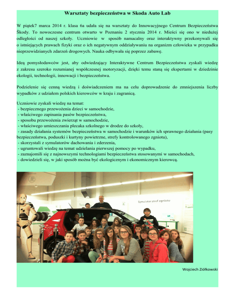 Warsztaty bezpieczeństwa w Skoda Auto Lab W piątek7 marca 2014 r. klasa 6a udała się na warsztaty do Innowacyjnego Centrum Bezpieczeństwa Škody. To nowoczesne centrum otwarto w Poznaniu 2 stycznia 2014 r. Mieści się ono w niedużej odległości od naszej szkoły. Uczniowie w sposób namacalny oraz interaktywny przekonywali się o istniejących prawach fizyki oraz o ich negatywnym oddziaływaniu na organizm człowieka w przypadku nieprzewidzianych zdarzeń drogowych. Nauka odbywała się poprzez zabawę. Ideą pomysłodawców jest, aby odwiedzający Interaktywne Centrum Bezpieczeństwa zyskali wiedzę z zakresu szeroko rozumianej współczesnej motoryzacji, dzięki temu staną się ekspertami w dziedzinie ekologii, technologii, innowacji i bezpieczeństwa. Podzielenie się cenną wiedzą i doświadczeniem ma na celu doprowadzenie do zmniejszenia liczby wypadków z udziałem polskich kierowców w kraju i zagranicą. Uczniowie zyskali wiedzę na temat: - bezpiecznego przewożenia dzieci w samochodzie, - właściwego zapinania pasów bezpieczeństwa, - sposobu przewożenia zwierząt w samochodzie, - właściwego umieszczania plecaka szkolnego w drodze do szkoły, - zasady działania systemów bezpieczeństwa w samochodzie i warunków ich sprawnego działania (pasy bezpieczeństwa, poduszki i kurtyny powietrzne, strefy kontrolowanego zgniotu), - skorzystali z symulatorów dachowania i zderzenia, - ugruntowali wiedzę na temat udzielania pierwszej pomocy po wypadku, - zaznajomili się z najnowszymi technologiami bezpieczeństwa stosowanymi w samochodach, - dowiedzieli się, w jaki sposób można być ekologicznym i ekonomicznym kierowcą. Wojciech Ziółkowski
