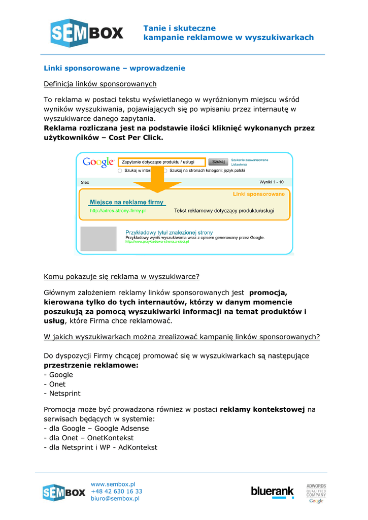 Tanie i skuteczne kampanie reklamowe w wyszukiwarkach Linki sponsorowane – wprowadzenie Definicja linków sponsorowanych To reklama w postaci tekstu wyświetlanego w wyróżnionym miejscu wśród wyników wyszukiwania, pojawiających się po wpisaniu przez internautę w wyszukiwarce danego zapytania. Reklama rozliczana jest na podstawie ilości kliknięć wykonanych przez użytkowników – Cost Per Click. Komu pokazuje się reklama w wyszukiwarce? Głównym założeniem reklamy linków sponsorowanych jest promocja, kierowana tylko do tych internautów, którzy w danym momencie poszukują za pomocą wyszukiwarki informacji na temat produktów i usług, które Firma chce reklamować. W jakich wyszukiwarkach można zrealizować kampanię linków sponsorowanych? Do dyspozycji Firmy chcącej promować się w wyszukiwarkach są następujące przestrzenie reklamowe: - Google - Onet - Netsprint Promocja może być prowadzona również w postaci reklamy kontekstowej na serwisach będących w systemie: - dla Google – Google Adsense - dla Onet – OnetKontekst - dla Netsprint i WP - AdKontekst www.sembox.pl +48 42 630 16 33 [email protected] Tanie i skuteczne kampanie reklamowe w wyszukiwarkach Z jakich elementów składa się reklama linków sponsorowanych? Reklama składa się z kilku elementów składowych: - Nagłówek - wyróżniony tytuł strony [zawierający maksymalnie 25 znaków] - Opis – tekst składający się z dwóch wierszy, mający na celu opis promowanego produktu / usługi [długość tekstu maksymalnie 35 znaków] - Adres strony – adres strony WWW, jaka zostanie wyświetlona użytkownikowi po kliknięciu w link [długość adresu maksymalnie 35 znaków] Nagłówek promujący produkt Miejsce opisu oferowanej usługi / produktu WWW.Adres_docelowy_produktu.pl Nagłówek informujący o promocji Miejsce opisu dla przygotowanej dla Klientów promocji WWW.Adres_docelowy_promocji.pl Dlaczego linki sponsorowane są skuteczną formą reklamy? 1. Linki sponsorowane są formą reklamy, którą można przygotować w ciągu 1-2 dni i uruchomić zgodnie z terminem startu promocji [w przeciwieństwie do wyników organicznych pozycjonowania strony, gdzie na wynik oczekuje się kilka miesięcy]. 2. Kontrola budżetu kampanii. Przy zakupie przestrzeni reklamowej w wyszukiwarce Firma płaci wyłącznie za kliknięcia (ang. Cost per Click), a nie za możliwość wyświetlania swojej reklamy w wynikach wyszukiwania. 3. Odpowiada na określone potrzeby użytkowników. Oznacza to, że reklama pojawi się wyłącznie tym osobom, które w oknie wyszukiwarki wpiszą odpowiednie zapytanie. 4. Elastyczne zarządzanie kampanią W zależności od przynoszonych efektów i potrzeb Firmy, kampania może być elastycznie modyfikowana, poprzez: - zmianę budżetu kampanii - dodanie kolejnych słów kluczowych - dodanie kolejnych, alternatywnych tekstów reklamowych - zmianę stron docelowych kampanii 5. Dostęp do statystyk kampanii Stały dostęp do statystyk np. Google Analytics umożliwia bieżącą analizę popularności kampanii, w tym danych słów kluczowych. Tym samym statystyki umożliwiają określenie konkurencyjności i potencjału słów kluczowych dla kampanii . Na podstawie zawartych w raportach informacji www.sembox.pl +48 42 630 16 33 [email protected] Tanie i skuteczne kampanie reklamowe w wyszukiwarkach określane jest również zainteresowanie użytkowników poszczególnymi formami reklam oraz produktami / usługami. www.sembox.pl +48 42 630 16 33 [email protected]