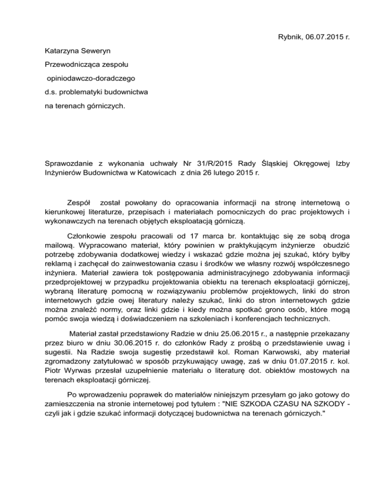 Rybnik, 06.07.2015 r. Katarzyna Seweryn Przewodnicząca zespołu opiniodawczo-doradczego d.s. problematyki budownictwa na terenach górniczych. Sprawozdanie z wykonania uchwały Nr 31/R/2015 Rady Śląskiej Okręgowej Izby Inżynierów Budownictwa w Katowicach z dnia 26 lutego 2015 r. Zespół został powołany do opracowania informacji na stronę internetową o kierunkowej literaturze, przepisach i materiałach pomocniczych do prac projektowych i wykonawczych na terenach objętych eksploatacją górniczą. Członkowie zespołu pracowali od 17 marca br. kontaktując się ze sobą droga mailową. Wypracowano materiał, który powinien w praktykującym inżynierze obudzić potrzebę zdobywania dodatkowej wiedzy i wskazać gdzie można jej szukać, który byłby reklamą i zachęcał do zainwestowania czasu i środków we własny rozwój współczesnego inżyniera. Materiał zawiera tok postępowania administracyjnego zdobywania informacji przedprojektowej w przypadku projektowania obiektu na terenach eksploatacji górniczej, wybraną literaturę pomocną w rozwiązywaniu problemów projektowych, linki do stron internetowych gdzie owej literatury należy szukać, linki do stron internetowych gdzie można znaleźć normy, oraz linki gdzie i kiedy można spotkać grono osób, które mogą pomóc swoja wiedzą i doświadczeniem na szkoleniach i konferencjach technicznych. Materiał zastał przedstawiony Radzie w dniu 25.06.2015 r., a następnie przekazany przez biuro w dniu 30.06.2015 r. do członków Rady z prośbą o przedstawienie uwag i sugestii. Na Radzie swoja sugestię przedstawił kol. Roman Karwowski, aby materiał zgromadzony zatytułować w sposób przykuwający uwagę, zaś w dniu 01.07.2015 r. kol. Piotr Wyrwas przesłał uzupełnienie materiału o literaturę dot. obiektów mostowych na terenach eksploatacji górniczej. Po wprowadzeniu poprawek do materiałów niniejszym przesyłam go jako gotowy do zamieszczenia na stronie internetowej pod tytułem : "NIE SZKODA CZASU NA SZKODY czyli jak i gdzie szukać informacji dotyczącej budownictwa na terenach górniczych." Na ostatnim slajdzie umieszczono prośbę o uwagi i sugestie dotyczące rozbudowania załączonego materiału na adres mailowy biura oraz mój imienny do dnia 30.10.2015 r. Jeśli w wyznaczonym terminie wpłyną uwagi i sugestie materiał zostanie skorygowany i przedstawiony do ponownego opublikowania na stronie internetowej ŚlOIIB do 15.12.2015 r. Powyższy termin jest zgodny z terminem wdrożenia informacji na stronę internetową zgodnie z punktem 3 Uchwały nr 15/P/2015 Prezydium Rady Śląskiej Okręgowej Izby Inżynierów Budownictwa w Katowicach z dnia 12 lutego 2015 r.: do końca 2015 r. Z poważaniem Katarzyna Seweryn