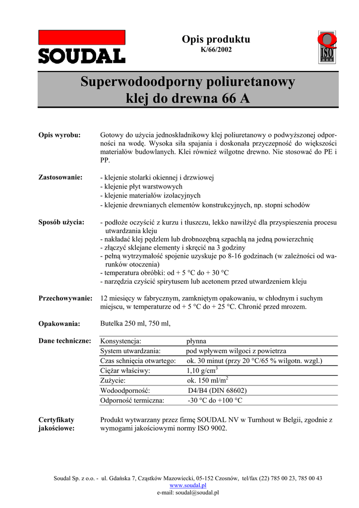 Opis produktu K/66/2002 Superwodoodporny poliuretanowy klej do drewna 66 A Opis wyrobu: Gotowy do użycia jednoskładnikowy klej poliuretanowy o podwyższonej odporności na wodę. Wysoka siła spajania i doskonała przyczepność do większości materiałów budowlanych. Klei również wilgotne drewno. Nie stosować do PE i PP. Zastosowanie: - klejenie stolarki okiennej i drzwiowej - klejenie płyt warstwowych - klejenie materiałów izolacyjnych - klejenie drewnianych elementów konstrukcyjnych, np. stopni schodów Sposób użycia: - podłoże oczyścić z kurzu i tłuszczu, lekko nawilżyć dla przyspieszenia procesu utwardzania kleju - nakładać klej pędzlem lub drobnozębną szpachlą na jedną powierzchnię - złączyć sklejane elementy i skręcić na 3 godziny - pełną wytrzymałość spojenie uzyskuje po 8-16 godzinach (w zależności od warunków otoczenia) - temperatura obróbki: od + 5 °C do + 30 °C - narzędzia czyścić spirytusem lub acetonem przed utwardzeniem kleju Przechowywanie: 12 miesięcy w fabrycznym, zamkniętym opakowaniu, w chłodnym i suchym miejscu, w temperaturze od + 5 °C do + 25 °C. Chronić przed mrozem. Opakowania: Butelka 250 ml, 750 ml, Dane techniczne: Konsystencja: System utwardzania: Czas schnięcia otwartego: Ciężar właściwy: Zużycie: Wodoodporność: Odporność termiczna: Certyfikaty jakościowe: Produkt wytwarzany przez firmę SOUDAL NV w Turnhout w Belgii, zgodnie z wymogami jakościowymi normy ISO 9002. płynna pod wpływem wilgoci z powietrza ok. 30 minut (przy 20 °C/65 % wilgotn. wzgl.) 1,10 g/cm3 ok. 150 ml/m2 D4/B4 (DIN 68602) -30 °C do +100 °C Soudal Sp. z o.o. - ul. Gdańska 7, Cząstków Mazowiecki, 05-152 Czosnów, tel/fax (22) 785 00 23, 785 00 43 www.soudal.pl e-mail: [email protected] Zalecenia BHP: Przy użyciu kleju 66A należy przestrzegać zwykłych zasad higieny pracy -nosić rękawice Uwaga: Wskazówki zawarte w tym dokumencie są wynikami naszych doświadczeń i praktyki. Ze względu na różnorodność materiałów i podłoży oraz wielorakość możliwych zastosowań, które pozostają poza naszą kontrolą, nie możemy przyjmować jakiejkolwiek odpowiedzialności za otrzymane rezultaty. We wszystkich przypadkach zaleca się przeprowadzenie próby. Soudal Sp. z o.o. - ul. Gdańska 7, Cząstków Mazowiecki, 05-152 Czosnów, tel/fax (22) 785 00 23, 785 00 43 www.soudal.pl e-mail: [email protected]