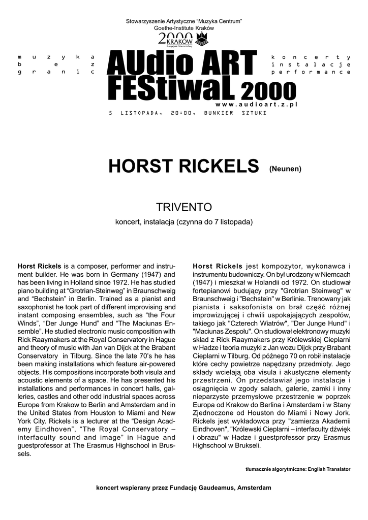 Stowarzyszenie Artystyczne Muzyka Centrum Goethe-Institute Kraków m b g u z r a e y k n i a z c AUdio ART FEStiwaL 2000 k o n c e r t y i n s t a l a c j e p e r f o r m a n c e www.audioart.z.pl 5 LISTOPADA, 20:00, BUNKIER SZTUKI HORST RICKELS (Neunen) TRIVENTO koncert, instalacja (czynna do 7 listopada) Horst Rickels is a composer, performer and instrument builder. He was born in Germany (1947) and has been living in Holland since 1972. He has studied piano building at Grotrian-Steinweg in Braunschweig and Bechstein in Berlin. Trained as a pianist and saxophonist he took part of different improvising and instant composing ensembles, such as the Four Winds, Der Junge Hund and The Maciunas Ensemble. He studied electronic music composition with Rick Raaymakers at the Royal Conservatory in Hague and theory of music with Jan van Dijck at the Brabant Conservatory in Tilburg. Since the late 70s he has been making installations which feature air-powered objects. His compositions incorporate both visula and acoustic elements of a space. He has presented his installations and performances in concert halls, galleries, castles and other odd industrial spaces across Europe from Krakow to Berlin and Amsterdam and in the United States from Houston to Miami and New York City. Rickels is a lecturer at the Design Academy Eindhoven, The Royal Conservatory interfaculty sound and image in Hague and guestprofessor at The Erasmus Highschool in Brussels. Horst Rickels jest kompozytor, wykonawca i instrumentu budowniczy. On by³ urodzony w Niemcach (1947) i mieszka³ w Holandii od 1972. On studiowa³ fortepianowi buduj¹cy przy "Grotrian Steinweg" w Braunschweig i "Bechstein" w Berlinie. Trenowany jak pianista i saksofonista on bra³ czêæ ró¿nej improwizuj¹cej i chwili uspokajaj¹cych zespo³ów, takiego jak "Czterech Wiatrów", "Der Junge Hund" i "Maciunas Zespo³u". On studiowa³ elektronowy muzyki sk³ad z Rick Raaymakers przy Królewskiej Cieplarni w Hadze i teoria muzyki z Jan wozu Dijck przy Brabant Cieplarni w Tilburg. Od pónego 70 on robi³ instalacje które cechy powietrze napêdzany przedmioty. Jego sk³ady wcielaj¹ oba visula i akustyczne elementy przestrzeni. On przedstawia³ jego instalacje i osi¹gniêcia w zgody salach, galerie, zamki i inny nieparzyste przemys³owe przestrzenie w poprzek Europa od Krakow do Berlina i Amsterdam i w Stany Zjednoczone od Houston do Miami i Nowy Jork. Rickels jest wyk³adowca przy "zamierza Akademii Eindhoven", "Królewski Cieplarni interfaculty dwiêk i obrazu" w Hadze i guestprofessor przy Erasmus Highschool w Brukseli. t³umacznie algorytmiczne: English Translator koncert wspierany przez Fundacjê Gaudeamus, Amsterdam The TRIVENTO is a new instrument designed with using organ pipes focusing on a variabel airpressure and spatial set up. The variabel airpressure increases the sounding possibilities of each organ pipe enormously: - low pressure enables the sounds of "prerunner" tones - high pressure enables separation of overtones - proces of "live of tone" can be demonstrated. The variabel pressure is realised by two different magazin-bellows. Additionally an "overdrive-pedal" can increase the pressure incidently. The pressure fot each tone is controlled by a 12 tone manual with oversized keys. How dieper a key is pressed how more wind the pipes will get. A special key-holder can fix key on a certain position to make layers possible. The organ pipes are installed in 6 columns forming a circle with a width of 12 m. So the spatial effect is "sorrounding". TRIVENTO jest nowy instrument zamierzany z u¿ywaniami organu rurami ogniskuj¹ce na variabel airpressure i przestrzenny zestaw w górze. Variabel airpressure powiêksza brzmi¹ce mo¿liwoci ka¿dej organu rury ogromnie: - niski cinienie umo¿liwia dwiêkom "prerunner" tonów - wysoki cinienie umo¿liwia rozdzielenie implikacja - proces "¿yje ton" mo¿e byæ demonstrowany . Variabel cinienie jest realizowany przez dwa ró¿ne magazin miechów. Dodatkowo "nadbieg no¿ne" mo¿e powiêkszaæ cinienie padaj¹co. Cinienia fot ka¿dy ton jest kontrolowany przez 12 ton podrêcznik z oversized kluczami. Jak dieper klucz jest prasowany jak wiêcej wiatr rury bêd¹ dostawaæ siê. Specjalny klucz posiadacz mo¿e ustalaæ klucz na pewnym pozycji robiæ warstwom mo¿liwe. Organ rury s¹ instalowane w 6 kolumnach kszta³tuj¹ce ko³o z szerokoci¹ 12 m. Tak przestrzenny skutek jest "sorrounding". Concept and idea: Horst Rickels Design and realisation: Pels & van Leeuwen Organbuilders, Den Bosch Pojêcie i idea: zrêbu Rickels Zamierzaj i realizacjê: Pels & wozu Leeuwen Organbuilders, Nory Bosch t³umaczenie algorytmiczne: English Translator