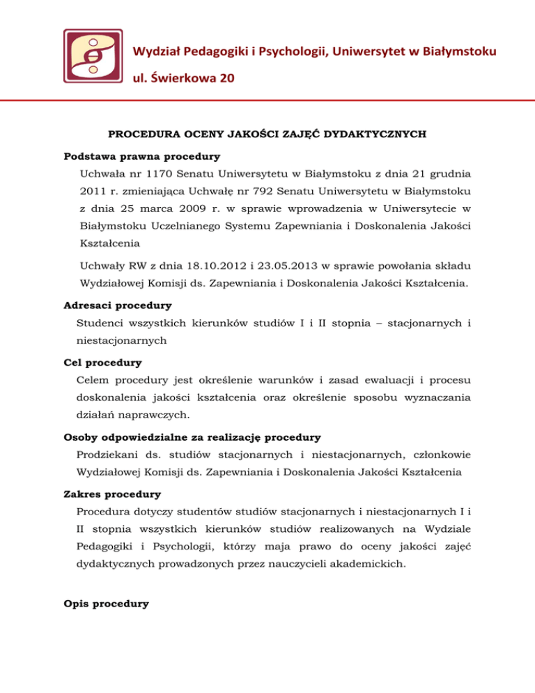 Wydział Pedagogiki i Psychologii, Uniwersytet w Białymstoku ul. Świerkowa 20 PROCEDURA OCENY JAKOŚCI ZAJĘĆ DYDAKTYCZNYCH Podstawa prawna procedury Uchwała nr 1170 Senatu Uniwersytetu w Białymstoku z dnia 21 grudnia 2011 r. zmieniająca Uchwałę nr 792 Senatu Uniwersytetu w Białymstoku z dnia 25 marca 2009 r. w sprawie wprowadzenia w Uniwersytecie w Białymstoku Uczelnianego Systemu Zapewniania i Doskonalenia Jakości Kształcenia Uchwały RW z dnia 18.10.2012 i 23.05.2013 w sprawie powołania składu Wydziałowej Komisji ds. Zapewniania i Doskonalenia Jakości Kształcenia. Adresaci procedury Studenci wszystkich kierunków studiów I i II stopnia – stacjonarnych i niestacjonarnych Cel procedury Celem procedury jest określenie warunków i zasad ewaluacji i procesu doskonalenia jakości kształcenia oraz określenie sposobu wyznaczania działań naprawczych. Osoby odpowiedzialne za realizację procedury Prodziekani ds. studiów stacjonarnych i niestacjonarnych, członkowie Wydziałowej Komisji ds. Zapewniania i Doskonalenia Jakości Kształcenia Zakres procedury Procedura dotyczy studentów studiów stacjonarnych i niestacjonarnych I i II stopnia wszystkich kierunków studiów realizowanych na Wydziale Pedagogiki i Psychologii, którzy maja prawo do oceny jakości zajęć dydaktycznych prowadzonych przez nauczycieli akademickich. Opis procedury 1. Ankietowanie, dotyczy wszystkich zajęć dydaktycznych uwzględnionych w planach i programach studiów. Powinno być przeprowadzane na studiach I i II stopnia, po zakończeniu realizacji zajęć dydaktycznych. 2. Kwestionariusz „Ankiety oceny jakości zajęć dydaktycznych” stosowany na Wydziale Pedagogiki i Psychologii obejmuje analogiczne treści, jak na innych Wydziałach UwB. Ankieta jest dostępna w formie elektronicznej dla każdego studenta w USOS Web. 3. Student ocenia zajęcia, w których uczestniczył w danym roku akademickim. W ocenie brane pod uwagę są następujące kryteria: o przygotowanie prowadzącego do zajęć (skala ocen od 0 do 6 gdzie 0 oznacza brak przygotowania, a 6 rzetelne przygotowanie się do zajęć); o umiejętność zainteresowania studentów przedmiotem (skala ocen od 0 do 6 gdzie 0 oznacza prowadzenie zajęć w sposób mało interesujący, a 6 interesujący); o innowacyjność w prowadzeniu zajęć (skala ocen od 0 do 6 gdzie 0 oznacza zajęcia prowadzone rutynowo, a 6 różnicowanie sposobu prowadzenia zajęć: różne metody, materiały, pomoce); o komunikatywność prowadzącego (skala ocen od 0 do 6 gdzie 0 oznacza prowadzenie zajęć w sposób niekomunikatywny, a 6 komunikatywny); o stosunek do studenta (skala ocen od 0 do 6 gdzie 0 oznacza nastawienie nieprzyjazne, a 6 przyjazne); o sposób oceny stosowany przez prowadzącego (skala ocen od 0 do 6 gdzie 0 oznacza ocenianie niesprawiedliwe, a 6 rzetelne). 4. Ankiety oceny jakości zajęć dydaktycznych są anonimowe. Studenci pod koniec roku akademickiego są zachęcani do ich wypełniania. W celu zwiększenia motywacji do brania udziału w ankietowaniu Rada Wydziału podjęła decyzję o corocznym przyznawaniu Kart VIP-Student dla wylosowanych 20 studentów (łącznie na studiach stacjonarnych i niestacjonarnych) spośród tych, którzy złożyli oświadczenie o wypełnieniu w systemie USOS Web co najmniej 50% ankiet (Uchwała RW nr 54 z dn. 20.06.2013). Karta VIP-Student daje studentowi kilka profitów. 5. Zasady opracowania danych z ankiet określa dziekan. Wgląd do wyników ankiet ma wyłącznie dziekan oraz osoby przez niego upoważnione. 6. Dziekan udostępnia prowadzącemu zajęcia wyniki badania (za pośrednictwem systemu USOS Web) i w odpowiednim czasie przekazuje informację o ocenie do wiadomości Wydziałowej Komisji Oceniającej. 7. Kwestionariusz „Ankiety ewaluacyjnej” obowiązujący na Wydziale Pedagogiki i Psychologii obejmuje analogiczne treści, jak na innych Wydziałach UwB. Ankieta jest dostępna do pobrania w zakładce „Strefa studenta” na stronie internetowej Wydziału Pedagogiki i Psychologii (zał. nr 3 do Uchwały 1170 Senatu UwB z dn. 21.12.2011). 8. Ankietę wypełniają studenci wszystkich kierunków studiów I i II stopnia studiów stacjonarnych i niestacjonarnych, po zakończeniu realizacji zajęć dydaktycznych. 9. Kwestionariusz „Ankiety absolwenta” wypełniają studenci, którzy uzyskali absolutorium, ankietę anonimową składają w dniu obrony pracy dyplomowej. 10. Kwestionariusz „Ankiety absolwenta” jest do pobrania w zakładce „Strefa studenta” na stronie internetowej Wydziału Pedagogiki i Psychologii. 11. Badanie ankietowe przeprowadza Zespół ds. Zapewniania i Doskonalenia Jakości Kształcenia powołany przez Radę Wydziału Pedagogiki i Psychologii (Uchwała RW z dn. 18.10.2012 i 23.05.2013). 12. Badanie przeprowadza się w formie papierowej lub drogą elektroniczną, pod koniec roku akademickiego. Formę ankietowania w danym roku akademickim określa przewodniczący Komisji ds. Zapewniania i Doskonalenia Jakości Kształcenia. 13. Zbiorcze wyniki ankiet przedstawia się corocznie w Sprawozdaniu z wydziałowego systemu zapewniania i doskonalenia jakości kształcenia, publikowanym na stronie Psychologii do 15 października. Internetowej Wydziału Pedagogiki i