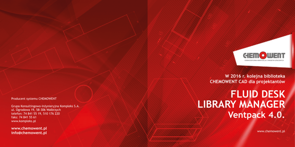 W 2016 r. kolejna biblioteka CHEMOWENT CAD dla projektantów Producent systemu CHEMOWENT Grupa Konsultingowo-Inżynieryjna Kompleks S.A. ul. Ogrodowa 19, 58-306 Wałbrzych telefon: 74 841 55 19, 510 176 220 faks: 74 841 55 61 www.kompleks.pl www.chemowent.pl [email protected] FLUID DESK LIBRARY MANAGER Ventpack 4.0. www.chemowent.pl Biblioteka CHEMOWENT CAD w oprogramowaniu FLUID DESK • FLUID DESK LIBRARY MANAGER umożliwia konfigurację komponentów systemu CHEMOWENT oraz ich modyfikację w trakcie procesu projektowania systemów wentylacyjnych przy użyciu Ventpack 4.0. • Ventpack 4.0 umożliwia tworzenie pełnych obliczeń hydraulicznych oraz zestawień materiałowych, które zapisywane są w formie xml i xls. • Ventpack 4.0 współpracuje z oprogramowaniem AutoCAD oraz coraz bardziej popularną platformą BricsCAD. Szereg automatycznych i ergonomicznych funkcji wspomagających rysowanie oraz tworzenie widoków krawędziowych i płaszczyznowych oraz płynne przechodzenie pomiędzy widokami 2D i 3D zapewniają, że projektowanie rozwiązań systemowych oferowanych przez GKI KOMPLEKS z wykorzystaniem programów FLUID DESK jest proste i szybkie. • Dzięki wykorzystaniu serwisu internetowego Partshelf24.com możliwe jest szybkie skonfigurowanie komponentów oferowanych przez firmę GKI KOMPLEKS i przesłanie zapytania umożliwiając szybką wycenę.