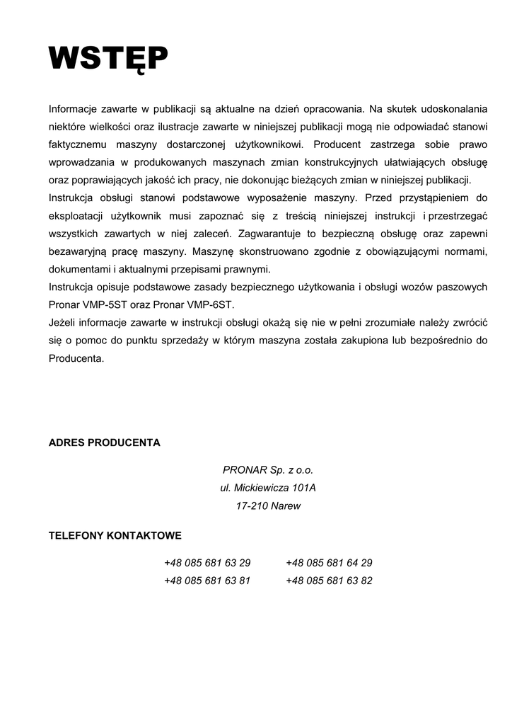 WSTĘP Informacje zawarte w publikacji są aktualne na dzień opracowania. Na skutek udoskonalania niektóre wielkości oraz ilustracje zawarte w niniejszej publikacji mogą nie odpowiadać stanowi faktycznemu maszyny dostarczonej użytkownikowi. Producent zastrzega sobie prawo wprowadzania w produkowanych maszynach zmian konstrukcyjnych ułatwiających obsługę oraz poprawiających jakość ich pracy, nie dokonując bieżących zmian w niniejszej publikacji. Instrukcja obsługi stanowi podstawowe wyposażenie maszyny. Przed przystąpieniem do eksploatacji użytkownik musi zapoznać się z treścią niniejszej instrukcji i przestrzegać wszystkich zawartych w niej zaleceń. Zagwarantuje to bezpieczną obsługę oraz zapewni bezawaryjną pracę maszyny. Maszynę skonstruowano zgodnie z obowiązującymi normami, dokumentami i aktualnymi przepisami prawnymi. Instrukcja opisuje podstawowe zasady bezpiecznego użytkowania i obsługi wozów paszowych Pronar VMP-5ST oraz Pronar VMP-6ST. Jeżeli informacje zawarte w instrukcji obsługi okażą się nie w pełni zrozumiałe należy zwrócić się o pomoc do punktu sprzedaży w którym maszyna została zakupiona lub bezpośrednio do Producenta. ADRES PRODUCENTA PRONAR Sp. z o.o. ul. Mickiewicza 101A 17-210 Narew TELEFONY KONTAKTOWE +48 085 681 63 29 +48 085 681 64 29 +48 085 681 63 81 +48 085 681 63 82 SYMBOLE WYKORZYSTANE W INSTRUKCJI Informacje, opisy zagrożeń i środków ostrożności oraz polecenia i nakazy związane z bezpieczeństwem użytkowania w treści instrukcji są wyróżnione znakiem: oraz poprzedzone słowem „NIEBEZPIECZEŃSTWO”. Nieprzestrzeganie opisanych zaleceń stwarza zagrożenie dla zdrowia lub życia osób obsługujących maszynę lub osób postronnych. Szczególnie ważne informacje i zalecenia, których przestrzeganie jest bezwzględnie konieczne, są wyróżnione w tekście znakiem: oraz poprzedzone słowem „UWAGA". Nieprzestrzeganie opisanych zaleceń zagraża uszkodzeniu maszyny wskutek nieprawidłowego wykonania obsługi, regulacji lub użytkowania. W celu zwrócenia uwagi użytkownika na konieczność wykonania okresowej obsługi technicznej treść w instrukcji została wyróżniona znakiem: Dodatkowe wskazówki zawarte w instrukcji opisują przydatne informacje dotyczące obsługi maszyny i wyróżnione są znakiem: oraz poprzedzone słowem „WSKAZÓWKA”. OKREŚLENIE KIERUNKÓW W INSTRUKCJI Strona lewa – strona po lewej ręce obserwatora zwróconego twarzą w kierunku jazdy maszyny do przodu. Strona prawa – strona po prawej ręce obserwatora zwróconego twarzą w kierunku jazdy maszyny do przodu. ZAKRES CZYNNOŚCI OBSŁUGOWYCH Czynności obsługowe opisywane w instrukcji oznaczone są znakiem: Rezultat wykonania czynności obsługowej / regulacyjnej lub uwagi dotyczące wykonanych czynności oznaczony jest znakiem: SPIS TREŚCI 1 INFORMACJE PODSTAWOWE 1.1 1.1 IDENTYFIKACJA 1.2 1.1.1 IDENTYFIKACJA WOZU PASZOWEGO 1.2 1.1.2 IDENTYFIKACJA OSI JEZDNEJ 1.3 1.1.3 WYKAZ NUMERÓW SERYJNYCH 1.4 1.2 PRZEZNACZENIE 1.5 1.3 WYPOSAŻENIE 1.8 1.4 WARUNKI GWARANCJI 1.8 1.5 TRANSPORT 1.10 1.5.1 TRANSPORT SAMOCHODOWY 1.10 1.5.2 TRANSPORT SAMODZIELNY UŻYTKOWNIKA 1.12 1.6 ZAGROŻENIE DLA ŚRODOWISKA 1.12 1.7 KASACJA 1.13 2 BEZPIECZEŃSTWO UŻYTKOWANIA 2.1 2.2 2.1 OGÓLNE ZASADY BEZPIECZEŃSTWA 2.2 2.1.1 PODSTAWOWE ZASADY BEZPIECZEŃSTWA 2.2 2.1.2 PODŁĄCZANIE I ODŁĄCZANIE OD CIĄGNIKA 2.3 2.1.3 ZAŁADUNEK WOZU PASZOWEGO I MIESZANIE PASZY 2.4 2.1.4 INSTALACJA HYDRAULICZNA 2.5 2.1.5 PRACA Z WAŁEM PRZEGUBOWO TELESKOPOWYM 2.6 2.1.6 CZYSZCZENIE, KONSERWACJA I REGULACJA 2.7 2.1.7 ZASADY BEZPIECZNEJ JAZDY 2.11 2.1.8 OGUMIENIE 2.12 2.1.9 OPIS RYZYKA SZCZĄTKOWEGO 2.13 NAKLEJKI INFORMACYJNE I OSTRZEGAWCZE 2.14 3 BUDOWA I ZASADA DZIAŁANIA 3.1 3.1 CHARAKTERYSTYKA TECHNICZNA 3.2 3.2 BUDOWA WOZU PASZOWEGO 3.3 3.2.1 PODWOZIE 3.3 3.2.2 ZBIORNIK 3.3 3.2.3 UKŁAD PRZENIESIENIA NAPĘDU 3.7 3.2.4 INSTALACJA HYDRAULICZNA ZASUW 3.7 3.2.5 INSTALACJA SMAROWANIA PRZEKŁADNI 3.9 3.2.6 UKŁAD WAŻENIA 3.10 4 ZASADY UŻYTKOWANIA 4.1 4.1 PRZYGOTOWANIE WOZU PASZOWEGO DO PRACY 4.2 4.1.1 INFORMACJE WSTĘPNE 4.2 4.1.2 PRZEKAZANIE I KONTROLA MASZYNY PO DOSTAWIE 4.2 4.1.3 PRZYGOTOWANIE DO PIERWSZEGO URUCHOMIENIA, ROZRUCH PRÓBNY WOZU PASZOWEGO 4.3 4.1.4 PRZYGOTOWANIE WOZU PASZOWEGO DO CODZIENNEJ PRACY 4.4 4.2 ŁĄCZENIE I ODŁĄCZANIE WOZU PASZOWEGO 4.5 4.3 NAPEŁNIANIE ZBIORNIKA I TWORZENIE PASZY 4.8 4.4 ANALIZA MIESZANKI PASZOWEJ 4.11 4.5 KARMIENIE 4.12 4.6 REGULACJA PRZECIWNOŻY 4.13 4.7 CZYSZCZENIE 4.15 4.8 ZASADY UŻYTKOWANIA OGUMIENIA 4.15 5 OBSŁUGA TECHNICZNA 5.1 5.1 INFORMACJE WSTĘPNE 5.2 5.2 OBSŁUGA OSI JEZDNEJ 5.2 5.2.1 INFORMACJE WSTĘPNE 5.2 5.2.2 KONTROLA LUZU ŁOŻYSK OSI JEZDNYCH 5.3 5.2.3 REGULACJA LUZU ŁOŻYSK OSI JEZDNYCH 5.5 5.2.4 MONTAŻ I DEMONTAŻ KOŁA, KONTROLA DOKRĘCENIA NAKRĘTEK 5.6 5.2.5 KONTROLA CIŚNIENIA POWIETRZA, OCENA STANU TECHNICZNEGO OGUMIENIA I FELG STALOWYCH 5.8 OBSŁUGA INSTALACJI HYDRAULICZNEJ 5.9 5.3.1 INFORMACJE WSTĘPNE 5.9 5.3.2 KONTROLA SZCZELNOŚCI INSTALACJI HYDRAULICZNEJ 5.10 5.3.3 KONTROLA STANU TECHNICZNEGO WTYKÓW I GNIAZD HYDRAULICZNYCH 5.11 5.3.4 WYMIANA PRZEWODÓW HYDRAULICZNYCH 5.11 5.4 SMAROWANIE WOZU PASZOWEGO 5.11 5.5 MATERIAŁY EKSPLOATACYJNE 5.14 5.5.1 OLEJ HYDRAULICZNY 5.14 5.5.2 ŚRODKI SMARNE 5.15 5.6 OBSŁUGA TECHNICZNA PRZEKŁADNI 5.16 5.7 DEMONTAŻ I MONTAŻ NOŻY TNĄCYCH 5.18 5.8 OSTRZENIE NOŻY TNĄCYCH 5.20 5.9 WCHODZENIE DO ZBIORNIKA 5.22 5.10 CZYSZCZENIE WOZU PASZOWEGO 5.23 5.11 PRZECHOWYWANIE 5.25 5.12 MOMENTY DOKRĘCANIA POŁĄCZEŃ ŚRUBOWYCH 5.25 5.13 ROZWIĄZYWANIE PROBLEMÓW 5.27 5.3 ROZDZIAŁ 1 INFORMACJE PODSTAWOWE Pronar VMP-5ST | Pronar VMP6-ST ROZDZIAŁ 1 1.1 IDENTYFIKACJA 1.1.1 IDENTYFIKACJA WOZU PASZOWEGO RYSUNEK 1.1 Miejsce umieszczenia tabliczki znamionowej seryjnego (1) tabliczka znamionowa, (2) przykładowy numer seryjny 1.2 i wybicia numeru ROZDZIAŁ 1 Pronar VMP-5ST | Pronar VMP6-ST Wozy paszowe Pronar VMP-5ST oraz VMP-6ST oznakowane zostały przy pomoc