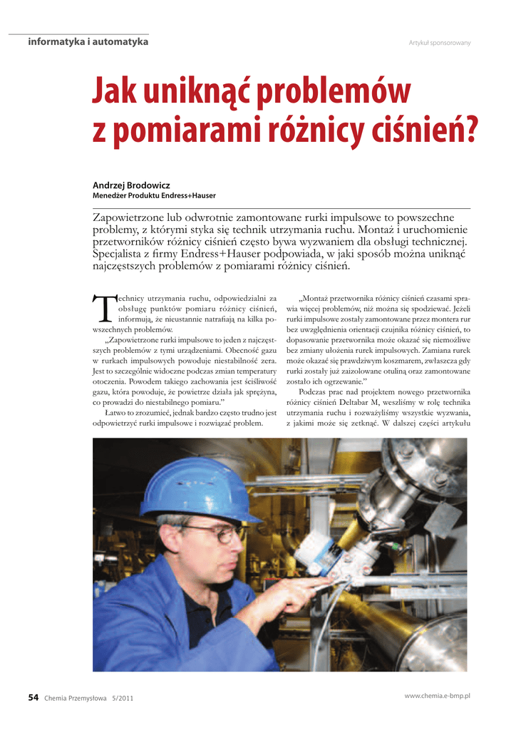informatyka i automatyka Artykuł sponsorowany Jak uniknąć problemów z pomiarami różnicy ciśnień? Andrzej Brodowicz Menedżer Produktu Endress+Hauser Zapowietrzone lub odwrotnie zamontowane rurki impulsowe to powszechne problemy, z którymi styka się technik utrzymania ruchu. Montaż i uruchomienie przetworników różnicy ciśnień często bywa wyzwaniem dla obsługi technicznej. Specjalista z firmy Endress+Hauser podpowiada, w jaki sposób można uniknąć najczęstszych problemów z pomiarami różnicy ciśnień. T echnicy utrzymania ruchu, odpowiedzialni za obsługę punktów pomiaru różnicy ciśnień, informują, że nieustannie natrafiają na kilka powszechnych problemów. „Zapowietrzone rurki impulsowe to jeden z najczęstszych problemów z tymi urządzeniami. Obecność gazu w rurkach impulsowych powoduje niestabilność zera. Jest to szczególnie widoczne podczas zmian temperatury otoczenia. Powodem takiego zachowania jest ściśliwość gazu, która powoduje, że powietrze działa jak sprężyna, co prowadzi do niestabilnego pomiaru.” Łatwo to zrozumieć, jednak bardzo często trudno jest odpowietrzyć rurki impulsowe i rozwiązać problem. 54 Chemia Przemysłowa 5/2011 „Montaż przetwornika różnicy ciśnień czasami sprawia więcej problemów, niż można się spodziewać. Jeżeli rurki impulsowe zostały zamontowane przez montera rur bez uwzględnienia orientacji czujnika różnicy ciśnień, to dopasowanie przetwornika może okazać się niemożliwe bez zmiany ułożenia rurek impulsowych. Zamiana rurek może okazać się prawdziwym koszmarem, zwłaszcza gdy rurki zostały już zaizolowane otuliną oraz zamontowane zostało ich ogrzewanie.” Podczas prac nad projektem nowego przetwornika różnicy ciśnień Deltabar M, weszliśmy w rolę technika utrzymania ruchu i rozważyliśmy wszystkie wyzwania, z jakimi może się zetknąć. W dalszej części artykułu www.chemia.e-bmp.pl informatyka i automatyka przedstawimy najczęstsze problemy z pomiarami różnicy ciśnień oraz kilka rad, jak ich uniknąć, stosując przetwornik różnicy ciśnień Deltabar M. Zawory odpowietrzające pozwalające na szybkie usunięcie pęcherzyków powietrza Niestabilny pomiar zwykle spowodowany jest obecnością pęcherzyków powietrza w instalacji. Pęcherzyki powinny być usunięte za pomocą zaworów odpowietrzających na kołnierzach bocznych przetwornika. W przypadku starszych przetworników różnicy ciśnień, podczas obsługi zaworów odpowietrzających okazywało się, że nie sprawdzają się we wszystkich pozycjach montażowych i sprawiają trudności w usunięciu powietrza z układu. Dziś, dzięki Deltabar M, niezależnie od pozycji montażowej przetwornika (pionowe lub poziome rurki impulsowe) dostępny jest odpowiedni układ odpowietrzający. Jeden lub dwa zawory odpowietrzające pozwalają w łatwy sposób usunąć powietrze z rurek impulsowych i przetwornika. Wskazówka: Ten system pozwala również na usunięcie kondensatu z rurek impulsowych wypełnionych powietrzem lub gazem. Wydajna kalibracja Po zamontowaniu przetwornika na zbiorniku należy sprawdzić jego kalibrację. Jeżeli zbiornik jest już użytkowany, należy poczekać do czasu, aż będzie pełny, aby wykonać kalibrację na mokro. Obecnie, dzięki Deltabar M, jeżeli zbiornik posiada liniową charakterystykę nie trzeba czekać do czasu jego napełnienia. Można wykonać kalibrację nawet podczas procesu produkcji, na mokro, nawet przy częściowo wypełnionym zbiorniku, np. 20% i 25%. Dla zbiorników o innych kształtach można wykonać linearyzację zbiornika bezpośrednio w przetworniku różnicy ciśnień Deltabar M. Łatwa zamiana stron wysokiego i niskiego ciśnienia Przychodząc na miejsce instalacji przetwornika różnicy ciśnień w celu montażu i uruchomienia urządzenia może okazać się, że rurki impulsowe zostały źle podłączone. Strona wysokiego ciśnienia (+) przetwornika została połączona z rurką impulsową niskiego ciśnienia i odwrotnie – stronę niskiego ciśnienia (-) połączono z rurką wysokiego ciśnienia. W przeszłości jedynym rozwiązaniem było tu odłączenie i ponowny montaż rurek impulsowych – to był koszmar, szczególnie gdy rurki zostały już zaizolowane i zamontowane zostało ich ogrzewanie. Dziś, dzięki Deltabar M, nie potrzeba żadnych prac mechanicznych. Wkładka elektroniki wyposażona jest w mikroprzełącznik, który pozwala na łatwą zamianę stron wysokiego i niskiego ciśnienia w przetworniku. Zamiana stron wysokiego i niskiego ciśnienia możliwa jest również za pomocą oprogramowania (obsługiwanego przez wyświetlacz z przyciskami, komunikator ręczny lub zdalnie przez protokół komunikacyjny HART). www.chemia.e-bmp.pl Szybkie sprawdzenie pętli pomiarowej dzięki pinom testowym oraz symulacji wyjścia 4...20 mA Klasyczna sytuacja – należy sprawdzić, czy przetwornik różnicy ciśnień jest prawidłowo podłączony w pętli prądowej 4...20 mA do sterownika PLC lub systemu DCS oraz czy kalibracja toru pomiarowego jest prawidłowa. Zwykle w pierwszej kolejności należy sprawdzić podłączenie przewodów, a następnie, czy skalowanie sygnału w systemie zostało poprawnie skonfigurowane. Stosując Deltabar M można sprawdzić wyjście prądowe 4...20 mA przetwornika bez rozłączania pętli pomiarowej dzięki pinom testowym na wkładce elektroniki. Ponadto wyjście prądowe przetwornika można przełączyć w tryb symulacji, co pozwala w łatwy sposób sprawdzić przewody oraz ich podłączenie, jak również sprawdzić wejście przetwornika PLC lub systemu DCS. Chemia Przemysłowa 5/2011 55 informatyka i automatyka Optymalizacja kosztów utrzymania punktu pomiarowego Deltabar M na problemy z pomiarami różnicy ciśnień W celu uproszczenia zarządzania częściami zamiennymi, jeden z naszych klientów zdecydował się na zastosowanie przetwornika różnicy ciśnień również do pomiarów ciśnienia względnego i absolu
