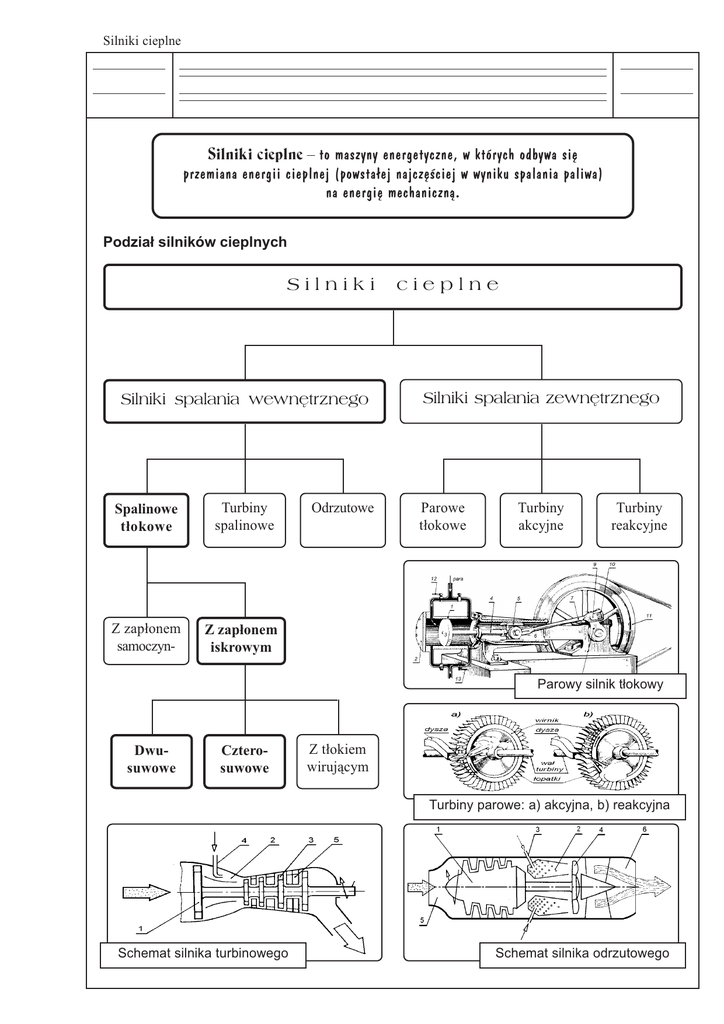 Silniki cieplne Silniki cieplne  to maszyny energetyczne, w których odbywa siê przemiana energii cieplnej (powsta³ej najczêciej w wyniku spalania paliwa) na energiê mechaniczn¹. Podzia³ silników cieplnych Silniki Silniki spalania wewnêtrznego Spalinowe t³okowe Turbiny spalinowe Z zap³onem samoczyn- Z zap³onem iskrowym Odrzutowe cieplne Silniki spalania zewnêtrznego Parowe t³okowe Turbiny akcyjne Turbiny reakcyjne Parowy silnik t³okowy Dwusuwowe Czterosuwowe Z t³okiem wiruj¹cym Turbiny parowe: a) akcyjna, b) reakcyjna Schemat silnika turbinowego Schemat silnika odrzutowego T³okowe silniki spalinowe Budowa t³okowych silników spalinowych Zasadniczym zespo³em konstrukcyjnym t³okowych silników spalinowych jest zamkniêta z jednej strony cylindryczna komora i znajduj¹cy siê w tej komorze walec (t³ok). Zamkniêta czêæ cylindra jest to komora spalania, poniewa¿ tam w³anie nastêpuje zapalenie siê mieszanki paliwowo-powietrznej. Powsta³e przy tym cinienie gazów spalinowych dzia³a na powierzchniê denka t³oka, który pod wp³ywem tego cinienia przesuwa siê, a zwi¹zany z t³okiem mechanizm korbowy zamienia ruch postêpowy t³oka na ruch obrotowy wa³u korbowego. W celu unikniêcia zjawiska przedostawania siê spalin na drug¹ stronê t³oka, jego cianki s¹ uszczelniane w miejscu styku z powierzchni¹ cylindra za pomoc¹ sprê¿ystych metalowych piercieni uszczelniaj¹cych. Budowa t³okowego silnika spalinowego: 1 - cylinder, 2 - t³ok, 3 - komora cylindra, 4 - korbowód, 5 - korba, 6 - wa³ korbowy, 7 - piercienie uszczelniaj¹ce > Zasada dzia³ania t³okowych silników spalinowych p cinienie patm. Poj. kom. sprê¿ania > < < Pojemnoæ skokowa Pojemnoæ cylindra > W - ........................................................ ................................................................ D - ......................................................... ................................................................. ................................................................ S - .......................................................... ................................................................. Z - ......................................................... ................................................................. 1 - .......................................................... 2 - .......................................................... 3 - .......................................................... 4 - .......................................................... 5 - .......................................................... V > objêtoæ > Pole ograniczone liniami wykresu (pole zakreskowane) odpowiada iloci energii wytworzonej przez silnik podczas jednego cyklu pracy. Im wiêksze jest to pole, tym wiêksza jest sprawnoæ silnika. Silniki czterosuwowe Cykl pracy silnika czterosuwowego: a) suw ssania (dolotu), b) suw sprê¿ania, c) suw roboczy (pracy), d) suw wydechu (wylotu) Silnik czterosuwowy zaopatrzony jest w zawory steruj¹ce nape³nianiem mieszank¹ i wydalaniem spalin. Podczas ruchu t³oka w dó³ otwarty jest zawór dolotowy przez który do silnika dop³ywa mieszanka z przewodu dolotowego. Iloæ zassanej mieszanki, decyduj¹ca o iloci energii mechanicznej wydzielonej podczas jednego cyklu pracy przez silnik, zale¿y od pojemnoci skokowej silnika. Po nape³nieniu cylindra zawór zamyka siê, a ruch t³oka w górê powoduje sprê¿anie mieszanki, po zapaleniu której gor¹ce gazy przesuwaj¹ t³ok w dó³. Podczas tych suwów obydwa zawory s¹ zamkniête. Dopiero podczas ponownego ruchu t³oka w górê otwiera siê zawór wylotowy, umo¿liwiaj¹c wyp³yniêcie spalin przez kana³ wylotowy. Czas trwania kolejnych etapów pracy silnika czterosuwowego GZP O DZP GZP - .............................................................. ................................................................ DZP - .............................................................. ................................................................ 1 - ............................................................... ................................................................ 2 - ............................................................... ................................................................ Z - ............................................................... 3 - ............................................................... ................................................................ 4 - ............................................................... ................................................................ 1-2 - ............................................................... 2-Z - ............................................................... Z-3 - ............................................................... 3-4 - ............................................................... Póniejsze zamkniêcie zaworu wylotowego przy otwartym ju¿ zaworze dolotowym ma tê zaletê, ¿e spaliny - opuszczaj¹ce cylinder zawsze z du¿¹ prêdkoci¹ - mog¹ wskutek swej bezw³adnoci uchodziæ jeszcze na pocz¹tku suwu ssania, wytwarzaj¹c w cylindrze pewne podcinienie, co umo¿liwia lepsze zassanie wie¿ej mieszanki i przep³ukanie komory spalania. W czasie czterech suwów jednego cyklu pracy wa³ korbowy wykonuje dwa pe³ne obroty, z których tylko trzecie pó³ obrotu (trzeci suw) jest robocze. Silniki dwusuwowe Cykl pracy silnika dwusuwowego: a) pocz¹tek suwu sprê¿ania (p³ukanie cylindra), b) koniec suwu sprê¿ania (sprê¿anie), c) pocz¹tek suwu roboczego (rozprê¿anie), d) koniec suwu roboczego (wyp³yw spalin) W czasie pierwszego suwu, podczas którego t³ok przesuwa siê w górê, nastêpuje sprê¿anie mieszanki paliwowo-powietrznej zgromadzonej w górnej czêci cylindra, a równoczenie zassanie mieszanki kana³em dolotowym do skrzyni korbowej. Po dojciu t³oka w pobli¿e górnego martwego punktu nastêpuje przeskok iskry miêdzy elektr