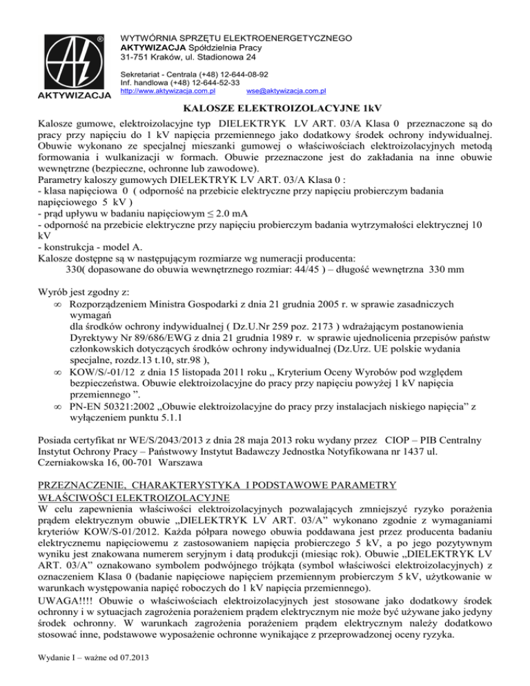 WYTWÓRNIA SPRZĘTU ELEKTROENERGETYCZNEGO AKTYWIZACJA Spółdzielnia Pracy 31-751 Kraków, ul. Stadionowa 24 Sekretariat - Centrala (+48) 12-644-08-92 Inf. handlowa (+48) 12-644-52-33 http://www.aktywizacja.com.pl [email protected] KALOSZE ELEKTROIZOLACYJNE 1kV Kalosze gumowe, elektroizolacyjne typ DIELEKTRYK LV ART. 03/A Klasa 0 przeznaczone są do pracy przy napięciu do 1 kV napięcia przemiennego jako dodatkowy środek ochrony indywidualnej. Obuwie wykonano ze specjalnej mieszanki gumowej o właściwościach elektroizolacyjnych metodą formowania i wulkanizacji w formach. Obuwie przeznaczone jest do zakładania na inne obuwie wewnętrzne (bezpieczne, ochronne lub zawodowe). Parametry kaloszy gumowych DIELEKTRYK LV ART. 03/A Klasa 0 : - klasa napięciowa 0 ( odporność na przebicie elektryczne przy napięciu probierczym badania napięciowego 5 kV ) - prąd upływu w badaniu napięciowym ≤ 2.0 mA - odporność na przebicie elektryczne przy napięciu probierczym badania wytrzymałości elektrycznej 10 kV - konstrukcja - model A. Kalosze dostępne są w następującym rozmiarze wg numeracji producenta: 330( dopasowane do obuwia wewnętrznego rozmiar: 44/45 ) – długość wewnętrzna 330 mm Wyrób jest zgodny z: • Rozporządzeniem Ministra Gospodarki z dnia 21 grudnia 2005 r. w sprawie zasadniczych wymagań dla środków ochrony indywidualnej ( Dz.U.Nr 259 poz. 2173 ) wdrażającym postanowienia Dyrektywy Nr 89/686/EWG z dnia 21 grudnia 1989 r. w sprawie ujednolicenia przepisów państw członkowskich dotyczących środków ochrony indywidualnej (Dz.Urz. UE polskie wydania specjalne, rozdz.13 t.10, str.98 ), • KOW/S/-01/12 z dnia 15 listopada 2011 roku „ Kryterium Oceny Wyrobów pod względem bezpieczeństwa. Obuwie elektroizolacyjne do pracy przy napięciu powyżej 1 kV napięcia przemiennego ”. • PN-EN 50321:2002 „Obuwie elektroizolacyjne do pracy przy instalacjach niskiego napięcia” z wyłączeniem punktu 5.1.1 Posiada certyfikat nr WE/S/2043/2013 z dnia 28 maja 2013 roku wydany przez CIOP – PIB Centralny Instytut Ochrony Pracy – Państwowy Instytut Badawczy Jednostka Notyfikowana nr 1437 ul. Czerniakowska 16, 00-701 Warszawa PRZEZNACZENIE, CHARAKTERYSTYKA I PODSTAWOWE PARAMETRY WŁAŚCIWOŚCI ELEKTROIZOLACYJNE W celu zapewnienia właściwości elektroizolacyjnych pozwalających zmniejszyć ryzyko porażenia prądem elektrycznym obuwie „DIELEKTRYK LV ART. 03/A” wykonano zgodnie z wymaganiami kryteriów KOW/S-01/2012. Każda półpara nowego obuwia poddawana jest przez producenta badaniu elektrycznemu napięciowemu z zastosowaniem napięcia probierczego 5 kV, a po jego pozytywnym wyniku jest znakowana numerem seryjnym i datą produkcji (miesiąc rok). Obuwie „DIELEKTRYK LV ART. 03/A” oznakowano symbolem podwójnego trójkąta (symbol właściwości elektroizolacyjnych) z oznaczeniem Klasa 0 (badanie napięciowe napięciem przemiennym probierczym 5 kV, użytkowanie w warunkach występowania napięć roboczych do 1 kV napięcia przemiennego). UWAGA!!!! Obuwie o właściwościach elektroizolacyjnych jest stosowane jako dodatkowy środek ochronny i w sytuacjach zagrożenia porażeniem prądem elektrycznym nie może być używane jako jedyny środek ochronny. W warunkach zagrożenia porażeniem prądem elektrycznym należy dodatkowo stosować inne, podstawowe wyposażenie ochronne wynikające z przeprowadzonej oceny ryzyka. Wydanie I – ważne od 07.2013 Właściwości elektroizolacyjne obuwia „DIELEKTRYK LV ART. 03/A” należy potwierdzać poprzez przeprowadzanie badań okresowych. Badanie to powinno być przeprowadzane przez akredytowane laboratorium badawcze w odstępach czasowych nie dłuższych niż 12 miesięcy. Odstęp czasu pomiędzy badaniami okresowymi powinien być dostosowany do stopnia intensywności i warunków użytkowania obuwia na podstawie przeprowadzonej oceny ryzyka. Również w przypadku podejrzenia, że warunki użytkowania lub przechowywania mogły być przyczyną utraty właściwości elektroizolacyjnych obuwia, należy je przed ponownym skierowaniem do użytkowania poddać badaniu okresowemu. Pozytywny wynik badania okresowego powinien być potwierdzony wystawieniem odpowiedniego świadectwa i odnotowaniem nieprzekraczalnego terminu następnego badania okresowego na obuwiu. Obuwie „DIELEKTRYK LV ART. 03/A” ma przewidziane miejsce do wpisywania terminów badań okresowych w tabliczce nadrukowanej na zewnętrznej stronie cholewki. ŚRODKI OSTROŻNOŚCI PRZED I PO UŻYCIU Użytkownik powinien przeprowadzić kontrolę przed użyciem oraz zapewnić, aby wierzch obuwia był suchy (obuwie, którego wierzch uległ zamoczeniu traci częściowo lub całkowicie właściwości izolacyjne) i sprawdzić, czy klasa obuwia odpowiada znamionowym wartościom występujących napięć. W warunkach występowania ryzyka przecięcia, przedziurawienia, zamoczenia lub narażenia prowadzącego do zmniejszenia właściwości elektroizolacyjnych należy rozważyć zastosowanie dodatkowych środków ochronnych. Po użyciu obuwie należy wyczyścić i wysuszyć. OZNAKOWANIE OBUWIA DIELEKTRYK LV ART. 03/A – nazwa handlowa i nr artykułu CE – znak zgodności 1437 – numer jednostki notyfikowanej sprawującej nadzór GalmaG Sp. z o.o. – nazwa upoważnionego przedstawiciela producenta 89/686/EWG – nr dyrektywy Symbol podwójnego trójkąta, KLASA 0 - oznacza właściwości elektroizolacyjne butów używanych do pracy przy urządzeniach o napięciu do 1 kV Badania okresowe – tabela do wpisywania nieprzekraczalnych terminów kolejnych badań okresowych Ocenę typu WE przeprowadziła jednostka notyfikowana nr 1437 – Centralny Instytut Ochrony Pracy – Państwowy Instytut Badawczy, 00-701 Warszawa, ul. Czerniakowska 16. Kontrolę wynikającą z art. 11 dyrektywy Nr 89/689/EWG przeprowadza ta sama jednostka. Dystrybucja: Wytwórnia Sprzętu Elektroenergetycznego AKTYWIZACJA Sp. Pracy. Wydanie I – ważne od 07.2013