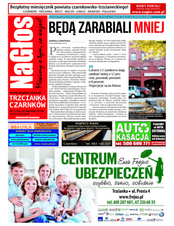 NOWY PORTAL! CZARNKÓW TRZCIANKA KRZYŻ WIELEŃ LUBASZ DRAWSKO POŁAJEWO www.naglos.com.pl Mówimy o tym, co ważne! NaGłos Bezpłatny miesięcznik powiatu czarnkowsko-trzcianeckiego! TRZCIANKA www.naglos.com.pl CZARNKÓW Nr 1 (14), 24 stycznia 2014r. ISSN 2299-8489 miesięcznik bezpłatny REKLAMA &(17580.6=7$á&(1,$ AUKA Kazimierz StefańSKi odwołany ze StanowiSKa dyreKtora Szpitala w czarnKowie. zoStaje jaKo ordynator chirurgii Będą zarabiali mniej GABRIELA CIŻMOWSKA lan ratowania czarnkowskiego szpitala nabiera realnych kształtów. Jest postęp w negocjacjach ze związkami zawodowymi i wstępna zgoda na to, by lekarze i personel szpitala zarabiali mniej. Ze stanowiska dyrektora odwołany został także Kazimierz Stefański. Byłemu już dyrektorowi zaproponowano funkcję ordynatora chirurgii i pracę jako lekarz. Tajemnicą nie jest, że szpital w Czarnkowie jest mocno zadłużony. Jako ratunek dla placówki Zarządu Powiatu upatruje znalezienie menedżera, który skupi się tylko na organizacji pracy lecznicy. Kazimierz Stefański łączył funkcję dyrektora szpitala i ordynatora oddziału chirurgii. – Doktor Stefański to ceniony chirurg, ale w tej chwili bardziej potrzebujemy menedżera szpitala – argumentuje Wiesław Maszewski, starosta. – Kiedy przyjrzeliśmy się jego pracy, okazało się, że pan dyrektor pracował dużo... Jako dyrektor wypracowywał tygodniowo 40 godzin, a dodatkowo zatrudniony był na oddzielnym kontrakcie – w wymiarze 65 godzin w tygodniu jako chirurg! Szpital jest w sytuacji kryzysowej i łączenie tych funkcji dłużej było nie do pogodzenia. Były już dyrektor odwołany został 10 stycznia, z zachowaniem trzymiesięcznego okresu wypowiedzenia, którego termin upłynie 30 kwietnia. Obowiązki dyrektora prze- 64-920 Piła, u. Warsztatowa 8 tel./fax: 67 214 84 01 e-mail: [email protected] SZKOŁY DLA DOROSŁYCH gimnazjum policealne studium zawodowe liceum ogólnokształcące medyczna szkoła policealna kurs kwalifikacyjne www. nauka.pila.pl REKLAMA Informacje, opinie, komentarze! jął jego zastępca. W celu zachowania odpowiedniej jakości pracy szpitala Zarząd Powiatu zdecydował się bezpośrednio nadzorować pracę lecznicy; pełnomocnikiem z ramienia Zarządu został wicestarosta Tadeusz Teterus. – Jestem dobrej myśli – mówi T. Teterus. – Negocjacje ze związkami zawodowymi są na finiszu. Wierzę, że w temacie koniecznej obniżki płac się dogadamy. ” Lekarze z Czarnkowa mają zarabiać mniej o 12 procent, pozostały personel o 8 procent. Negocjacje są na finiszu Na koniec listopada cały personel szpitala w Czarnkowie otrzymał bowiem wypowiedzenia zmieniające warunki płacy. Zaproponowano, by lekarze zarabiali mniej o 12 pro cent, a po zo sta li pra cow ni cy o 8 procent. I tak się najpewniej stanie. – Jeszcze podczas styczniowej sesji Rady Powiatu powinniśmy podjąć decyzję o rozpisaniu konkursu na stanowisko dyrektora szpitala – mówi wicestarosta. – Liczymy, że od maja placówką rządził będzie już nowy dyrektor. Jeszcze w styczniu rozpisany powinien zostać konkurs na stanowisko dyrektora szpitala w Czarnkowie. Czarnków Trzcianka NaGłos Czarnków Trzcianka NaGłos 24 stycznia 2014 www.naglos.com.pl Z NaGłos w całym powiecie Odszedł Jacek Sokołowski fotograf i człowiek wielkiego formatu POŻEGNANIE 7 stycznia rano zmarł Jacek Sokołowski, ceniony fotograf z Lubasza. Jeszcze w piątek, podczas gali podsumowania roku w Smolarni robił zdjęcia i był w świetnej formie. Dzień później, fotografo- wał w Lubaszu Misyjny Dzień Dziecka. Nic nie zapowiadało tragedii... Większość swojego życia Jacek Sokołowski spędził w Kanadzie. Do rodzinnego Lubasza wrócił 4 lata temu, gdzie próbował odbudować atelie. Już po powrocie do Pol- FOT. GBARIELA CIŻMOWSKA FOT. JACEK SOKOŁOWSKI (x2) 2 ski sfotografował wszystkich mieszkańców wsi Stajkowo (pod Lubaszem). W tym cyklu powstało ponad 100 portretów. Uwielbiał fotografować ludzi; kobiety zwłaszcza. O swoich fotografiach mówił: „Zdjęcia, które leczą”. „Robię zdję- „Rodzina w wannie” [ulubione zdjęcie zrobione w Kanadzie] cia, na których każda kobieta jest piękna” – podkreślał z dumą. Zachwycał się też miejscową przyrodą i architekturą. Jego pierwsza, oryginalna wystawa odbyła się w odrestaurowanym wiatraku w Dębe. Wielokrotnie wyróżniany w międzynarodowych konkursach, laureat wielu prestiżowych nagród, przyznawanych zarówno w Europie, jak i za oceanem. Przez 20 lat pracował w Kanadzie, gdzie oprócz renomowanego studia fotograficznego, prowadził także galerię sztuki. Jego zdjęcia często zdobiły okładki kolorowych magazynów o kulturze. Dzięki „Wiktor” [ulubione zdjęcie zrobione w Lubaszu] temu sfotografował wielu artystów, zarówno z Kanady, jak i USA. Był człowiekiem z charyzmą i darem zjednywania sobie ludzi. Zmarł 7 stycznia, nagle. Miał 60 lat. G.C. REKLAMA agazyn NaGłos ukazuje się od grudnia 2012 roku i jest jedynym bezpłatnym miesięcznikiem w powiecie czarnkowsko- trzcianeckim. Gazeta trafia bezpośrednio do skrzynek pocztowych czytelników, dostępna jest także w kilkudziesięciu stałych punktach kolportażu. Co ważne docieramy już do czytelników z całego powiatu czarnkowsko-trzcianeckiego. Bardzo pozytywne przyjęcie naszej gazety przez czytelników sprawiło, że zdecydowaliśmy się rozszerzyć zasięg poza sam Czarnków i Trzciankę. Zapraszamy do lektury! Kolejne wydania magazynu Czarnków Trzcianka NaGłos 21 lutego Piła NaGłos 31 stycznia Dora Metal Sp. z o.o. to wiodąca w branży gastronomicznej w Polsce, firma z 20 - letnią tradycją i doświadczeniem w projektowaniu i produkcji profesjonalnych urządzeń dla sektora HORECA, które cieszą się ogromnym uznaniem i zaufaniem wśród klientów branży gastronomicznej zarówno w Polsce, jak i za granicą Więcej informacji na stronie www.dora-metal.pl W związku z dynamicznym rozwojem i ekspansj