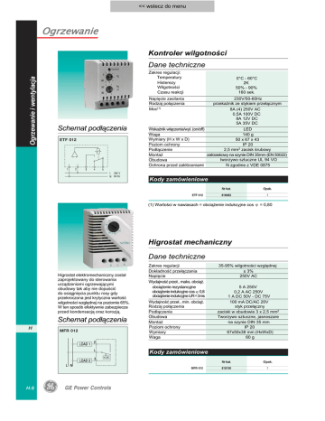 ZVWHF]GRPHQX Ogrzewanie Kontroler wilgotnoĞci Ogrzewanie i wentylacja Dane techniczne Zakres regulacji: Temperatury Histerezy WilgotnoĞci Czasu reakcji 0°C - 60°C 2K 50% - 90% 160 sek. 230V/50-60Hz przekaĨnik ze stykiem przeáącznym 8A (4) 250V AC 0,5A 100V DC 8A 12V DC 5A 35V DC NapiĊcie zasilania Rodzaj poáączenia Moc(1) Schemat podáączenia ETF 012 LED WskaĨnik wáączenia/wyá. (on/off) 140 g Waga Wymiary (H x W x D) 50 x 67 x 43 IP 20 Poziom ochrony 2,5 mm2 zacisk Ğrubowy Podáączenie zatrzaskowy na szynie DIN 35mm (EN 50022) MontaĪ tworzywo sztuczne UL 94 VO Obudowa N zgodnie z VDE 0875 Ochrona przed zakáóceniami Kody zamówieniowe ETF 012 Nr kat. Opak. 818083 1 (1) WartoĞci w nawiasach = obciąĪenie indukcyjne cos ϕ = 0,80 Higrostat mechaniczny Dane techniczne Higrostat elektromechaniczny zostaá zaprojektowany do sterowania urządzeniami ogrzewającymi obudowy tak aby nie dopuĞciü do osiągniĊcia punktu rosy gdy przekroczona jest krytyczna wartoĞü wilgotnoĞci wzglĊdnej na poziomie 65%. W ten sposób efektywnie zabezpiecza przed kondensacją oraz korozją. Schemat podáączenia H MFR 012 Zakres regulacji DokáadnoĞü przeáączania NapiĊcie WydajnoĞü przeá., maks. obciąĪ. obciąĪenie rezystancyjne obciąĪenie indukcyjne cos ϕ 0,8 obciąĪenie indukcyjne L/R=3ms WydajnoĞü przeá., min. obciąĪ. Rodzaj poáączenia Podáączenie Obudowa MontaĪ Poziom ochrony Wymiary Waga 35-95% wilgotnoĞci wzglĊdnej ± 3% 250V AC 5 A 250V 0,2 A AC 250V 1 A DC 50V - DC 75V 100 mA DC/AC 20V styk przeáączny zaciski w obudowie 3 x 2,5 mm2 Tworzywo sztuczne, jasnoszare na szynie DIN 35 mm IP 20 67x50x38 mm (HxWxD) 60 g Kody zamówieniowe MFR 012 H.6 GE Power Controls Nr kat. Opak. 818190 1