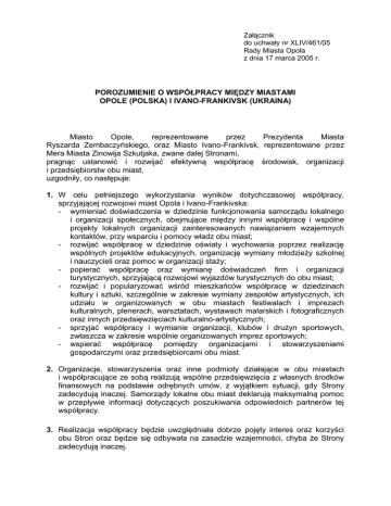 Załącznik do uchwały nr XLIV/461/05 Rady Miasta Opola z dnia 17 marca 2005 r. POROZUMIENIE O WSPÓŁPRACY MIĘDZY MIASTAMI OPOLE (POLSKA) I IVANO-FRANKIVSK (UKRAINA) Miasto Opole, reprezentowane przez Prezydenta Miasta Ryszarda Zembaczyńskiego, oraz Miasto Ivano-Frankivsk, reprezentowane przez Mera Miasta Zinowija Szkutjaka, zwane dalej Stronami, pragnąc ustanowić i rozwijać efektywną współpracę środowisk, organizacji i przedsiębiorstw obu miast, uzgodniły, co następuje: 1. W celu pełniejszego wykorzystania wyników dotychczasowej współpracy, sprzyjającej rozwojowi miast Opola i Ivano-Frankivska: - wymieniać doświadczenia w dziedzinie funkcjonowania samorządu lokalnego i organizacji społecznych, obejmujące między innymi współpracę i wspólne projekty lokalnych organizacji zainteresowanych nawiązaniem wzajemnych kontaktów, przy wsparciu i pomocy władz obu miast; - rozwijać współpracę w dziedzinie oświaty i wychowania poprzez realizację wspólnych projektów edukacyjnych, organizację wymiany młodzieży szkolnej i nauczycieli oraz pomoc w organizacji staży; - popierać współpracę oraz wymianę doświadczeń firm i organizacji turystycznych, sprzyjającą rozwojowi wyjazdów turystycznych do obu miast; - rozwijać i popularyzować wśród mieszkańców współpracę w dziedzinach kultury i sztuki, szczególnie w zakresie wymiany zespołów artystycznych, ich udziału w organizowanych w obu miastach festiwalach i imprezach kulturalnych, plenerach, warsztatach, wystawach malarskich i fotograficznych oraz innych przedsięwzięciach kulturalno-artystycznych; - sprzyjać współpracy i wymianie organizacji, klubów i drużyn sportowych, zwłaszcza w zakresie wspólnie organizowanych imprez sportowych; - wspierać współpracę pomiędzy organizacjami i stowarzyszeniami gospodarczymi oraz przedsiębiorcami obu miast. 2. Organizacje, stowarzyszenia oraz inne podmioty działające w obu miastach i współpracujące ze sobą realizują wspólne przedsięwzięcia z własnych środków finansowych na podstawie odrębnych umów, z wyjątkiem sytuacji, gdy Strony zadecydują inaczej. Samorządy lokalne obu miast deklarują maksymalną pomoc w przepływie informacji dotyczących poszukiwania odpowiednich partnerów tej współpracy. 3. Realizacja współpracy będzie uwzględniała dobrze pojęty interes oraz korzyści obu Stron oraz będzie się odbywała na zasadzie wzajemności, chyba że Strony zadecydują inaczej. 4. Współpraca obu Stron będzie ustawodawstwem danego Państwa. realizowana zgodnie z istniejącym 5. Wymiana korespondencji między Stronami będzie odbywała się w języku ojczystym nadawcy korespondencji. 6. Wszelkie wątpliwości dotyczące realizacji i stosowania niniejszego Porozumienia oraz propozycje zmian w jego zapisach będą rozpatrywane w drodze obustronnych konsultacji. 7. Porozumienie wchodzi w życie z dniem jego podpisania przez obie Strony. Niniejsze Porozumienie podpisano dnia .......................... 2005 roku w Opolu w dwóch jednobrzmiących wersjach językowych: ukraińskiej i polskiej. Ryszard Zembaczyński Zinowij Szkutjak Prezydent Miasta Opola (Polska) Mer Miasta Ivano-Frankivska (Ukraina)