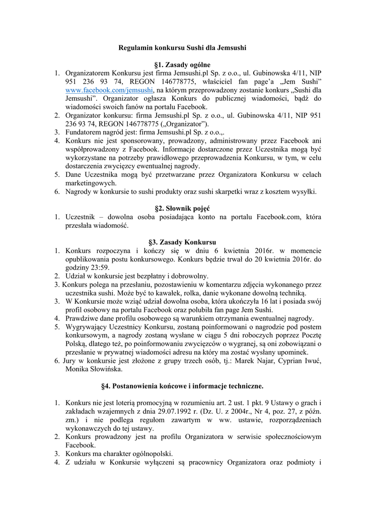 Regulamin konkursu Sushi dla Jemsushi §1. Zasady ogólne 1. Organizatorem Konkursu jest firma Jemsushi.pl Sp. z o.o., ul. Gubinowska 4/11, NIP 951 236 93 74, REGON 146778775, właściciel fan page’a „Jem Sushi” www.facebook.com/jemsushi, na którym przeprowadzony zostanie konkurs „Sushi dla Jemsushi”. Organizator ogłasza Konkurs do publicznej wiadomości, bądź do wiadomości swoich fanów na portalu Facebook. 2. Organizator konkursu: firma Jemsushi.pl Sp. z o.o., ul. Gubinowska 4/11, NIP 951 236 93 74, REGON 146778775 („Organizator”). 3. Fundatorem nagród jest: firma Jemsushi.pl Sp. z o.o.,. 4. Konkurs nie jest sponsorowany, prowadzony, administrowany przez Facebook ani współprowadzony z Facebook. Informacje dostarczone przez Uczestnika mogą być wykorzystane na potrzeby prawidłowego przeprowadzenia Konkursu, w tym, w celu dostarczenia zwycięzcy ewentualnej nagrody. 5. Dane Uczestnika mogą być przetwarzane przez Organizatora Konkursu w celach marketingowych. 6. Nagrody w konkursie to sushi produkty oraz sushi skarpetki wraz z kosztem wysyłki. §2. Słownik pojęć 1. Uczestnik – dowolna osoba posiadająca konto na portalu Facebook.com, która przesłała wiadomość. §3. Zasady Konkursu 1. Konkurs rozpoczyna i kończy się w dniu 6 kwietnia 2016r. w momencie opublikowania postu konkursowego. Konkurs będzie trwał do 20 kwietnia 2016r. do godziny 23:59. 2. Udział w konkursie jest bezpłatny i dobrowolny. 3. Konkurs polega na przesłaniu, pozostawieniu w komentarzu zdjęcia wykonanego przez uczestnika sushi. Może być to kawałek, rolka, danie wykonane dowolną techniką. 3. W Konkursie może wziąć udział dowolna osoba, która ukończyła 16 lat i posiada swój profil osobowy na portalu Facebook oraz polubiła fan page Jem Sushi. 4. Prawdziwe dane profilu osobowego są warunkiem otrzymania ewentualnej nagrody. 5. Wygrywający Uczestnicy Konkursu, zostaną poinformowani o nagrodzie pod postem konkursowym, a nagrody zostaną wysłane w ciągu 5 dni roboczych poprzez Pocztę Polską, dlatego też, po poinformowaniu zwycięzców o wygranej, są oni zobowiązani o przesłanie w prywatnej wiadomości adresu na który ma zostać wysłany upominek. 6. Jury w konkursie jest złożone z grupy trzech osób, tj.: Marek Najar, Cyprian Iwuć, Monika Słowińska. §4. Postanowienia końcowe i informacje techniczne. 1. Konkurs nie jest loterią promocyjną w rozumieniu art. 2 ust. 1 pkt. 9 Ustawy o grach i zakładach wzajemnych z dnia 29.07.1992 r. (Dz. U. z 2004r., Nr 4, poz. 27, z późn. zm.) i nie podlega regułom zawartym w ww. ustawie, rozporządzeniach wykonawczych do tej ustawy. 2. Konkurs prowadzony jest na profilu Organizatora w serwisie społecznościowym Facebook. 3. Konkurs ma charakter ogólnopolski. 4. Z udziału w Konkursie wyłączeni są pracownicy Organizatora oraz podmioty i pracownicy podmiotów świadczących usługi na rzecz Organizatora przy organizowaniu 5. W związku z częstymi zmianami tzw. „iFrame” oraz innych funkcjonalności serwisu internetowego Facebook, Organizator nie ponoszą odpowiedzialności za zakłócenia w prawidłowym działaniu postu ani też odpowiedzialności za awarie Facebooka. 6. Organizator nie ponosi odpowiedzialności za ewentualne zniknięcie plików tekstowych lub graficznych które zostały umieszczone w komentarzach przez Uczestnika. 8. Organizator konkursu zastrzegają sobie prawo do usunięcia treści, wgranych przez Uczestnika, które są sprzeczne z treścią Regulaminu, z obowiązującym prawem, zasadami życia społecznego, dobrymi obyczajami, naruszają prawa osób trzecich lub też treści obraźliwych, wulgarnych, zawierających groźby skierowane pod adresem osób trzecich, zawierających treści dyskryminujące płeć, rasę, narodowość, język, religię, nawołujące do przemocy lub posiadające charakter pornograficzny. Treści (grafika, tekst, linki) naruszające powyższe zasady będą usuwane a Organizator konkursu może ograniczyć użytkownikowi umieszczającemu takie treści dostęp do fan page’a Jem Sushi. 9. Uczestnik oraz Organizator oświadczają, że treści umieszczane pod postem konkursowym nie naruszają praw osób trzecich, w tym w szczególności autorskich praw majątkowych w rozumieniu ustawy z dnia 4 lutego 1994 r. o prawie autorskim i prawach pokrewnych (tekst jednolity z dnia 17 maja 2006r. Dz. U. Nr 90, poz. 631 ze zm.). 10. Uczestnik ponosi pełną odpowiedzialność wobec Organizatora i osób trzecich w przypadku, gdyby użyte przez niego treści, grafiki i/lub linki naruszały prawa osób trzecich. 11. Konkurs nie może zawierać treści przeznaczonych wyłącznie dla osób pełnoletnich, w tym treści erotycznych, promujących alkohol lub wyroby tytoniowe. Organizator konkursu został o tym poinformowany przez Twórcę Aplikacji i zobowiązuje się ściśle przestrzegać tych zasad. 12. Dane osobowe Uczestników dokonujących rejestracji przetwarzane są zgodnie z ustawą z dnia 29 sierpnia 1997r. o ochronie danych osobowych (tekst jednolity: Dz. U. 2002 r. Nr 101 poz. 926, ze zm.). Przekazanie danych osobowych Uczestników jest dobrowolne, jednakże stanowi warunek uczestnictwa w Konkursie. Uczestnikowi przysługuje prawo dostępu do treści swoich danych osobowych oraz do ich poprawiania i usuwania, jak i złożenia sprzeciwu co do ich dalszego przetwarzania przez Organizatora. 13. Dane osobowe Uczestnika umieszczone w zgłoszeniu mogą być przetwarzane w zakresie koniecznym do prowadzenia Konkursu i w celu wykonania zobowiązań wynikających z Konkursu. 14. Organizator zastrzega sobie prawo do wysyłania Uczestnikom informacji w związku z prowadzonym Konkursem. Uczestnik upoważnia Organizatora w związku z prowadzonym Konkursem do przetwarzania danych osobowych i przekazywania Uczestnikowi za pomocą środków komunikacji elektronicznej, w szczególności na wskazany adres e-mail i/lub nr telefonu, informacji handlowych zgodnie z ustawą o świadczeniu usług dr