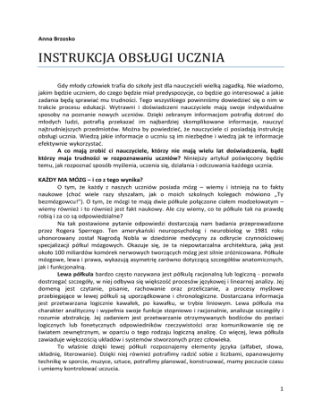 Anna Brzosko INSTRUKCJA OBSŁUGI UCZNIA Gdy młody człowiek trafia do szkoły jest dla nauczycieli wielką zagadką. Nie wiadomo, jakim będzie uczniem, do czego będzie miał predyspozycje, co będzie go interesowad a jakie zadania będą sprawiad mu trudności. Tego wszystkiego powinniśmy dowiedzied się o nim w trakcie procesu edukacji. Wytrawni i doświadczeni nauczyciele mają swoje indywidualne sposoby na poznanie nowych uczniów. Dzięki zebranym informacjom potrafią dotrzed do młodych ludzi, potrafią przekazad im najbardziej skomplikowane informacje, nauczyd najtrudniejszych przedmiotów. Można by powiedzied, że nauczyciele ci posiadają instrukcję obsługi ucznia. Wiedzą jakie informacje o uczniu są im niezbędne i wiedzą jak te informacje efektywnie wykorzystad. A co mają zrobid ci nauczyciele, którzy nie mają wielu lat doświadczenia, bądź którzy maja trudności w rozpoznawaniu uczniów? Niniejszy artykuł poświęcony będzie temu, jak rozpoznad sposób myślenia, uczenia się, działania i odczuwania każdego ucznia. KAŻDY MA MÓZG – i co z tego wynika? O tym, że każdy z naszych uczniów posiada mózg – wiemy i istnieją na to fakty naukowe (chod wiele razy słyszałam, jak o moich szkolnych kolegach mówiono „Ty bezmózgowcu!”). O tym, że mózgi te mają dwie półkule połączone ciałem modzelowatym – wiemy również i to również jest fakt naukowy. Ale czy wiemy, co te półkule tak na prawdę robią i za co są odpowiedzialne? Na tak postawione pytanie odpowiedzi dostarczają nam badania przeprowadzone przez Rogera Sperrego. Ten amerykaoski neuropsycholog i neurobiolog w 1981 roku uhonorowany został Nagrodą Nobla w dziedzinie medycyny za odkrycie czynnościowej specjalizacji półkul mózgowych. Okazuje się, że ta niepowtarzalna architektura, jaką jest około 100 miliardów komórek nerwowych tworzących mózg jest silnie zróżnicowana. Półkule mózgowe, lewa i prawa, wykazują asymetrię zarówno dotyczącą szczegółów anatomicznych, jak i funkcjonalną. Lewa półkula bardzo często nazywana jest półkulą racjonalną lub logiczną - pozwala dostrzegad szczegóły, w niej odbywa się większośd procesów językowej i linearnej analizy. Jej domeną jest czytanie, pisanie, rachowanie oraz przeliczanie, a procesy myślowe przebiegające w lewej półkuli są uporządkowane i chronologiczne. Dostarczana informacja jest przetwarzana logicznie kawałek, po kawałku, w trybie liniowym. Lewa półkula ma charakter analityczny i wypełnia swoje funkcje stopniowo i racjonalnie, analizuje szczegóły i rozumie abstrakcję. Jej zadaniem jest przetwarzanie otrzymywanych bodźców do postaci logicznych lub fonetycznych odpowiedników rzeczywistości oraz komunikowanie się ze światem zewnętrznym, w oparciu o tego rodzaju logiczną analizę. Co więcej, lewa półkula zawiaduje większością układów i systemów stworzonych przez człowieka. To właśnie dzięki lewej półkuli rozpoznajemy elementy języka (alfabet, słowa, składnię, literowanie). Dzięki niej również potrafimy radzid sobie z liczbami, opanowujemy technikę w sporcie, muzyce, sztuce, potrafimy planowad, konstruowad, mamy poczucie czasu i umiemy kontrolowad uczucia. 1 Natomiast prawa półkula jest intuicyjnym obszarem mózgu - tu działa wyobraźnia, a pojmowanie ma charakter holistyczny. Tu mieści się wrażliwośd plastyczna i muzyczna, tutaj również przebiegają szlaki ludzkiej wiary, religii, rytuałów i wszelkiego rodzaju mistycyzmu, a także powstają uczucia. Prawa półkula nadzoruje wyobraźnię przestrzenną, wrażliwośd artystyczną oraz kreatywne myślenie. Prawa strona mózgu dokonuje syntezy, przetwarza napływające informacje w sposób całościowy i zintegrowany, czyli holistyczny (wszystkie jednocześnie), nie dokonując ich logicznego rozbioru. To ona kontroluje podświadome myśli oraz wewnętrzną świadomośd. Po tej stronie mózgu drobne elementy większej całości są skrupulatnie zbierane, dopasowywane do siebie, przy okazji dając zaczyn nowym pojęciom i ideom. Dzięki pracy prawej półkuli możemy rozpoznawad język przez obrazy, uczucia i dialekt językowy, rozpoznajemy kształty i formy geometryczne i przestrzenne, potrafimy wyrażad uczucia, jesteśmy ukierunkowani na ludzi i na teraz, a nasz sposób porozumiewania się bogaty jest w elementy komunikacji niewerbalnej. I tu dochodzimy do rzeczy najważniejszej z punktu widzenia sposobów uczenia się. W procesie rozwoju człowieka dochodzi do wyraźnej specjalizacji mózgu i tak możemy byd posiadaczami mózgu z dominacją prawej półkuli, mózgu z dominacją lewej półkuli bądź mózgu bez dominacji. Ta właśnie specjalizacja jest szczególnie ważna w szkole, gdzie młodzi ludzie poznają rzeczy nowe i gdzie czasami znajdują się w sytuacjach stresowych. Okazuje się bowiem, że ludzki mózg działa zgodnie z preferowaną dominacją właśnie w sytuacjach nowych i sytuacjach stresowych! Oznacza to, że dla jednych uczniów łatwiejsze będzie poznanie zasad gramatyki, nauczenie się mnożenia ułamków i zapamiętanie wzorów chemicznych, a dla innych najłatwiejszą rzeczą pod słoocem będzie napisanie opowiadania, czy ekspresyjna deklamacja wiersza. WZROKOWCY, SŁUCHOWCY I KINESTETYCY – różne sposoby różne zdolności… Kolejnym elementem, o którym należy wspomnied przy okazji identyfikowania sposobów myślenia, uczenia się, działania i odczuwania uczniów jest dominujący kanał percepcji. Ważny jest bowiem sposób, w jaki odbierane i rozpoznawane są informacje z otoczenia i którym z dostępnych kanałów docierają one do mózgu, gdzie są odpowiednio interpretowane. Spośród pięciu zmysłów zewnętrznych, odpowiadających za badanie środowiska – wzroku, słuchu, dotyku, smaku, węchu oraz trzech zmysłów wewnętrznych – równowagi, kinestezji (fizjologiczne odczuwanie ruchu i pozycji ciała), propriocepcji (głębokie odczuwanie mięśniowo