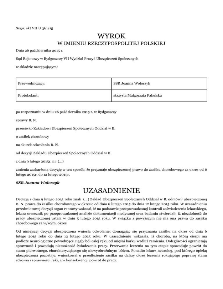 Sygn. akt VII U 361/15 WYROK W IMIENIU RZECZYPOSPOLITEJ POLSKIEJ Dnia 26 października 2015 r. Sąd Rejonowy w Bydgoszczy VII Wydział Pracy i Ubezpieczeń Społecznych w składzie następującym: Przewodniczący: SSR Joanna Wołoszyk Protokolant: stażysta Małgorzata Pakulska po rozpoznaniu w dniu 26 października 2015 r. w Bydgoszczy sprawy B. N. przeciwko Zakładowi Ubezpieczeń Społecznych Oddział w B. o zasiłek chorobowy na skutek odwołania B. N. od decyzji Zakładu Ubezpieczeń Społecznych Oddział w B. z dnia 9 lutego 2015r. nr (...) zmienia zaskarżoną decyzję w ten sposób, że przyznaje ubezpieczonej prawo do zasiłku chorobowego za okres od 6 lutego 2015r. do 12 lutego 2015r. SSR Joanna Wołoszyk UZASADNIENIE Decyzją z dnia 9 lutego 2015 roku znak (...) Zakład Ubezpieczeń Społecznych Oddział w B. odmówił ubezpieczonej B. N. prawa do zasiłku chorobowego w okresie od dnia 6 lutego 2015 do dnia 12 lutego 2015 roku. W uzasadnieniu przedmiotowej decyzji organ rentowy wskazał, iż na podstawie przeprowadzonej kontroli zaświadczenia lekarskiego, lekarz orzecznik po przeprowadzonej analizie dokumentacji medycznej oraz badaniu stwierdził, iż niezdolność do pracy ubezpieczonej ustała w dniu 5 lutego 2015 roku. W związku z powyższym nie ma ona prawa do zasiłku chorobowego za w/wym. okres. Od niniejszej decyzji ubezpieczona wniosła odwołanie, domagając się przyznania zasiłku na okres od dnia 6 lutego 2015 roku do dnia 12 lutego 2015 roku. W uzasadnieniu wskazała, iż choroba, na którą cierpi ma podłoże neurologiczne powodujące ciągły ból całej ręki, od mięśni barku wzdłuż ramienia. Dolegliwości ograniczają sprawność i powodują niemożność świadczenia pracy. Przerwanie leczenia na tym etapie spowoduje powrót do stanu pierwotnego, charakteryzującego się niewyobrażalnym bólem. Ponadto lekarz neurolog, pod którego opieką ubezpieczona pozostaje, wnioskował o przedłużenie zasiłku na dalszy okres leczenia rokującego poprawę stanu zdrowia i sprawności ręki, a w konsekwencji powrót do pracy. W odpowiedzi na odwołanie ZUS podtrzymał swoje stanowisko, wskazując, iż na mocy art. 59 ustawy z dnia 25 czerwca 199 r. o świadczeniach pieniężnych z ubezpieczenia społecznego w razie choroby i macierzyństwa (tekst jednolity: Dz.U z 2014 r., poz. 159) prawidłowość orzekania o czasowej niezdolności do pracy z powodu choroby podlega kontroli przez lekarza orzecznika ZUS. Jeżeli po analizie dokumentacji medycznej i przeprowadzeniu badania kontrolnego lekarz orzecznik określ wcześniejszą datę ustania niezdolności do pracy niż orzeczona w zaświadczeniu lekarskim, za okres od tej daty zaświadczenie traci ważność w takim wypadku lekarz orzecznik wystawia zaświadczenie, które jest traktowane na równi z zaświadczeniem stwierdzającym brak przeciwwskazań do pracy na określonym stanowisku, wydanym w myśl art. 229 §4 k.p. W wyniku badania kontrolnego przeprowadzonego w dniu 5 lutego 2015 roku stwierdzono u odwołującej ustanie niezdolności do pracy. W związku z powyższym organ rentowy wniósł o oddalenie odwołania. Sąd ustalił, co następuje: Ubezpieczona B. N. podlegała ubezpieczeniu chorobowemu od dnia 1 marca 2013 roku. Dowód: okoliczność bezsporna. W związku z trwającymi od dnia 15 września 2014 roku dolegliwościami bólowymi o charakterze rwy barkowej po stronie prawej oraz rozpoznanej (...) ubezpieczona pozostawała niezdolna do pracy w okresach od 15 do 21 września 2014 r., od 23 do 30 września 2014 r., od 1 do 12 października 2014 r., od 13 do 26 października 2014 r., od 27 października do 26 listopada 2014 r., od 27 listopada do 28 grudnia 2014 r., od 29 grudnia 2014 r. do dnia 11 stycznia 2015 r.. Ubezpieczona została poddana rehabilitacji medycznej w okresie od 15 grudnia 2014 r. do 30 grudnia 2014 r. Dowód: dokumentacja medyczna k.12-16, plan zabiegów k. 18-19. Lekarz leczący, specjalista z dziedziny neurologii uznał ubezpieczoną za niezdolną do pracy w okresie od dnia 12 stycznia 2015 r. od dnia 12 lutego 2015 r. i wystawił zaświadczenie lekarskie (...) seria i numer (...). Dowód: zaświadczenie lekarskie seria i numer (...) w aktach ZUS. Lekarz orzecznik ZUS po analizie dokumentacji medycznej oraz po przeprowadzonym w dniu 5 lutego 2015 roku badaniu, stwierdził, że niezdolność ubezpieczonej do pracy ustała z dniem 5 lutego 2015 roku. Decyzją z dnia 9 lutego 2015 roku, znak (...) Zakład Ubezpieczeń Społecznych Oddział w B. odmówił ubezpieczonej prawa do zasiłku chorobowego za okres od dnia 6 lutego 2015 r. do dnia 12 lutego 2015 roku. Dowód: opinia lekarza orzecznika ZUS w aktach ZUS, decyzja z dnia 9.02.2015 r. znak (...). Biegły sądowy z dziedziny neurologii i rehabilitacji medycznej rozpoznał u ubezpieczonej zespół korzeniowy szyjny prawostronny w okresie regresji oraz zmiany zwyrodnieniowe kręgosłupa. Analiza przez biegłego zgromadzonej w aktach sprawy dokumentacji medycznej wykazała, iż w okresie określonym przez lekarza leczącego występowały dolegliwości bólowe. Natomiast biorąc pod uwagę charakter wykonywanej przez ubezpieczoną pracy wiążącej się z dźwiganiem i przerzucaniem warzyw istniały uzasadnione przesłanki do ochrony ubezpieczonej od pracy w okresie od 12 stycznia 2015 r. do 12 lutego 2015 r. W odpowiedzi na zastrzeżenia organu rentowego zawarte w piśmie z dnia 5 sierpnia 2015r , biegła podała ,że treść wywiadu z badaną oparła na jej bezpośredniej relacji . Z dokumentacji zgromadzonej w aktach sprawy tj. Kopii kartoteki (...) w B. , z analizy treści wizyt lekarskich wynika ,że w dniu 13 lutego 2015r odnotowano „ wywiad aktualny : pacjentka w ciągłym leczeniu u neurologa , zwolnienie do 11 luty , kolejna wizyta u lekarza leczącego 25 luty 2015r ;wystawiono zwolnienie na okres do wizyty kontrolnej .. pacjentka nadal ma ograniczenie ruchomości barku „ Stąd ochrona od pracy wyznaczona przez lekarza prowadz