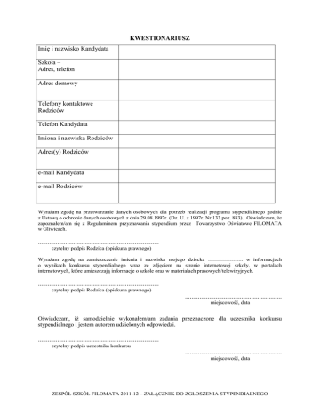 KWESTIONARIUSZ Imię i nazwisko Kandydata Szkoła – Adres, telefon Adres domowy Telefony kontaktowe Rodziców Telefon Kandydata Imiona i nazwiska Rodziców Adres(y) Rodziców e-mail Kandydata e-mail Rodziców Wyrażam zgodę na przetwarzanie danych osobowych dla potrzeb realizacji programu stypendialnego godnie z Ustawą o ochronie danych osobowych z dnia 29.08.1997r. (Dz. U. z 1997r. Nr 133 poz. 883). Oświadczam, że zapoznałem/am się z Regulaminem przyznawania stypendium przez Towarzystwo Oświatowe FILOMATA w Gliwicach. ........................................................................... czytelny podpis Rodzica (opiekuna prawnego) Wyrażam zgodę na zamieszczenie imienia i nazwiska mojego dziecka ……………….. w informacjach o wynikach konkursu stypendialnego wraz ze zdjęciem na stronie internetowej szkoły, w portalach internetowych, które umieszczają informacje o szkole oraz w materiałach prasowych/telewizyjnych. ........................................................................... czytelny podpis Rodzica (opiekuna prawnego) ............................................................ miejscowość, data Oświadczam, iż samodzielnie wykonałem/am zadania przeznaczone dla uczestnika konkursu stypendialnego i jestem autorem udzielonych odpowiedzi. ........................................................................... czytelny podpis uczestnika konkursu ............................................................ miejscowość, data ZESPÓŁ SZKÓŁ FILOMATA 2011-12 – ZAŁĄCZNIK DO ZGŁOSZENIA STYPENDIALNEGO