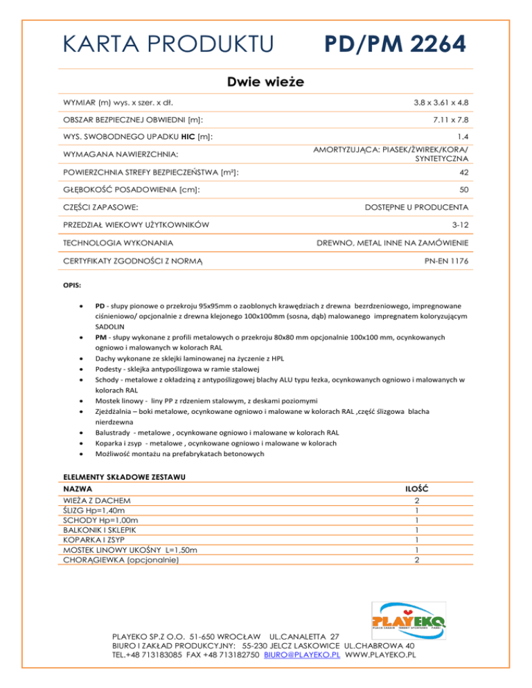 KARTA PRODUKTU PD/PM 2264 Dwie wieże WYMIAR (m) wys. x szer. x dł. 3.8 x 3.61 x 4.8 OBSZAR BEZPIECZNEJ OBWIEDNI [m]: 7.11 x 7.8 WYS. SWOBODNEGO UPADKU HIC [m]: WYMAGANA NAWIERZCHNIA: 1.4 AMORTYZUJĄCA: PIASEK/ŻWIREK/KORA/ SYNTETYCZNA POWIERZCHNIA STREFY BEZPIECZEŃSTWA [m²]: 42 GŁĘBOKOŚĆ POSADOWIENIA [cm]: 50 CZĘŚCI ZAPASOWE: DOSTĘPNE U PRODUCENTA PRZEDZIAŁ WIEKOWY UŻYTKOWNIKÓW TECHNOLOGIA WYKONANIA 3-12 DREWNO, METAL INNE NA ZAMÓWIENIE CERTYFIKATY ZGODNOŚCI Z NORMĄ PN-EN 1176 OPIS: PD - słupy pionowe o przekroju 95x95mm o zaoblonych krawędziach z drewna bezrdzeniowego, impregnowane ciśnieniowo/ opcjonalnie z drewna klejonego 100x100mm (sosna, dąb) malowanego impregnatem koloryzującym SADOLIN PM - słupy wykonane z profili metalowych o przekroju 80x80 mm opcjonalnie 100x100 mm, ocynkowanych ogniowo i malowanych w kolorach RAL Dachy wykonane ze sklejki laminowanej na życzenie z HPL Podesty - sklejka antypoślizgowa w ramie stalowej Schody - metalowe z okładziną z antypoślizgowej blachy ALU typu łezka, ocynkowanych ogniowo i malowanych w kolorach RAL Mostek linowy - liny PP z rdzeniem stalowym, z deskami poziomymi Zjeżdżalnia – boki metalowe, ocynkowane ogniowo i malowane w kolorach RAL ,część ślizgowa blacha nierdzewna Balustrady - metalowe , ocynkowane ogniowo i malowane w kolorach RAL Koparka i zsyp - metalowe , ocynkowane ogniowo i malowane w kolorach Możliwość montażu na prefabrykatach betonowych ELELMENTY SKŁADOWE ZESTAWU NAZWA ILOŚĆ WIEŻA Z DACHEM ŚLIZG Hp=1,40m SCHODY Hp=1,00m BALKONIK I SKLEPIK KOPARKA I ZSYP MOSTEK LINOWY UKOŚNY L=1,50m CHORĄGIEWKA (opcjonalnie) 2 1 1 1 1 1 2 PLAYEKO SP.Z O.O. 51-650 WROCŁAW UL.CANALETTA 27 BIURO I ZAKŁAD PRODUKCYJNY: 55-230 JELCZ LASKOWICE UL.CHABROWA 40 TEL.+48 713183085 FAX +48 713182750 [email protected] WWW.PLAYEKO.PL KARTA TECHNICZNA PD/PM 2264 Dwie wieże PLAYEKO SP.Z O.O. 51-650 WROCŁAW UL.CANALETTA 27 BIURO I ZAKŁAD PRODUKCYJNY: 55-230 JELCZ LASKOWICE UL.CHABROWA 40 TEL.+48 713183085 FAX +48 713182750 [email protected] WWW.PLAYEKO.PL