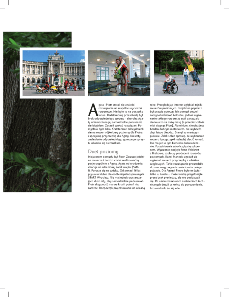 A gata i Piotr starali się znaleźć rozwiązanie na wspólne wycieczki rowerowe. Nie było to na początku łatwe. Podstawową przeszkodą był brak odpowiedniego sprzętu - choroba Agaty uniemożliwia jej samodzielne poruszanie się bicyklem. Zaczęli szukać rozwiązań. Pomysłów było kilka. Ostatecznie zdecydowali się na rower trójkołowy poziomy dla Piotra i specjalną przyczepkę dla Agaty. Niestety, znalezienie odpowiedniego gotowego sprzętu okazało się niemożliwe. Duet poziomy Inicjatorem pomysłu był Piotr. Zawsze jeździł na rowerze i bardzo chciał realizować tą pasję wspólnie z Agatą. Agata od urodzenia choruje na rdzeniowy zanik mięśni (SMA I). Porusza się na wózku. Od ponad 16 lat pływa w klubie dla osób niepełnosprawnych START Wrocław. Nie ma jednak wystarczająco dużo siły, aby samodzielnie pedałować. Piotr aktywność ma we krwi i potrafi nią zarażać. Rozpoczęli projektowanie na własną rękę. Przeglądając internet zgłębiali tajniki rowerów poziomych. Projekt na papierze był prawie gotowy. Ich pomysł powoli zaczynał nabierać kolorów, jednak wykonanie takiego roweru ze stali oznaczało stanowczo za dużą masę (a przecież całość miał ciągnąć Piotr). Aluminium, chociaż jest bardzo dobrym materiałem, nie wybacza zbyt łatwo błędów. Stanęli w martwym punkcie. Zdali sobie sprawę, że wykonanie roweru i przyczepki najlepiej zlecić komuś, kto ma już w tym kierunku doświadczenie. Poszukiwania zakończyły się sukcesem. Wyzwanie podjęła firma Velokraft z Krakowa, czołowy producent rowerów poziomych. Kamil Manecki zgodził się wykonać rower i przyczepkę z włókien węglowych. Takie rozwiązanie prowadziło do znacznego ograniczenia tonażu całego pojazdu. Dla Agaty i Piotra było to światełko w tunelu… może trochę przysłonięte przez brak pieniędzy, ale nie poddawali się. Po wielu rozmowach i ustaleniach technicznych doszli w końcu do porozumienia. Już wiedzieli, że się uda.