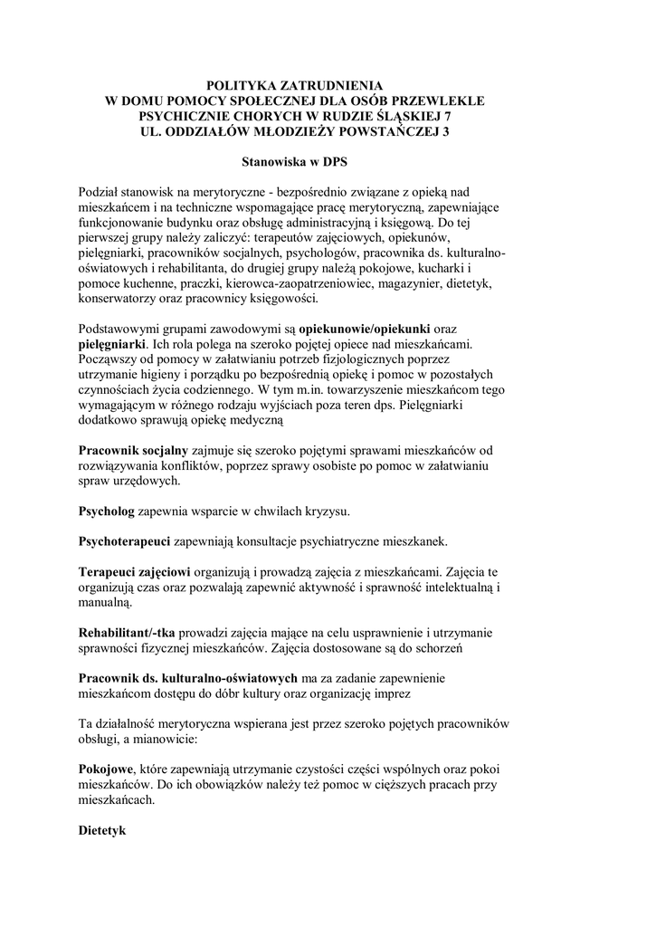 POLITYKA ZATRUDNIENIA W DOMU POMOCY SPOŁECZNEJ DLA OSÓB PRZEWLEKLE PSYCHICZNIE CHORYCH W RUDZIE ŚLĄSKIEJ 7 UL. ODDZIAŁÓW MŁODZIEŻY POWSTAŃCZEJ 3 Stanowiska w DPS Podział stanowisk na merytoryczne - bezpośrednio związane z opieką nad mieszkańcem i na techniczne wspomagające pracę merytoryczną, zapewniające funkcjonowanie budynku oraz obsługę administracyjną i księgową. Do tej pierwszej grupy należy zaliczyć: terapeutów zajęciowych, opiekunów, pielęgniarki, pracowników socjalnych, psychologów, pracownika ds. kulturalnooświatowych i rehabilitanta, do drugiej grupy należą pokojowe, kucharki i pomoce kuchenne, praczki, kierowca-zaopatrzeniowiec, magazynier, dietetyk, konserwatorzy oraz pracownicy księgowości. Podstawowymi grupami zawodowymi są opiekunowie/opiekunki oraz pielęgniarki. Ich rola polega na szeroko pojętej opiece nad mieszkańcami. Począwszy od pomocy w załatwianiu potrzeb fizjologicznych poprzez utrzymanie higieny i porządku po bezpośrednią opiekę i pomoc w pozostałych czynnościach życia codziennego. W tym m.in. towarzyszenie mieszkańcom tego wymagającym w różnego rodzaju wyjściach poza teren dps. Pielęgniarki dodatkowo sprawują opiekę medyczną Pracownik socjalny zajmuje się szeroko pojętymi sprawami mieszkańców od rozwiązywania konfliktów, poprzez sprawy osobiste po pomoc w załatwianiu spraw urzędowych. Psycholog zapewnia wsparcie w chwilach kryzysu. Psychoterapeuci zapewniają konsultacje psychiatryczne mieszkanek. Terapeuci zajęciowi organizują i prowadzą zajęcia z mieszkańcami. Zajęcia te organizują czas oraz pozwalają zapewnić aktywność i sprawność intelektualną i manualną. Rehabilitant/-tka prowadzi zajęcia mające na celu usprawnienie i utrzymanie sprawności fizycznej mieszkańców. Zajęcia dostosowane są do schorzeń Pracownik ds. kulturalno-oświatowych ma za zadanie zapewnienie mieszkańcom dostępu do dóbr kultury oraz organizację imprez Ta działalność merytoryczna wspierana jest przez szeroko pojętych pracowników obsługi, a mianowicie: Pokojowe, które zapewniają utrzymanie czystości części wspólnych oraz pokoi mieszkańców. Do ich obowiązków należy też pomoc w cięższych pracach przy mieszkańcach. Dietetyk Kucharki i pomoce kuchenne Praczki - zapewniają pranie zarówno pościeli jaki ubrań i bielizny osobistej mieszkańców, Krawcowa Konserwatorzy Magazynier Pracownicy księgowości, do których zadań należy również prowadzenie spraw kadrowych Oczekiwania wobec kandydatów Przy zatrudnianiu pracowników merytorycznych preferuję osoby ze specjalistycznym ponadlicealnym oraz średnim wykształceniem. Od kandydatów oczekuję umiejętności łatwego nawiązywania kontaktów, otwartości na innych ludzi, mile widziana jest umiejętność obsługi komputera a na stanowisku pracownika socjalnego jest ona niezbędna. Na pozostałe stanowiska oczekuję udokumentowanych kwalifikacji zgodnie z charakterem stanowiska.