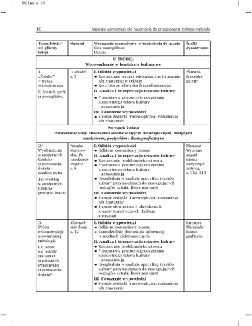 PG1nn s. 10 10 Materiały pomocnicze dla nauczyciela do przygotowania rozkładu materiału Temat lekcji/ cel główny lekcji Materiał Wymagania szczegółowe w odniesieniu do ucznia Cele szczegółowe Uczeń: Środki dydaktyczne U ŹRÓDEŁ Wprowadzenie w konteksty kulturowe 1. „Źródło” – wyraz wieloznaczny. U źródeł, s. 7 I. Odbiór wypowiedzi Rozpoznaje wyrazy wieloznaczne i rozumie ich znaczenie w tekście Korzysta ze słownika frazeologicznego Słownik frazeologiczny II. Analiza i interpretacja tekstów kultury U źródeł, czyli u początków. Przedstawia propozycję odczytania konkretnego tekstu kultury i uzasadnia ją III. Tworzenie wypowiedzi Stosuje związki frazeologiczne, rozumiejąc ich znaczenie Początek świata Porównanie wizji stworzenia świata w ujęciu mitologicznym, biblijnym, naukowym, poetyckim i ikonograficznym 2.* Wyobrażenia starożytnych Greków o powstaniu świata – analiza mitu. Wanda Markowska, Pochodzenie bogów, s. 8 Jak według starożytnych Greków powstał świat? I. Odbiór wypowiedzi Odbiera komunikaty pisane II. Analiza i interpretacja tekstów kultury Rozpoznaje problematykę utworu Przedstawia propozycję odczytania konkretnego tekstu kultury i uzasadnia ją Uwzględnia w analizie specyfikę tekstów kultury przynależnych do następujących rodzajów sztuki: literatura (mit) Plansza: Wybrane zagadnienia dotyczące antyku, s. 312–313 III. Tworzenie wypowiedzi Stosuje związki frazeologiczne, rozumiejąc ich znaczenie Stosuje słownictwo z określonych kręgów tematycznych (kultura antyczna) 3. Próba rekonstrukcji słowiańskiej mitologii. Co udało się ustalić na temat wyobrażeń Prasłowian o powstaniu świata? Słowiańskie bogi, s. 12 I. Odbiór wypowiedzi Odbiera komunikaty pisane Samodzielnie dociera do informacji w mediach elektronicznych II. Analiza i interpretacja tekstów kultury Rozpoznaje problematykę utworu Przedstawia propozycję odczytania konkretnego tekstu kultury i uzasadnia ją Uwzględnia w analizie specyfikę tekstów kultury przynależnych do następujących rodzajów sztuki: literatura (mit) III. Tworzenie wypowiedzi Stosuje związki frazeologiczne, rozumiejąc ich znaczenie Internet: Materiały ikonograficzne PG1nn s. 11 Materiały pomocnicze dla nauczyciela do przygotowania rozkładu materiału 4. Jak porządkować informacje? Wykorzystanie wiedzy z zakresu fonetyki do poprawności językowej i ortograficznej. Zeszyt ćwiczeń, część 1. Słowianie – pobratymcy w słowie I. Odbiór wypowiedzi Wyszukuje w wypowiedzi potrzebne informacje oraz cytuje odpowiednie fragmenty tekstu Porządkuje informacje w zależności od ich funkcji w przekazie Rozpoznaje wyrazy wieloznaczne, rozumiejąc ich znaczenie w tekście Korzysta ze słownika frazeologicznego 11 Słownik frazeologiczny II. Analiza i interpretacja tekstów kultury Przedstawia najistotniejsze treści w takim porządku, w jakim występują w tekście III. Tworzenie wypowiedzi Stosuje związki frazeologiczne, rozumiejąc ich znaczenie Poprawia ewentualne błędy językowe, ortograficzne 5.* Jak według Biblii powstał świat? Biblijna opowieść o stworzeniu świata – analizujemy fragment Księgi Rodzaju. Księga Rodzaju, fragment Biblii Tysiąclecia I. Odbiór wypowiedzi Wyszukuje w wypowiedzi potrzebne informacje oraz cytuje odpowiednie fragmenty tekstu Porządkuje informacje w zależności od ich funkcji w przekazie Dostrzega zróżnicowanie słownictwa (archaizmy) – rozumie ich funkcję w tekście II. Analiza i interpretacja tekstów kultury Rozpoznaje problematykę utworu Wskazuje funkcję użytych w utworze środków stylistycznych z zakresu słownictwa (archaizmów), składni (powtórzeń) Uwzględnia w analizie specyfikę tekstów kultury przynależnych do następujących rodzajów sztuki: sztuki plastyczne Dostrzega zróżnicowanie postaw społecznych, obyczajowych, narodowych, religijnych, etycznych, kulturowych i w ich kontekście kształtuje swoją tożsamość III. Tworzenie wypowiedzi Stosuje słownictwo z określonych kręgów tematycznych (chrześcijaństwo) 6. Jak zapisać plan twórczy własnej wypowiedzi? Kiedy zapisujemy wyraz tak, jak słyszymy? Zeszyt ćwiczeń, część 1. Stań się! I. Odbiór wypowiedzi Wyszukuje w wypowiedzi potrzebne informacje, cytuje Porządkuje informacje w zależności od ich funkcji w przekazie Odróżnia informacje o faktach od opinii Rozpoznaje wyrazy wieloznaczne i rozumie ich znaczenie w tekście Rozpoznaje wyrazy rodzime i zapożyczone (obce) – rozumie ich funkcję w tekście Korzysta ze słownika poprawnej polszczyzny Plansza: Wybrane zagadnienia dotyczące Biblii, s. 310–311 PG1nn s. 12 12 7. Opisujemy średniowieczną miniaturę. Materiały pomocnicze dla nauczyciela do przygotowania rozkładu materiału II. Analiza i interpretacja tekstów kultury Opisuje odczucia, które budzi w nim dzieło Rozpoznaje problematykę utworu Uwzględnia w analizie specyfikę tekstów kultury przynależnych do następujących rodzajów sztuki: sztuki plastyczne Przedstawia propozycję odczytania konkretnego tekstu i uzasadnia ją III. Tworzenie wypowiedzi Tworzy plan twórczy własnej wypowiedzi Stosuje różne rodzaje zdań Tworząc wypowiedzi, dąży do precyzyjnego wysławiania się, świadomie dobiera synonimy Poprawia ewentualne błędy językowe Słownik poprawnej polszczyzny Architekt wszechświata, s. 18 I. Odbiór wypowiedzi Odbiera komunikaty, w tym te, które zawarte są w obrazie Samodzielnie dociera do informacji w książkach, prasie, mediach elektronicznych II. Analiza i interpretacja tekstów kultury Uwzględnia w analizie specyfikę tekstów kultury przynależnych do następujących rodzajów sztuki: sztuki plastyczne Uwzględnia w interpretacji potrzebne konteksty (biblijny) Omawia na podstawie innych tekstów kultury podstawowe, ponadczasowe zagadnienia egzystencjalne III. Tworzenie wypowiedzi Tworzy spójne wypowiedzi pisemne w następujących formach gatunkowych: opis dzieł sztuki