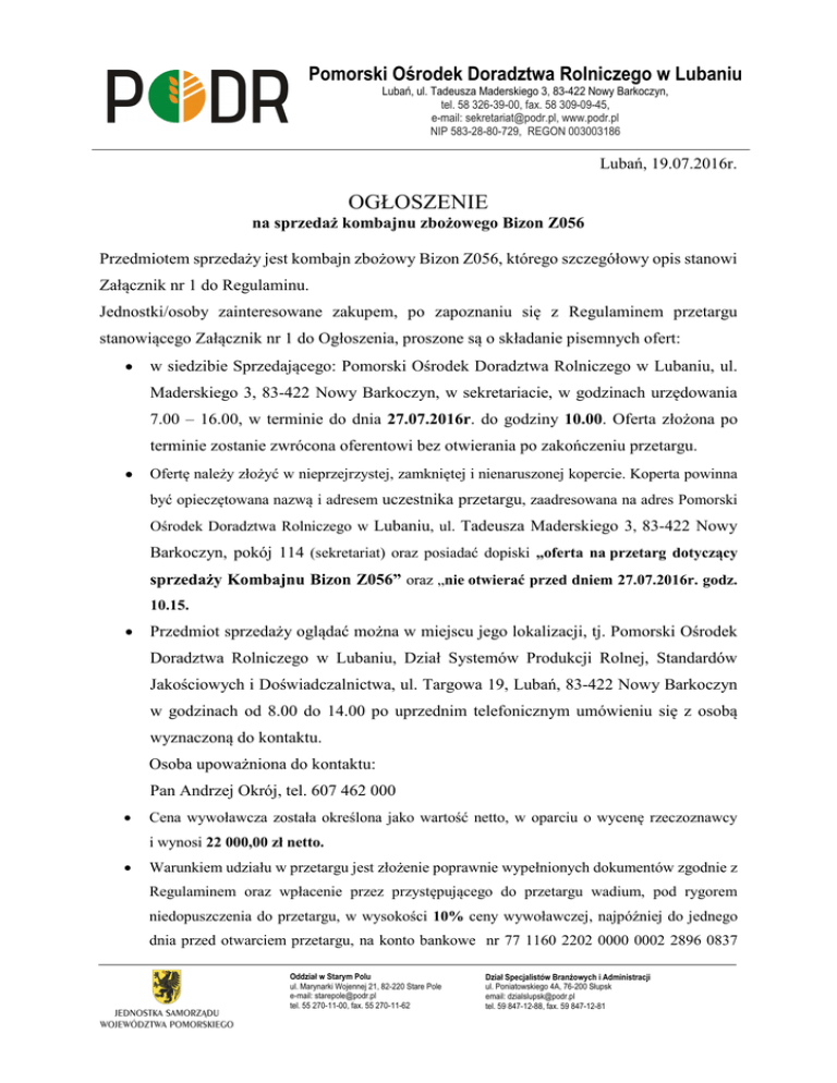 Pomorski Ośrodek Doradztwa Rolniczego w Lubaniu Lubań, ul. Tadeusza Maderskiego 3, 83-422 Nowy Barkoczyn, tel. 58 326-39-00, fax. 58 309-09-45, e-mail: [email protected], www.podr.pl NIP 583-28-80-729, REGON 003003186 Lubań, 19.07.2016r. OGŁOSZENIE na sprzedaż kombajnu zbożowego Bizon Z056 Przedmiotem sprzedaży jest kombajn zbożowy Bizon Z056, którego szczegółowy opis stanowi Załącznik nr 1 do Regulaminu. Jednostki/osoby zainteresowane zakupem, po zapoznaniu się z Regulaminem przetargu stanowiącego Załącznik nr 1 do Ogłoszenia, proszone są o składanie pisemnych ofert: • w siedzibie Sprzedającego: Pomorski Ośrodek Doradztwa Rolniczego w Lubaniu, ul. Maderskiego 3, 83-422 Nowy Barkoczyn, w sekretariacie, w godzinach urzędowania 7.00 – 16.00, w terminie do dnia 27.07.2016r. do godziny 10.00. Oferta złożona po terminie zostanie zwrócona oferentowi bez otwierania po zakończeniu przetargu. • Ofertę należy złożyć w nieprzejrzystej, zamkniętej i nienaruszonej kopercie. Koperta powinna być opieczętowana nazwą i adresem uczestnika przetargu, zaadresowana na adres Pomorski Ośrodek Doradztwa Rolniczego w Lubaniu, ul. Tadeusza Maderskiego 3, 83-422 Nowy Barkoczyn, pokój 114 (sekretariat) oraz posiadać dopiski „oferta na przetarg dotyczący sprzedaży Kombajnu Bizon Z056” oraz „nie otwierać przed dniem 27.07.2016r. godz. 10.15. • Przedmiot sprzedaży oglądać można w miejscu jego lokalizacji, tj. Pomorski Ośrodek Doradztwa Rolniczego w Lubaniu, Dział Systemów Produkcji Rolnej, Standardów Jakościowych i Doświadczalnictwa, ul. Targowa 19, Lubań, 83-422 Nowy Barkoczyn w godzinach od 8.00 do 14.00 po uprzednim telefonicznym umówieniu się z osobą wyznaczoną do kontaktu. Osoba upoważniona do kontaktu: Pan Andrzej Okrój, tel. 607 462 000 • Cena wywoławcza została określona jako wartość netto, w oparciu o wycenę rzeczoznawcy i wynosi 22 000,00 zł netto. • Warunkiem udziału w przetargu jest złożenie poprawnie wypełnionych dokumentów zgodnie z Regulaminem oraz wpłacenie przez przystępującego do przetargu wadium, pod rygorem niedopuszczenia do przetargu, w wysokości 10% ceny wywoławczej, najpóźniej do jednego dnia przed otwarciem przetargu, na konto bankowe nr 77 1160 2202 0000 0002 2896 0837 Oddział w Starym Polu ul. Marynarki Wojennej 21, 82-220 Stare Pole e-mail: [email protected] tel. 55 270-11-00, fax. 55 270-11-62 Dział Specjalistów Branżowych i Administracji ul. Poniatowskiego 4A, 76-200 Słupsk email: [email protected] tel. 59 847-12-88, fax. 59 847-12-81 Bank Millennium (w tytule przelewu proszę wpisać „Wadium za kombajn”) lub w Kasie PODR w Lubaniu mieszczącego się przy ul. Maderskiego 3, w dni robocze, w godz. 8-10. • Wysokość wadium wynosi 2 200,00 zł netto. • Otwarcie ofert nastąpi w dniu 27.07.2016r. o godz. 10.15 w siedzibie Sprzedającego w Lubaniu, ul. Maderskiego 3, pokój 001 „sala konferencyjna”. • Przetarg jest ważny bez względu na liczbę uczestników, jeżeli chociaż jeden uczestnik przystąpi do niego i zaoferuje stawkę wyższą, niż stawka wywoławcza. • Informacja o wyborze oferty zostanie ogłoszona na stronie internetowej PODR pod adresem www.podr.pl. • Sprzedający ma prawo zamknięcia/unieważnienia przetargu na każdym etapie bez podawania przyczyn. Z tytułu zamknięcia/unieważnienia przetargu lub odrzucenia oferty Jednostce/osobie zainteresowanej zakupem nie przysługuje żadne roszczenie wobec Organizatora TERMIN SKŁADANIA OFERT Ofertę należy złożyć w siedzibie Sprzedającego: Pomorski Ośrodek Doradztwa Rolniczego w Lubaniu ul. Maderskiego 3, Lubań, 83-422 Nowy Barkoczyn tel.58 326-39-00, fax. 58 309-09-45, email: [email protected] , www.podr.pl Do dnia 27.07.2016r. Do godziny 10.00 Załączniki: 1) Regulamin- Załącznik nr 1 2) Szczegółowy opis kombajnu- Załącznik nr 1 do Regulaminu Oddział w Starym Polu ul. Marynarki Wojennej 21 82-220 Stare Pole e-mail: [email protected] tel. 55 270-11-11, fax. 55 270-11-62 Oddział w Słupsku ul. Poniatowskiego 4A, 76-200 Słupsk email: [email protected] tel. 59 847-12-88, fax. 59 847-12-81 Dział Systemów Produkcji Rolnej, Standardów Jakościowych i Doświadczalnictwa Lubań, 83-422 Nowy Barkoczyn e-mail:[email protected] tel. 58 688-20-11, fax. 58 688-22-52