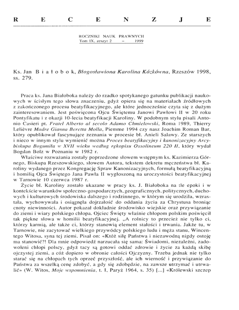 R E C E RO CZN IKI N NAUK T o m IX , z e s z y t 2 Z J E PRAW NYCH - 1999 Ks. Jan B i a 1 o b o k, B ło g o s ła w io n a K a r o lin a K ó z k ó w n a , R z e s z ó w 1998, ss. 279. Praca ks. Jana Białoboka należy do rzadko spotykanego gatunku publikacji n a u k o wych w ścisłym tego słow a znaczeniu, gdyż op ie ra się na m ateriałach źródło w ych z zakończonego procesu beatyfikacyjnego, ale które je d n o cz eśn ie czyta się z dużym zainteresowaniem. Jest pośw ięcon a Ojcu Św iętem u Jano w i Paw łow i II w 20 roku Pontyfikatu i z okazji 10-lecia beatyfikacji Karoliny. W podo bnym stylu pisali A n to nio Casieri pt. Fratel A lberto al secolo A d a m o C h m ielo w ski, R om a 1989, T hierry Lelievre M ądre Gianna Beretta M olla, P iem m e 1994 czy nasz Joachim R o m an Bar, który opublikow ał fascynujące zeznania w procesie bł. Anieli Salawy. Ze starszych i nieco w innym stylu w ym ienić m ożna P roces b eatyfika c yjny i kanonizacyjny A r c y biskupa Bogum iła ir X V II wieku według rękopisu O ssolineum 2 20 II, który w ydał Bogdan Bolz w Poznaniu w 1982 r. W łaściw e rozw ażania zostały poprzedzone słow em w stę pny m ks. K az im ie rz a G ó r nego, Biskupa R zeszow skiego, słow em A utora, tekstem dekretu m ę cz eństw a bł. K a roliny w ydanego przez K ongregację Spraw K an onizacyjn ych, fo rm u łą b ea tyfikac y jną i hom ilią Ojca Świętego Jana P aw ła II w y g ło sz o n ą na uroczystości beatyfikacyjnej w T arnow ie 10 czerw ca 1987 r. Życie bł. Karoliny zostało ukazane w pracy ks. J. B iałobok a na tle epoki i w kontekście w arunków społeczno-gospodarczy ch, geo graficzn ych, politycznych, d u c h o wych i kulturowych środow iska dalszego i rodzinnego, w którym się urodziła, w z r a s tała, w ych ow yw ała i osiągnęła dojrzałość do od d an ia życia za C hrystusa broniąc cnoty niewinności. Autor pokazał dokładnie środo w isk o wiejskie oraz przyw iązan ie do ziemi i wiary polskiego chłopa. O jciec Święty w łaśnie chłopo m polskim pośw ięcił tak piękne słowa w homilii beatyfikacyjnej. „A rolnicy to przecież nie tylko ci, którzy karmią, ale także ci, którzy stanow ią elem e n t stałości i trwania. Jakże tu, w T arnowie, nie zacytować w ielkiego przyw ó dcy polskiego ludu i m ęża stanu, W i n c e n tego W itosa, syna tej ziemi. Pisał on: «K tóż siłę P ań stw a i nieza w o d n ą nigdy ostoję m a stanowić?! Dla mnie o d pow iedź narzucała się sama: Ś w iadom i, niezależni, z a d o woleni chłopi polscy, gdyż tacy są gotowi oddać zdrow ie i życie za k a ż d ą skibę ojczystej ziemi, a cóż dopiero w obronie całości O jczyzny. T rzeba jednak nie tylko starać się na chłopach tych oprzeć przyszłość, ale ich w ierność i przyw iązanie do Państwa za w szelką cenę zdobyć, a gdy się zdobędzie, na zaw sze utrzym ać i u tr w a lić» (W. Witos, M oje wspom nienia, t. I, Paryż 1964, s. 35) [...] «K rólew ski szczep P iastow y» (M. K onopnicka, Rota): S ynow ie i Córki tego szczepu, tu od Wisły do K arpat, trwajcie przy tym dziedzictwie! D o W as należy królestwo niebieskie!” D okładność, precy zja naukow a, liczne zdjęcia i m apy „sztabow e” dokładnie orien tują o terenie i środow isku. Z ainteresow a nie, jakie w zbudza om aw iana pozycja, jest w y n ik ie m d robiazgow ych i w ielopłaszcz yzno w yc h badań Autora. Widać z tego, jak A u tor pow ażnie traktował swój obo w iąz ek postulatora diecezjalnego w tej sprawie. Ś rod o w isk o je st bardzo w ażne w ukształtow aniu świętego. Do tegoż środow iska w iejskiego Ojciec Święty skierow ał w homilii beatyfikacyjnej słowa przesłania: „W sposób szczególny pragnę się zw rócić w dniu beatyfikacji tej Córki polskiej wsi z początku naszego stulecia do tych, których pow ołaniem życiow ym - rów nież i d z i siaj, przy końcu tego w ieku - je st życie wiejskie i praca na roli. Do polskich chło pów obecnych tu poprzez ich delegacje z całego kraju. Jakże to znamienne, że w nauczaniu o królestw ie B ożym C hrystu s posługiw ał się analogią i obrazami za cz erp niętymi z życia natury i w yrastającej z niego - poprzez działanie człow ieka - kultu ry r o ln ic zej” . W II rozdziale pracy zn ajdujem y o m ów ienie osobow ości bł. Karoliny K ózków ny. I znow u tutaj m am y do czyn ienia z ty p o w ą rzetelnością dla dochodzeń w procesie k an o nizacyjny m . A utor w y chod ząc od predyspozycji naturalnych otrzym anych w genach, przeszedł do o m ó w ie n ia sylw etki duchow ej Karoliny, by wreszcie na tym tle u k azać działanie łaski n adp rzyrodzon ej w praktykow aniu cnót chrześcijańskich. Takie oprac o w a n ie w procesach k an oniza cy jnyc h m a w ielką w artość, gdyż pozw ala gre m io m oceniającym w K ongregacji lepiej zrozum ieć wysiłek kandydata na ołtarze zm ierzający do w spółpracy z ła sk ą w celu najściślejszego zjednoczenia się z C h ry stu sem, czyli istoty świętości. T akich p o głębionych studiów nad życiem Sługi Bożego d o m a g a się często K ongregacja, gdy przystępuje do opracow ania Positio, czyli zbioru dok um e n tac ji na tem at św iętości życia, m ęcz eń stw a lub cudu. N iekiedy zachodzi kon ieczność tak szczegó łow ych badań, gdy zaistnieją jak ieś wątpliwości lub trudności w spraw ie. A utor opisując charakter, fizjonom ię, predyspozycje psychiczne, jak e m ocjona ln ość , aktyw ność, inteligencję, posłużył się m etodam i stosowanym i w nau kach psychologii em pirycznej i w etyce. U kazując świętość życia Koroliny, przeja w iając ą się w praktykow aniu cn ó t w stopniu heroicznym , Autor wykazał, że była ona d obrze przy g o to w a n a duch ow o do tego najw ięk szego aktu miłości, jakim jest m ę czeństw o. Jest to niezm iernie w ażne w przypadkach, kiedy m o g ą zaistnieć trudności d etaliczn ego u d o w odnien ia osta