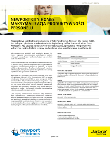 historia klienta Newport City Homes maksymalizacja produktywności personelu Niezarobkowa spółdzielnia mieszkaniowa z Walii Południowej, Newport City Homes (NCH), jest jednym z pionierów w zakresie wdrożenia platformy Unified Communications firmy Microsoft®. Aby uzyskać pełne korzyści tego rozwiązania, spółdzielnia NCH postanowiła wdrożyć w swoich działach zestawy słuchawkowe Jabra współpracujące z platformą UC. Jako zarejestrowany właściciel lokali socjalnych, Newport City Homes zapewnia zakwaterowanie potrzebującym osobom w Newport, we współpracy z lokalnymi władzami oraz ośrodkiem służb mieszkaniowych. Zespół spółdzielni obejmuje urzędników dzielnicowych oraz zespoły administracyjne, które bezpośrednio współpracują z osobamiz potrzebami mieszkaniowymi, zarówno w biurze jak i w terenie, a także obejmuje doradców ds. usług mieszkaniowych w centrum informacyjnym, którzy stanowią dział obsługi klienta NCH i zajmują się telefonicznie zgłaszanymi zapytaniami. Spółdzielnia NCH była jedną z pierwszych organizacji, które wdrożyły platformę Microsoft Office Communicator 2007, rezygnując z tradycyjnej formy telefonii PBX na rzecz rozwiązania Unified Communications (UC), w celu zwiększenia produktywności i ułatwienia współpracy pomiędzy poszczególnymi zespołami roboczymi. Aby uzyskać maksymalne korzyści wdrożenia platformy UC, spółdzielnia NCH postanowiła wyposażyć swoje zespoły w zestawy słuchawkowe zgodne z platformą UC. Wyjaśnił to Darren Lloyd, dyrektor ds. usług informacyjnych w NCH: „Nasi urzędnicy dzielnicowi oraz doradcy ds. usług mieszkaniowych często korzystają z telefonu przy wykonywaniu swoich obowiązków służbowych i wielu z nich podczas rozmów musi wykonywać wiele innych czynności. Wiedzieliśmy, że zestawy słuchawkowe zwiększą produktywność, ale również chcieliśmy mieć pewność, że te zestawy słuchawkowe będą współpracować z platformą UC, tak abyśmy mogli w pełni wykorzystać możliwości inwestycji”. Firma Klient: Newport City Homes Witryna internetowa: www.newportcityhomes.com Wielkość klienta: Ponad 350 pracowników Kraj: Wielka Brytania Branża: Usługi profesjonalne wyzwanie biznesowe Spółdzielnia NCH postanowiła wyposażyć swoje zespoły w zestawy słuchawkowe zgodne z platformą UC, aby w pełni wykorzystać wdrożenie platformy UC. Profil Spółdzielnia Newport City Homes (NCH) jest organizacją niezarobkową, która obsługuje ponad 10 000 mieszkańców, najemców oraz współnajemców w Newport, w Walii Południowej. NCH posiada dwa sąsiadujące ze sobą biura i dwa biura okręgowe w Newport. Dzięki temu mieszkańcy mogą wstąpić do biura w celu uzyskania porady, porozmawiania o różnych zagadnienia lub spotkania się z pracownikiem. system telefoniczny Microsoft® Office Communicator ROZWIĄZANIE JABRA JABRA BIZ™ 620 USB, JABRA BIZ™ 2400 USB, JABRA GN9330e USB Liczba urządzeń: 50 KORZYŚCI BIZNESOWE Maksymalna produktywność. Swoboda ruchu podczas rozmowy. Ograniczenie administracji i kosztów. jabra.com historia klienta „Rozpatrywaliśmy innych dostawców zestawów słuchawkowych, ale żaden z nich nie oferował tak kompleksowej usługi profilowania klienta, co oznacza, że każdy pracownik posiada rozwiązanie dostosowane do swoich potrzeb. Zestawy słuchawkowe Jabra również oferują znacznie więcej funkcji niż produkty konkurencji”. Darren Lloyd, dyrektor ds. usług informacyjnych, Newport City Homes Rozwiązanie Jabra Spółdzielnia NCH wzięła udział w programie Jabra Jump – jest to program, który określa optymalne urządzenie dźwiękowe Jabra dla określonej funkcji roboczej. Kombinacja bezprzewodowych i przewodowych zestawów słuchawkowych współpracujących z platformą UC, uwzględniając potrzeby każdego pracownika. „Zestawy słuchawkowe Jabra oferują redukcję szumów, technologię szerokopasmową oraz ochronę słuchu, zapewniając krystalicznie czystą jakość dźwięku, brak frustracji podczas rozmów oraz komfort dla pracowników, którzy korzystają z telefonu przez wiele godzin dziennie”. W lipcu 2010 roku zostały wdrożone trzy zestawy słuchawkowe: - Jabra Biz™ 620 USB – przewodowy, jednosłuchawkowy zestaw słuchawkowy z mikrofonem z funkcją redukcji szumów oraz dźwiękiem szerokopasmowym - Jabra Biz™ 2400 USB – przewodowy, dwusłuchwkowy zestaw słuchawkowy z interfejsem Bluetooth®, dźwiękiem szerokopasmowym oraz programowanymi przyciskami zapewniającymi łatwe odbieranie/kończenie połączeń - Jabra GN9330e USB – bezprzewodowy, jednosłuchawkowy zestaw słuchawkowy z funkcją cyfrowego przetwarzania dźwięku, która zapewnia wyraźny, czysty dźwięk szerokopasmowy Plug and play Oprócz korzyści dla personelu obsługi klienta wdrożenie zestawów słuchawkowych Jabra również pozytywnie wpłynęło na zespół usług informacyjnych. Darren Lloyd komentuje: „Rozpatrywaliśmy innych dostawców zestawów słuchawkowych, ale żaden z nich nie oferował tak kompleksowej usługi profilowania klienta, co oznacza, że każdy pracownik posiada rozwiązanie dostosowane do swoich potrzeb. Zestawy słuchawkowe Jabra również oferują znacznie więcej funkcji niż produkty konkurencji”. MAKSYMALIZACJA produktywności w środowisku UC Korzyści nowych zestawów słuchawkowych były oczywiste – niektórzy pracownicy NCH oszczędzają nawet sześć minut w przypadku każdej rozmowy, dzięki zestawowi słuchawkowemu współpracującemu z platformą UC. W rezultacie każdego dnia mogą zaoszczędzić do dwóch godzin*. CS_NEWPORT_PL_50013_V02_1204 „Poprzez dodanie zestawów słuchawkowych zoptymalizowanych do współpracy z platformą UC nasi pracownicy mogą w tej samej chwili rozmawiać ze współpracownikami, jednocześnie korzystając z aplikacji lub wyszukując informacji, co zapewnia szybkie załatwianie spraw oraz gwarantuje rozmówcy wysoką jakość połączenia i obs
