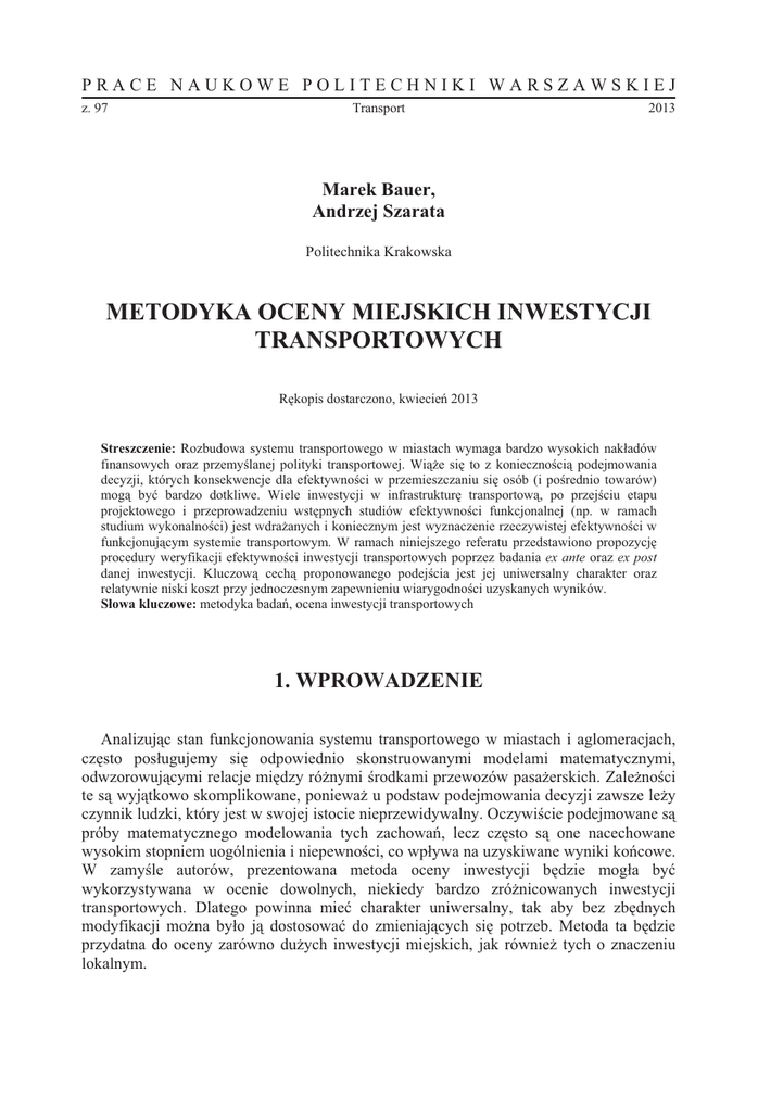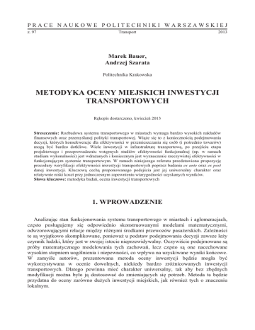 PRACE NAUKOWE POLITECHNIKI WARSZAWSKIEJ z. 97 Transport 2013 Marek Bauer, Andrzej Szarata Politechnika Krakowska METODYKA OCENY MIEJSKICH INWESTYCJI TRANSPORTOWYCH Rkopis dostarczono, kwiecie 2013 Streszczenie: Rozbudowa systemu transportowego w miastach wymaga bardzo wysokich nakadów finansowych oraz przemylanej polityki transportowej. Wie si to z koniecznoci podejmowania decyzji, których konsekwencje dla efektywnoci w przemieszczaniu si osób (i porednio towarów) mog by bardzo dotkliwe. Wiele inwestycji w infrastruktur transportow, po przejciu etapu projektowego i przeprowadzeniu wstpnych studiów efektywnoci funkcjonalnej (np. w ramach studium wykonalnoci) jest wdraanych i koniecznym jest wyznaczenie rzeczywistej efektywnoci w funkcjonujcym systemie transportowym. W ramach niniejszego referatu przedstawiono propozycj procedury weryfikacji efektywnoci inwestycji transportowych poprzez badania ex ante oraz ex post danej inwestycji. Kluczow cech proponowanego podejcia jest jej uniwersalny charakter oraz relatywnie niski koszt przy jednoczesnym zapewnieniu wiarygodnoci uzyskanych wyników. Sowa kluczowe: metodyka bada, ocena inwestycji transportowych 1. WPROWADZENIE Analizujc stan funkcjonowania systemu transportowego w miastach i aglomeracjach, czsto posugujemy si odpowiednio skonstruowanymi modelami matematycznymi, odwzorowujcymi relacje midzy rónymi rodkami przewozów pasaerskich. Zalenoci te s wyjtkowo skomplikowane, poniewa u podstaw podejmowania decyzji zawsze ley czynnik ludzki, który jest w swojej istocie nieprzewidywalny. Oczywicie podejmowane s próby matematycznego modelowania tych zachowa, lecz czsto s one nacechowane wysokim stopniem uogólnienia i niepewnoci, co wpywa na uzyskiwane wyniki kocowe. W zamyle autorów, prezentowana metoda oceny inwestycji bdzie moga by wykorzystywana w ocenie dowolnych, niekiedy bardzo zrónicowanych inwestycji transportowych. Dlatego powinna mie charakter uniwersalny, tak aby bez zbdnych modyfikacji mona byo j dostosowa do zmieniajcych si potrzeb. Metoda ta bdzie przydatna do oceny zarówno duych inwestycji miejskich, jak równie tych o znaczeniu lokalnym. 20 Marek Bauer, Andrzej Szarata Proponowana metoda bazuje na porównaniu sytuacji ruchowej przed i po wdroeniu inwestycji o charakterze transportowym. Jej podstawow cech jest prostota wykonania potrzebnych bada i analiz statystycznych. Bdzie mona z niej korzysta w ocenie wszystkich inwestycji zmierzajcych do poprawy warunków przejazdu pojazdów miejskiej komunikacji zbiorowej i indywidualnej. Dlatego ocenie powinny by poddawane efekty o charakterze ogólnym, stosunkowo atwe do ustalenia w wyniku wykonania mao skomplikowanych pomiarów. Efekty te powinny by tosame z efektami odczuwanymi przez codziennych uytkowników analizowanej infrastruktury transportowej. Dlatego równie zastosowane wska niki oceny musz umoliwia jednoznaczn ocen efektywnoci inwestycji. Zastosowanie proponowanej metody nie powinno wyklucza innych analiz o wyszym poziomie szczegóowoci, jeli podmiot oceniajcy uzna je za celowe. W duym uproszczeniu, inwestycje transportowe mona podzieli na zwizane z transportem zbiorowym i indywidualnym oraz inwestycje o charakterze mieszanym. Dla potrzeb niniejszej metodyki podzielono je na 3 grupy. Przynaleno do jednej z grup inwestycji powinna wynika gównie z zakresu zmian dotykajcych poszczególne rodzaje transportu (Tablica 1). Tablica 1 Grupy inwestycji transportowych Grupa inwestycji A B C Opis inwestycji Inwestycje dotyczce tylko transportu zbiorowego, nie majce bezporedniego wpywu na funkcjonowanie transportu indywidualnego na analizowanym cigu ulic (np. modernizacja wydzielonego torowiska tramwajowego, prowadzonego niezalenie od jezdni ulicy) Inwestycje dotyczce transportu zbiorowego i indywidualnego, w których transport zbiorowy jest traktowany priorytetowo (np. modernizacja wydzielonego torowiska tramwajowego w pasie dzielcym lub w ssiedztwie ulicy, budowa pasa autobusowego w jezdni ulicy, budowa systemu sterowania na cigu komunikacyjnym pod ktem wprowadzenia priorytetów dla pojazdów transportu zbiorowego) Inwestycje dotyczce transportu indywidualnego, oraz w znikomym stopniu transportu zbiorowego, który korzysta z ogólnodostpnych pasów ruchu (np. modernizacja jezdni ulicy, budowa systemu sterowania obszarowego bez priorytetów dla transportu zbiorowego) 2. ZAKRES I SPOSÓB WYKONANIA POMIARÓW Proponowane podejcie do oceny efektywnoci danych inwestycji, oparto na analizie dwóch podstawowych parametrów: • Czasu przejazdu [min], badanego w odniesieniu bd do caego korytarza transportowego, bd do poszczególnych jego odcinków, w ustalonych jednolitych okresach funkcjonowania (przynajmniej w okresie jednego ze szczytów komunikacyjnych w przecitnym dniu roboczym). Czas ten jest mierzony od momentu wjazdu do momentu Metodyka oceny miejskich inwestycji transportowych 21 zjazdu z tego cigu, a w przypadku gdy w wyniku wdroenia inwestycji nastpia zmiana dugoci korytarza transportowego lub jego odcinków skadowych, mona opcjonalnie porówna prdko ci przejazdu [km/h]. • Wielko ci potoków pasaerskich na poszczególnych odcinkach korytarza transportowego, badanych w pojazdach transportu zbiorowego i/lub indywidualnego, wyraanego liczb pasaerów w jednej godzinie analizy. W tablicy 2 przedstawiono proponowany zakres prowadzonych analiz w zalenoci od przynalenoci inwestycji do jednej z grup. Tablica 2 Zakres prowadzonych pomiarów w zaleno ci od rodzaju inwestycji Grupa inwestycji A B C Transport zbiorowy Czas przejazdu Liczba [minuty] pasaerów ([sekundy]) [osoby/h] TAK TAK TAK TAK NIE (TAK) NIE (TAK) Transport indywidualny Czas przejazdu Liczba [minuty] pasaerów ([sekundy]) [osoby/h] NIE NIE TAK TAK TAK TAK Uwzgldnienie powyszych wska ników oceny umoliwi nie tylko okrelenie bezporedniego efektu inwestycji jakim jest zmiana czasu przejazdu, ale take umoliwi okrelenie wpywu inwestycji na zmiany zachowa transportowych podróujcych, wyraane midzy innymi zmian rodka transportu