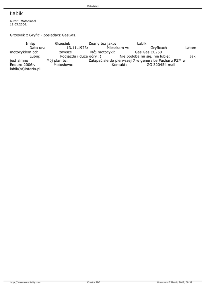 Motodiably Łabik Autor: Motodiabel 12.03.2006. Grzesiek z Gryfic - posiadacz GasGas. Imię: Grzesiek Znany też jako: Łabik Data ur.: 13.11.1973r Mieszkam w: Gryficach Latam motocyklem od: zawsze Mój motocykl: Gas Gas EC250 Lubię: Podjazdu i duże góry :) Nie podoba mi się, nie lubię: Jak jest zimno Mój plan to: Załapać sie do pierwszej 7 w generalce Pucharu PZM w Enduro 2006r. Motosłowo: Kontakt: GG 320454 mail labik(at)interia.pl http://www.motodiably.com Kreator PDF Utworzono 7 March, 2017, 00:39
