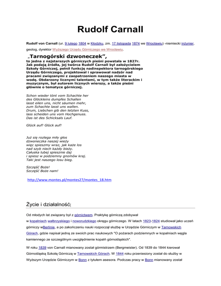 Rudolf Carnall Rudolf von Carnall (ur. 9 lutego 1804 w Kłodzku, zm. 17 listopada 1874 we Wrocławiu) -niemiecki inżynier, geolog, dyrektor Wyższego Urzędu Górniczego we Wrocławiu. „Tarnogórski dzwoneczek”, to jedna z najstarszych górniczych pieśni powstała w 1827r. Jak podają źródła, jej twórca Rudolf Carnall był założycielem Szkoły Górniczej, pełnił funkcję nadinspektora tarnogórskiego Urzędu Górniczego, projektował i sprawował nadzór nad pracami związanymi z zaopatrzeniem naszego miasta w wodę. Obdarzony licznymi talentami, w tym także literackim i muzycznym, był autorem licznych wierszy, a także pieśni głównie o tematyce górniczej. Schon wieder tönt vom Schachte her des Glöckleins dumpfes Schallen lasst eilen uns, nicht säumen mehr, zum Schachte lasst uns wallen. Drum, Liebchen gib den letzten Kuss, lass scheiden uns vom Hochgenuss. Das ist des Schicksals Lauf. Glück auf! Glück auf! Już się rozlega miły głos dzwoneczka naszej wieży więc spieszmy wraz, jak każe los nad szyb niech każdy bieży. Całuska lubej spiesznie daj i spiesz w podziemny gnomów kraj. Taki jest naszego losu bieg. Szczęść Boże! Szczęść Boże nam! http://www.montes.pl/montes27/montes_18.htm Życie i działalność[ Od młodych lat związany był z górnictwem. Praktykę górniczą zdobywał w kopalniach wałbrzyskiego i noworudzkiego okręgu górniczego. W latach 1823-1824 studiował jako uczeń górniczy wBerlinie, a po zakończeniu nauki rozpoczął służbę w Urzędzie Górniczym w Tarnowskich Górach, gdzie napisał jedną ze swoich prac naukowych "O pożarach podziemnych w kopalniach węgla kamiennego ze szczególnym uwzględnienie kopalń górnośląskich". W roku 1839 von Carnall mianowany został górmistrzem (Bergmeister). Od 1839 do 1844 kierował Górnośląską Szkołą Górniczą w Tarnowskich Górach. W 1844 roku przeniesiony został do służby w Wyższym Urzędzie Górniczym w Bonn z tytułem asesora. Podczas pracy w Bonn mianowany został starszym radcą górniczym (Oberbergrat), a w 1847 roku – tajnym radcą górniczym (Geheimer Bergrat). Od 1848 roku pracował w Wydziale Górnictwa, Hutnictwa i Salin w Ministerstwie Handlu, Przemysłu i Robót Publicznych w Berlinie, gdzie pracował przez kolejne 8 lat. W roku 1856 mianowany został starostą górniczym (Berghauptmann) i dyrektorem Wyższego Urzędu Górniczego we Wrocławiu. Dla śląskiego przemysłu pracował do 1861 roku, kiedy to przeszedł w stan spoczynku. Był jednym z założycieli i długoletnim prezesem powstałego w 1848 roku Niemieckiego Towarzystwa Geologicznego (Deutsche Geologische Geselschaft. W latach 1853-1858 był takżeredaktorem czasopisma Zeitschrift für Berg-, Hütten- und Salinenwesen im preussischen Staate. Jest także autorem wielu rysunków technicznych, projektów i map geologicznych. Część z nich, z autografem autora znajduje się obecnie w zbiorach Muzeum Górnictwa Węglowego w Zabrzu. Od jego nazwiska nazywano wiele szybów kopalnianych. Jednym z nich jest szyb Carnall byłej kopalni Zabrze, który obecnie przystosowywany jest do pełnienia roli punktu widokowego i atrakcjiSkansenu górniczego "Królowa Luiza" w Zabrzu. Od nazwiska Carnalla nazwano także jeden z minerałów: karnalit. W czerwcu 2011 uchwałą Rady Miejskiej w Tarnowskich Górach jedną z ulic ŚródmieściaCentrum nazwano jego imieniem[1] Bibliografia[edytuj | edytuj kod] 1. Jerzy Jaros, Rudolfa von Carnalla "O pożarach podziemnych w kopalniach węgla kamiennego, ze szczególnym uwzględnieniem kopalń górnośląskich", (w:) Studia z Dziejów Górnictwa i Hutnictwa, t. IV, pod red. J. Pazdura, Warszawa 1960. http://pl.wikipedia.org/wiki/Rudolf_von_Carnall MONTES NUMER 41 - GRUDZIEŃ 2009 Zapomniany Carnall Wł. Deutsches Bergbau-Museum Bochum, fot. Muzeum w Tarnowskich Górach. Źródło: R. Slotta, Das Carnall-Service.., Bochum 1985 w: Historia Tarnowskich Gór CZĘŚĆ II Carnall tworzył poezję, pisał wiersze, znaczna ilość z nich przeznaczona była do śpiewania. Jedna z pieśni przebiła wszakże sławą wszelkie pozostałe. „Dzwoneczek Tarnogórski” („Das Tarnowitzer Glocklein”) w okresie rozwoju górnictwa i przynależności Śląska do kultury niemieckiej (a więc przez ponad 100 lat) był właściwie hymnem górniczym, piosenką śpiewaną nie tylko w środowiskach związanych z górnictwem, nie tylko na Górnym Śląsku. Był pieśnią górników, piosenką o Górnym Śląsku, nawiązywał jednak najsilniej do tradycji Wolnego Miasta Górniczego – Tarnowskich Gór. Rola pieśni i jej twórcy w rozpowszechnianiu etosu górniczej, śląskiej pracy – sumiennej, odpowiedzialnej, niebezpiecznej, z nadzwyczaj silną więzią z rodziną i Bogiem wydaje się być główną i niezastąpioną. Wizerunek Tarnowskich Gór jako kolebki i ośrodka górnictwa ugruntował się dzięki „dzwoneczkowi” na długo, silnie i w najdalszych zakątkach. Pieśń ta znalazła się w rękopiśmiennym śpiewniku Carnalla z 1827 roku, z dopiskiem „August 1827” („Sierpień 1827”). Nadszedł czas na renesans tego utworu, na włączenie go do śpiewników pieśni chóralnych i biesiadnych. Swą melodyjnością, a przede wszystkim treścią, jest w stanie przyćmić wiele pozostałych. Do tej pory popularyzatorami pieśni byli głównie członkowie Stowarzyszenia Miłośników Ziemi Tarnogórskiej, którym i za to należą się nasze podziękowania. Niezorientowanym i zaciekawionym przedstawmy tłumaczenie pierwszej zwrotki, dokonane przez kronikarza i księgarza Jana Nowaka w 1927 roku: Już się odzywa miły głos Dzwoneczka z naszej wieży Więc spieszmy wraz, jak każe los Na szyb niech każdy bieży Całuska prędko lubej daj I spiesz w podziemny gnomów kraj Nas czeka praca tam Szczęść nam, Szczęść nam, Szczęść Boże nam! Nie takiej działalności zamierzał się Rudolf von Carnall wszakże poświęcić. Chętnie zrezygnowałby z proszonych obiadów, by spoż
