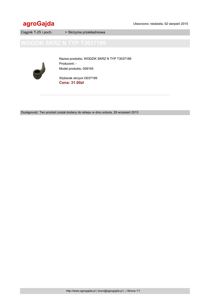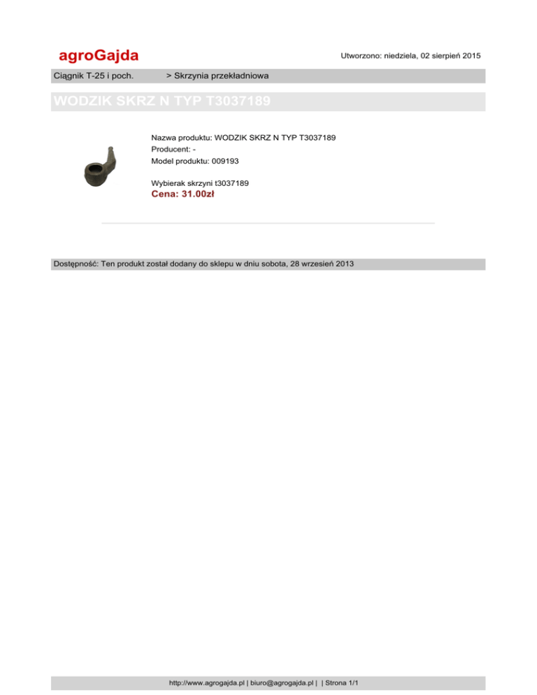 agroGajda Ciągnik T-25 i poch. Utworzono: niedziela, 02 sierpień 2015 > Skrzynia przekładniowa WODZIK SKRZ N TYP T3037189 Nazwa produktu: WODZIK SKRZ N TYP T3037189 Producent: Model produktu: 009193 Wybierak skrzyni t3037189 Cena: 31.00zł Dostępność: Ten produkt został dodany do sklepu w dniu sobota, 28 wrzesień 2013 http://www.agrogajda.pl | [email protected] | | Strona 1/1