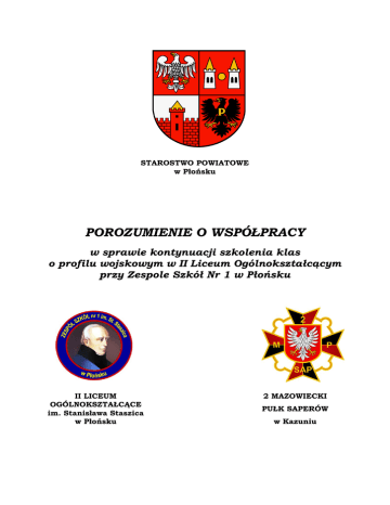 STAROSTWO POWIATOWE w Płońsku POROZUMIENIE O WSPÓŁPRACY w sprawie kontynuacji szkolenia klas o profilu wojskowym w II Liceum Ogólnokształcącym przy Zespole Szkół Nr 1 w Płońsku II LICEUM OGÓLNOKSZTAŁCĄCE im. Stanisława Staszica w Płońsku 2 MAZOWIECKI PUŁK SAPERÓW w Kazuniu POROZUMIENIE O WSPÓŁPRACY zawarte w Kazuniu w dniu 1 września 2011 roku między Starostą Powiatu Płońskiego i Dowódcą 2. Pułku Saperów w Kazuniu w sprawie kontynuacji szkolenia klas o profilu wojskowym w II Liceum Ogólnokształcącym przy Zespole Szkół Nr 1 w Płońsku. Na podstawie "Porozumienia zawartego w dniu 2 kwietnia 2003 roku między Starostą Powiatu Płońskiego i Dowódcą 2. Mazowieckiej Brygady Saperów", "Porozumienia o współpracy między Ministrem Edukacji Narodowej i Ministrem Obrony Narodowej zawartego w dniu 21 października 2008 roku", a także "Decyzji Ministra Obrony Narodowej Nr 187/MON z dnia 9 czerwca 2009 roku w sprawie wprowadzenia zasad współpracy resortu obrony narodowej z organizacjami pozarządowymi i innymi partnerami społecznymi", wspomniane strony zawierają niniejsze porozumienie. §1 W rozumieniu niniejszego porozumienia poszczególne wyrażenia oznaczają: 1. Klasa o profilu wojskowym – klasa II Liceum Ogólnokształcącego przy Zespole Szkół Nr 1 w Płońsku, której młodzież uczestniczy w nauce rozszerzonego programu przysposobienia wojskowego i obronnego. 2. Jednostka Patronacka – 2 Pułk Saperów w Kazuniu. 3. Organ prowadzący szkołę – Starostwo Powiatowe w Płońsku. 4. Przedstawiciel – wyznaczony przez stronę Porozumienia żołnierz albo pracownik uprawniony do występowania w jej imieniu. 5. Udostępnienie terenu Jednostki Wojskowej – zezwolenie Dowódcy Jednostki Patronackiej na korzystanie przez ściśle określony czas z obiektów i terenów Jednostki Wojskowej do prowadzenia zajęć z Przysposobienia Obronnego. 1 §2 Strony będą ściśle współpracować podczas prowadzenia zajęć z zakresu edukacji obronnej młodzieży i realizacji przedsięwzięć promocji obronności wśród młodzieży szkolnej poprzez działania: 1. Popularyzowanie w środowisku wojskowym i szkolnym działań zmierzających do kształtowania świadomości historycznej i patriotyczno-obronnej młodzieży szkolnej. 2. Wspieranie i promowanie inicjatyw zmierzających do upowszechniania wśród młodzieży szkolnej tradycji oręża polskiego. 3. Wspieranie merytoryczno-organizacyjne szkół realizujących rozszerzony program przedmiotu Przysposobienie Obronne. 4. Upowszechnianie idei organizowania dla młodzieży szkolnej wycieczek do miejsc znaczących w dziejach oręża polskiego oraz wakacyjnych obozów o charakterze sportowo-obronnym. 5. Wspieranie idei organizowania "Dni otwartych koszar" oraz zwiedzania sal tradycji, izb pamięci, muzeów wojskowych i miejsc pamięci narodowej. 6. Wykorzystywanie doświadczeń w zakresie organizowania uroczystości o charakterze patriotycznym, konkursów wiedzy o historii oręża polskiego i obronności oraz turniejów i zawodów sportowych o charakterze proobronnym. 7. Inspirowanie środowisk szkolnych do uczestniczenia w uroczystościach o charakterze patriotycznym, apelach poległych oraz apelach pamięci organizowanych z okazji rocznic historycznych wydarzeń. §3 Utrzymane zostają klasy o profilu wojskowym (z rozszerzonym programem z przedmiotu Przysposobienie Obronne) w II Liceum Ogólnokształcącym przy Zespole Szkół Nr 1 w Płońsku. §4 Dowódca 2. Pułku Saperów zobowiązuje się do: 1. Uzgodnienia treści programu nauczania z z przedstawicielem II Liceum Ogólnokształcącego. 2 Przysposobienia Obronnego 2. Wyznaczenia przedstawiciela do współpracy podczas opracowywania programu nauczania. 3. Ujmowania w planie rocznym przedsięwzięć realizowanych na rzecz klas o profilu wojskowym oraz informowanie Dyrektora Szkoły o zmianie przedsięwzięć z miesięcznym wyprzedzeniem. 4. Wyznaczenia odpowiedzialnego za kontakty z Dyrektorem Szkoły oficera prowadzącego zajęcia na terenie Jednostki Patronackiej. 5. Udostępniania raz w miesiącu przykoszarowej bazy szkoleniowej do prowadzenia zajęć programowych. 6. Zabezpieczenia pod względem organizacyjnym i merytorycznym obozów szkoleniowo-wypoczynkowych uczniów klas o profilu wojskowym. 7. Udziału w zorganizowaniu egzaminów końcowych. §5 Starosta Powiatu Płońskiego zobowiązuje się do: 1. Zobligowania Dyrektora Szkoły do ścisłej współpracy z Dowódcą Jednostki Patronackiej podczas realizowania programu nauczania klas o profilu wojskowym. 2. Pokrywania kosztów związanych z dowozem młodzieży na zajęcia do Jednostki Patronackiej, przejazdu do miejsca organizacji obozu szkoleniowo- wypoczynkowego. 3. Pokrywania kosztów związanych z prowadzeniem zajęć przez oficerów w jednostce patronackiej oraz na obozie szkoleniowo-wypoczynkowym. 4. Zobowiązania Dyrektora Szkoły do określenia warunków, których spełnienie będzie podstawą do przyjęcia kandydata do klasy o profilu wojskowym: a) test sprawnościowy; b) rozmowa kwalifikacyjna; c) zaświadczenie o stanie zdrowia. 5. Zobowiązania Dyrektora Szkoły do zorganizowania wspólnie z Dowódcą Jednostki Patronackiej dwóch obozów szkoleniowo-wypoczynkowych dla młodzieży po zakończeniu pierwszego i drugiego roku nauki. Koszty pobytu kadry instruktorskiej i wychowawców na obozach sfinansuje Starostwo Powiatowe w Płońsku. 3 §6 1. Dyrektor Szkoły zawiadamia Mazowieckiego Kuratora Oświaty o utrzymaniu lub rozwiązaniu klas o profilu wojskowym. 2. Dowódca Jednostki Patronackiej zawiadamia przełożonego o zawarciu Porozumienia. §7 Dyrektor Szkoły zaopatrzy uczniów w umundurowanie i emblematy szkoły. §8 1. Za przestrzeganie zasad bezpieczeństwa uczniów w czasie zajęć z Przysposobienia Obronnego odpowiada każdorazowo prowadzący zajęcia. W zajęciach realizowanych na terenie Jednostki Patronackiej obowiązkowo uczestniczy wychowawca klasy. 2. W razie zaistnienia w