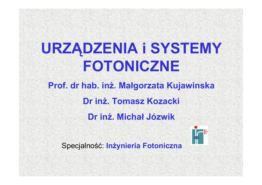 URZĄDZENIA i SYSTEMY FOTONICZNE Prof. dr hab. inż. Małgorzata Kujawinska Dr inż. Tomasz Kozacki Dr inż. Michał Józwik Specjalność: Inżynieria Fotoniczna USF_1 Wstęp – M.Kujawińska, T.Kozacki, M.Jóżwik 1-1 URZĄDZENIA I SYSTEMY FOTONICZNE Prowadzący: M. Kujawińska z udziałem T. Kozackiego i M. Józwika Wykład: 30 godz., Laboratorium: 30 godz. Egzamin z wykładu 60 pkt Zaliczenie z lab. 40 pkt Literatura podstawowa: 1. Gupta M.C.: Handbook of photonics, CRC Press, 1997 2. Domański A.W.: Układy i urządzenia optoelektroniczne, Wyd. w ramach "Tempus Series in Applied Physics", Oficyna Wyd. PW, Warszawa 1997 3. Saleh A.E., Teich M.C.: Fundamentals of Photonics, J. Wiley & Sons, Inc. New York 1991 4. Sinzinger S., Jahns J.: Microoptics, Wiley-VCH, 1999 5. World of Microsystems: materiały z płyty multimedialnej ISBN 2-88238004-6, 2004 USF_1 Wstęp – M.Kujawińska, T.Kozacki, M.Jóżwik 1-2 Zakres tematyczny Architektura urządzeń i systemów fotonicznych Materiały fotoniczne - półprzewodnikowe, ferroelektryczne, materiały organiczne Podstawowe technologie Fotoniczne urządzenia i optyka - urządzenia optoelektroniczne (półprzewodnikowe) - miniaturowe lasery na ciele stałym - optyczne modulatory - optyka dyfrakcyjna – ćwiczenia (TK) - urządzenia falowodowe (światłowody: wykł. TŚ) - technologie i elementy MEMS i MOEMS Systemy fotoniczne - magazynowanie danych, optyczny „computing” - optyczna telekomunikacja, sieci sensorów - „lab-on-chip” - optyczne systemy zabezpieczeń, systemy „display” USF_1 Wstęp – M.Kujawińska, T.Kozacki, M.Jóżwik 1-3 LABORATORIUM Prowadzący: T. Kozacki, P. Kniażewski, A. Pakuła, J. Kacperski 1 zajęcia wstępne – programowanie w MathLab 3 cykle po 3 cwiczenia X 3 godz 1 zajęcia wyjazdowe WAT : czujniki interferencyjne i sieci św. mikrolasery, ciekłe kryształy Zajęcia wykładowe podwójne (3-4 godz.) Październik, listopad USF_1 Wstęp – M.Kujawińska, T.Kozacki, M.Jóżwik 1-4 Wykaz ćwiczeń: Zajęcia wstępne wraz z wykładem (3 h ): Programownie w Matlabie Cykle II – IV poprowadzone zostaną w terminach listopad-styczeń na godzinach wykładowych i laboratoryjnych (wg wywieszonego harmonogramu). Cykl II Badanie podstawowych parametrów światłowodowych i wybranych elementów toru światłowodowego Optoelektroniczne przesyłanie sygnału audio i video torem światłowodowym Badanie aktywnych elementów MOEMS Cykl III Dyfrakcyjne elementy optyczne Projektowanie elementów dyfrakcyjnych (elementy ogniskujące) Modulatory fazowe i intensywnościowe Cykl IV Badanie optycznych operatorów logicznych i modelowanie sieci neuronowych Cyfrowa rejestracja i optoelektroniczna rekonstrukcja hologramu cyfrowego Realizacja i badania wybranych czujników interferometrycznych USF_1 Wstęp – M.Kujawińska, T.Kozacki, M.Jóżwik 1-5 Materiały fotoniczne Półprzewodniki Ferroelektryki Mat. organiczne III-V, II-VI, III-N - modulatory -przetworniki częstotliwości - skanery - modulatory - źródła (λ=0.65 i 1.55) - przetworniki częstotliwości - efekty nieliniowe - detektory - pamięci holograficzne - modulatory - wyświetlacze Rodzina LiNb KDP, TGS(trigliceryn), KTN,…….. PMMM polistyren Materiały fotoniczne Materiały półprzewodnikowe: Generacja, detekcja, modulacja światła Wytwarzanie monolitycznych urządzeń optoelektronicznych Nowe technologie: epitaksja z wykorzystaniem wiązki molekularnej Osadzanie chemiczne w parach metal-subst. organiczne Uzyskano: nowe struktury warstwowe (supersiatki i struktury ze studniami kwantowymi, a dzieki temu: - mat. półprzew. z grupy II-V: lasery 1.55um – telekomunikacja i 0.65um – pamięci optyczne - mat. półprzew. z grupy II-IV : ultrafioletowe lasery dla pamięci opt., drukarek, display USF_1 Wstęp – M.Kujawińska, T.Kozacki, M.Jóżwik 1-7 Materiały ferroelektryczne (kryształy, ceramika, cienkie warstwy) Efekty: dwójłomności, elektrooptyczne, fotorefrakcyjne, nieliniowe, elektrosprężyste Zastosowania: modulacja, powielenie częstotliwości, wzmocnienie, W optyce zintegrowanej, optycznych pamięciach Materiały organiczne (kryształy i polymery): Efekty: nieliniowości drugiego rzędu Zastosowania: konwersja częstotliwości, wielość strukturalnych i innych własności optycznych (ale walka ze stabilnością w czasie) USF_1 Wstęp – M.Kujawińska, T.Kozacki, M.Jóżwik 1-8 Urządzenia fotoniczne Części składowe systemów fotonicznych obejmujące: • źródła promieniowania (wraz z zasilaniem, sterowaniem itd.) • detektory promieniowania (wraz z zasilaniem,sterowaniem itd.) • elementy pasywne: falowody, światłowody, elementy MEMS i MOEMS, mikrooptykę (refrakcyjną, binarną), złączki , sprzęgacze, filtry, polaryzatory, izolatory) • elementy aktywne (modyfikujące promieniowanie E-M) wzmacniacze, modulatory: amplitudy, fazy, częstotliwości, polaryzacji długości fali aktywne elementy MEMS i MOEMS USF_1 Wstęp – M.Kujawińska, T.Kozacki, M.Jóżwik 1-9 Systemy fotoniczne • Systemy fotoniczne = funkcjonalnie zestawione urządzenia fotoniczne + ich integracja + ich „packaging” • Architektura: smart pixel, optyka zintegrowana (falowody/światłowody), mikrostoły i mikroławy optyczne, lab-on-chip USF_1 Wstęp – M.Kujawińska, T.Kozacki, M.Jóżwik 1-10 The food chain in micro-optics Mastering and PrototypingTechnologies Low-Cost Replication Measurement and Instrumentation Applications for the Quality of Life Modelling and Design Assembly, Integration and Packaging EU NoE NEMO www.micro-optics.org USF_1 Wstęp – M.Kujawińska, T.Kozacki, M.Jóżwik 1-11 Obiekty zainteresowania micro- i nanomateriały MEMS i MOEMS (zwierciadła, membrany, grzebienie, belki,...) electroniczne elementy & zespoły pakiety M-O & M-E fazowe elementy optyczne (mikrosoczewki, falowody, światłowody, ...) dyfrakcyjne elementy optyczne USF_1 Wstęp – M.Kujawińska, T.Kozacki, M.Jóżwik 1-12 Mikro-stoły optyczne a) b) Obraz uzyskany 