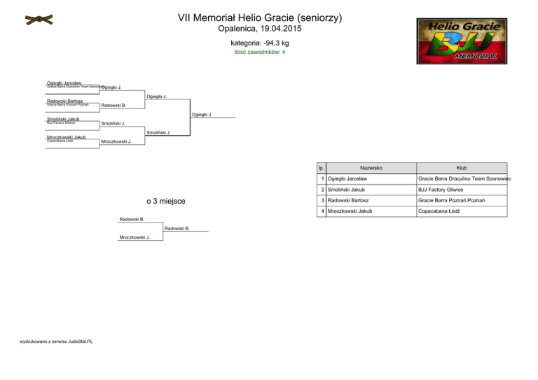 VII Memoriał Helio Gracie (seniorzy) Opalenica, 19.04.2015 kategoria: -94,3 kg ilość zawodników: 4 Ogiegło Jarosław Gracie Barra Draculino Team Sosnowiec Ogiegło Radowski Bartosz Gracie Barra Poznań Poznań Smoliński Jakub BJJ Factory Gliwice Mroczkowski Jakub Copacabana Łódź J. Ogiegło J. Radowski B. Ogiegło J. Smoliński J. Smoliński J. Mroczkowski J. lp. o 3 miejsce Radowski B. Radowski B. Mroczkowski J. wydrukowano z serwisu JudoStat.PL Nazwisko Klub 1 Ogiegło Jarosław Gracie Barra Draculino Team Sosnowiec 2 Smoliński Jakub BJJ Factory Gliwice 3 Radowski Bartosz Gracie Barra Poznań Poznań 4 Mroczkowski Jakub Copacabana Łódź