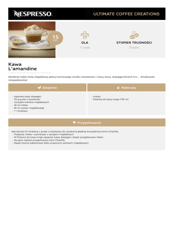 15 MIN. DLA STOPIEŃ TRUDNOŚCI 1 osób Średni Kawa L’amandine Wyobraź sobie tartę migdałową pełną kremowego smaku kasztanów i mocy kawy Arpeggio Grand Cru… Smakowita niespodzianka! Składniki - kapsułka kawy Arpeggio 25 g purée z kasztanów szczypta wiórków migdałowych 40 ml mleka 50 ml syropu migdałowego 1 l śmietany Materiały - mikser - filiżanka do kawy lungo (150 ml) Przygotowanie Wymieszać litr śmietany z purée z kasztanów do uzyskania gładkiej konsystencji kremu Chantilly - Podgrzać mleko i wymieszać z syropem migdałowym - W filiżance do kawy lungo zaparzyć kawę Arpeggio i dodać przygotowane mleko - Na górę nałożyć przygotowany krem Chantilly - Napój można udekorować lekko prażonymi wiórkami migdałowymi