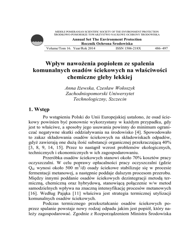 MIDDLE POMERANIAN SCIENTIFIC SOCIETY OF THE ENVIRONMENT PROTECTION ŚRODKOWO-POMORSKIE TOWARZYSTWO NAUKOWE OCHRONY ŚRODOWISKA Annual Set The Environment Protection Rocznik Ochrona Środowiska Volume/Tom 16. Year/Rok 2014 ISSN 1506-218X 486–497 Wpływ nawożenia popiołem ze spalenia komunalnych osadów ściekowych na właściwości chemiczne gleby lekkiej Anna Iżewska, Czesław Wołoszyk Zachodniopomorski Uniwersytet Technologiczny, Szczecin 1. Wstęp Po wstąpieniu Polski do Unii Europejskiej ustalono, że osad ściekowy powinien być ponownie wykorzystany w każdym przypadku, gdy jest to właściwe, a sposoby jego usuwania powinny do minimum ograniczać negatywne skutki oddziaływania na środowisko [4]. Spowodowało to zakaz składowania osadów ściekowych na składowiskach odpadów, gdyż zawierają one dużą ilość substancji organicznej przekraczającą 40% [3, 8, 9, 14, 15]. Przez to nastąpił wzrost problemów ekologicznych, technicznych i ekonomicznych w ich zagospodarowaniu. Przeróbka osadów ściekowych stanowi około 70% kosztów pracy oczyszczalni. W celu poprawy opłacalności pracy oczyszczalni (gdzie Qść wynosi około 500 m3/d) osady ściekowe stabilizuje się w procesie fermentacji metanowej, a następnie poddaje dalszym procesom przerobu. Między innymi poddanie osadów ściekowych dezintegracji metodą termiczną, chemiczną oraz hybrydową, stanowiącą połączenie w/w metod samodzielnych wpływa na znaczną intensyfikację procesów metanowych [16]. Według Pająka [11] właściwa jest strategia termicznej utylizacji komunalnych osadów ściekowych. Podczas termicznego przekształcanie osadów ściekowych poprzez spalanie powstaje nowy rodzaj odpadu jakim jest popiół, który należy zagospodarować. Zgodnie z Rozporządzeniem Ministra Środowiska Wpływ nawożenia popiołem ze spalenia komunalnych osadów… 487 z dnia 27 września 2001 r. w sprawie katalogu odpadów [12], popioły ze spalania osadów ściekowych należą do grupy: 19 Odpady z instalacji i urządzeń służących zagospodarowaniu odpadów, z oczyszczalni ścieków oraz z uzdatniania wody pitnej i wody do celów przemysłowych, 19 01 Odpady z termicznego przekształcania odpadów 19 01 12 Żużle i popioły paleniskowe inne niż wymienione w 19 01 11, czyli Żużle i popioły rusztowe ze spalania komunalnych osadów ściekowych. W zależności od składu chemicznego komunalnych osadów, jak i rozwiązań technologicznych w termicznej ich utylizacji, otrzymuje się popiół o różnej zawartości makro- i mikroskładników, w tym metali ciężkich. W niniejszej pracy podjęto próbę oceny wpływu nawożenia popiołem ze spalenia komunalnych osadów ściekowych na właściwości chemiczne gleby lekkiej. Popiół pochodził ze spalania w piecu rusztowym komunalnych osadów ściekowych w Oczyszczalni „Pomorzany” w Szczecinie. W badaniach popiół potraktowano, jako substytut fosforu z nawozów fosforowych. 2. Materiał i metoda W latach 2011–2012 w Rolniczej Stacji doświadczalnej w Lipniku koło Stargardu Szczecińskiego przeprowadzono badania z wykorzystaniem do nawożenia roślin popiołu ze spalania komunalnego osadu ściekowego. Doświadczenie polowe zlokalizowano na glebie brunatnordzawej, niecałkowitej, wytworzonej z piasku gliniastego lekkiego pylastego, średnio głęboko podścielonego gliną lekką (klasa bonitacyjna IVb, kompleks żytni dobry - 5, kategoria agronomiczna – gleba lekka). Przed założeniem doświadczenia odczyn gleby był lekko kwaśny (5,8 pH w 1 mol KCl∙dm-3), całkowita zawartość węgla wynosiła 8,59 g∙kg-1, azotu 0,84 g∙kg-1, form przyswajalnych fosforu była wysoka, a potasu i magnezu niska. Zawartość całkowita pierwiastków śladowych w glebie wynosiła: Cd – 0,554; Cu – 6,439; Mn – 254,7; Ni – 8,320; Pb – 5,215; Zn – 62,31 mg∙kg-1s.m. Schemat badań obejmował pięć wariantów nawożenia nawozami mineralnymi i popiołem ze spalania komunalnego osadu ściekowego: NK, NPK, NK+P1 (P1 – 1 dawka popiołu - 50 kg∙ha-1), NK+P2 (P2 – 2 488 Anna Iżewska, Czesław Wołoszyk dawka popiołu – 100 kg∙ha-1), NK+P3 (P3 – 3 dawka popiołu – 150 kg∙ha-1) miskantusa olbrzymiego (Miscanthus giganteus). Nawożenie azotem stosowano w postaci saletry amonowej (34% N) w dawce 80 kg N∙ha-1, fosforem w formie superfosfatu wzbogaconego (40% P2O5) w dawce 50 kg P2O5∙ha-1, a potasem – solą potasową (60% K2O) w dawce 120 kg K2O∙ha-1. Popiół ze spalania komunalnych osadów ściekowych, który stanowił substytut nawozu fosforowego, pochodził z Oczyszczalni Ścieków „Pomorzany” w Szczecinie. W obu latach badań zastosowano ten sam popiół, a jego skład chemiczny zamieszczono w tabeli 1. Całkowitą zawartość metali ciężkich w glebie oznaczono metodą ASA, po uprzedniej mineralizacji próbek w mieszaninie (1:1) kwasu azotowego(V) i chlorowego(VII), natomiast formy rozpuszczalne po ekstrakcji w 1 mol∙dm-3 HCl. Zawartość metali ciężkich w glebie poddano analizie wariancji zgodnie ze schematem doświadczenia (warianty nawożenia: NK, NPK, NK+P1, NK+P2, NK+P3 i lata badań 2011, 2012). Istotność różnic była oceniana na standardowym poziomie 5%, jako źródło błędu w ocenie zmienności przyjęto interakcję badanych czynników. Średnie różniące się istotnie porównano następnie przy pomocy testu Tukeya. 3. Wyniki i dyskusja Nawożenie nawozami mineralnymi i popiołem ze spalania komunalnych osadów ściekowych, w porównaniu z wyłącznym nawożeniem nawozami mineralnymi, w większości przypadków nie różnicowało całkowitą zawartość analizowanych metali ciężkich (kadmu, miedzi, manganu, niklu, ołowiu i cynku) w warstwie ornej (0–20 cm) i podornej (21– 40 cm) (tabela 2 i 3). Całkowita zawartość omawianych metali ciężkich nie przekraczała norm zawartych w Rozporządzeniu Ministra Środowiska w sprawie standardów jakości gleby oraz standardów jakości ziemi [13]. Glebę zaliczo