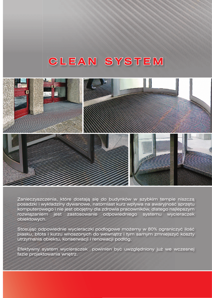 CLEAN SYSTEM Zanieczyszczenia, które dostają się do budynków w szybkim tempie niszczą posadzki i wykładziny dywanowe, natomiast kurz wpływa na awaryjność sprzętu komputerowego i nie jest obojętny dla zdrowia pracowników, dlatego najlepszym rozwiązaniem jest zastosowanie odpowiedniego systemu wycieraczek obiektowych. Stosując odpowiednie wycieraczki podłogowe możemy w 80% ograniczyć ilość piasku, błota i kurzu wnoszonych do wewnątrz i tym samym zmniejszyć koszty utrzymania obiektu, konserwacji i renowacji podłóg. Efektywny system wycieraczek fazie projektowania wnętrz. powinien być uwzględniony już we wczesnej clean rryps clean yps – wk wkła wkład ład d te teks tekstylny ksty tyln lny y Wycieraczka z osuszającymi wkładami czyszczącymi osadzonymi w profilach aluminiowych. Wkłady osuszające odporne są na ścieranie, wygniatanie, dobrze absorbują wilgoć. Całość łączona przy pomocy nierdzewnych lin stalowych. Przeznaczona do wejść o dużym natężeniu ruchu pieszych (wys. 17 lub 22 mm) oraz ręcznych wózków transportowych i sklepowych (tylko wys. 22 mm) – wyłącznie do zastosowania wewnątrz pomieszczeń. zakres temperatur stosowania: powyżej + 5°C montaż: we wpuście o odpowiedniej głębokości (22 lub 17 mm) lub na podłożu w profilowanej ramie aluminiowej wysokość wycieraczek: 17 lub 22 mm kolory wkładów: szary, czarny, brązowy wymiar: na zamówienie clean rubber – wkład gumowy Wycieraczka z gumowymi wkładami czyszczącymi osadzonymi w profilach aluminiowych. Całość łączona przy pomocy nierdzewnych lin stalowych. Przeznaczona do wejść o dużym natężeniu ruchu pieszych (wys. 17 lub 22 mm) oraz ręcznych wózków transportowych i sklepowych (tylko wys. 22 mm). Duża wytrzymałość mechaniczna, odporność na wilgoć, korozję i zmiany temperatur. Można stosować wewnątrz i na zewnątrz budynków. zakres temperatur stosowania: od -40°C do +70°C montaż: we wpuście o odpowiedniej głębokości (22 lub 17 mm) lub na podłożu w profilowanej ramie aluminiowej. wysokość wycieraczek: 17 lub 22 mm kolory wkładów: szary, czarny, brązowy wymiar: na zamówienie clean scrub – wkład szczotkowy Wycieraczka z szczotkowymi wkładami czyszczącymi osadzonymi w profilach aluminiowych. Całość łączona przy pomocy nierdzewnych lin stalowych. Przeznaczona do wejść o dużym natężeniu ruchu pieszych (wys. 17 lub 22 mm) oraz ręcznych wózków transportowych i sklepowych (tylko wys. 22 mm). Duża wytrzymałość mechaniczna, odporność na wilgoć, korozję i zmiany temperatur. Można stosować wewnątrz i na zewnątrz budynków zakres temperatur stosowania: od -40°C do +70°C montaż: we wpuście o odpowiedniej głębokości (22 lub 17 mm) lub na podłożu w profilowanej ramie aluminiowej. wysokość wycieraczek: 17 lub 22 mm kolory wkładów: szary, czarny, brązowy wymiar: na zamówienie UWAGA: POSZCZEGÓLNE WKŁADY CZYSZCZĄCE MOŻNA ŁĄCZYĆ! możliwe warianty clean ryps – rubber clean ryps – scrub clean rubber – scrub kolory wycieraczek sposoby montażu rama wpustowa POZIOM POSADZKI POZIOM WPUSTU profil najazdowy informacje techniczne PRZY ZAMAWIANIU PROSIMY O PODANIE: 1. Rodzaju wkładu czyszczącego: ryps – wkład tekstylny, rubber – wkład gumowy, scrub – wkład szczotkowy UWAGA: wkłady czyszczące można łączyć. 2. Wysokości zamawianej wycieraczki: Clean 22 mm lub Clean 17 mm (wysokość profilu nośnego odpowiednio 19 mm i 15 mm) Faktyczne wymiary wycieraczek z wkładami czyszczącymi: Clean 22 mm (wysokość profilu nośnego 19 mm) – clean ryps – 22 mm – clean rubber – 23 mm – clean scrub – 24 mm 3. Szerokości i długości według schematu obok, gdzie strzałka oznacza kierunek wejścia długość Clean 17 mm (wysokość profilu nośnego 15 mm) – clean ryps – 17 mm – clean rubber – 19 mm – clean scrub – 20 mm szerokość 4. Dokładnych wymiarów wewnętrznych wpustu w cm (gotowa wycieraczka będzie mniejsza o 2-3 mm z każdej strony – luz montażowy umożliwiający jej wyjmowanie). Jeżeli wymiary wpustu są nierówne (np. jeden bok mierzy 90 cm a drugi 89 cm), prosimy o podanie przynajmniej dwóch wymiarów każdego boku. 5. Czy potrzebna jest rama wpustowa lub profil najazdowy. 6. Rodzaju ramy wpustowej: 25 x 25 x 3 mm, 20 x 20 x 2 mm, 15 x 15 x 2 mm 7. Sposobu montażu ramy wpustowej: do zalania wylewką samopoziomującą lub do zakołkowania. 8. Koloru użytego wkładu czyszczącego: szary, czarny, brązowy. Atesty i aprobaty: atest PZH HK/B/0693/01/2009, opinia ITB NJ-5/KR/1106/09, sprawozdania z badań materiałowych: 48/09/BB91133001 i 10/11/BB91104001 instrukcja montażu ram Ramy do wycieraczek systemowych clean system wykonane są z kątowników aluminiowych 25 x 25 x 3 mm lub 20 x 20 x 2 mm (dla wycieraczek o wysokości 22 mm) i 20 x 20 x 2 mm lub 15 x 15 x 2 mm (dla wycieraczek o wysokości 17 mm). Ramę należy zamontować we wpuście w ten sposób, aby górna jej krawędź była zlicowana z powierzchnią posadzki, a dolna powierzchnia była zlicowana z posadzką we wpuście. Powierzchnia posadzki we wpuście musi być równa i płaska (norma budowlana dla posadzek samopoziomujących: tolerancja do 2 mm). W przypadku ułożenia wycieraczki w nierównym wpuście może dojść do jej „klawiszowania” i trwałego odkształcenia (konieczność wymiany wycieraczki na nową). Wycieraczki systemowe wykonywane są z dużą dokładnością w stosunku do ram dlatego też bardzo ważne jest dokładne i równe ich osadzenie. Poszczególne boki ram muszą być osadzone równolegle do siebie, bez łukowatych wygięć pośrodku. Należy sprawdzać wymiar w kilku miejscach. W wypadku ram o nietypowych kształtach należy zadbać o właściwe kąty oraz proste osadzenie poszczególnych elementów ramy bez łukowatych wygięć. UWAGA: w przypadku kształtów niestandardowych (koło, elipsa i.t.p) istnieje konieczność wykonania szablonu w skali 1:1. eksploatacja 