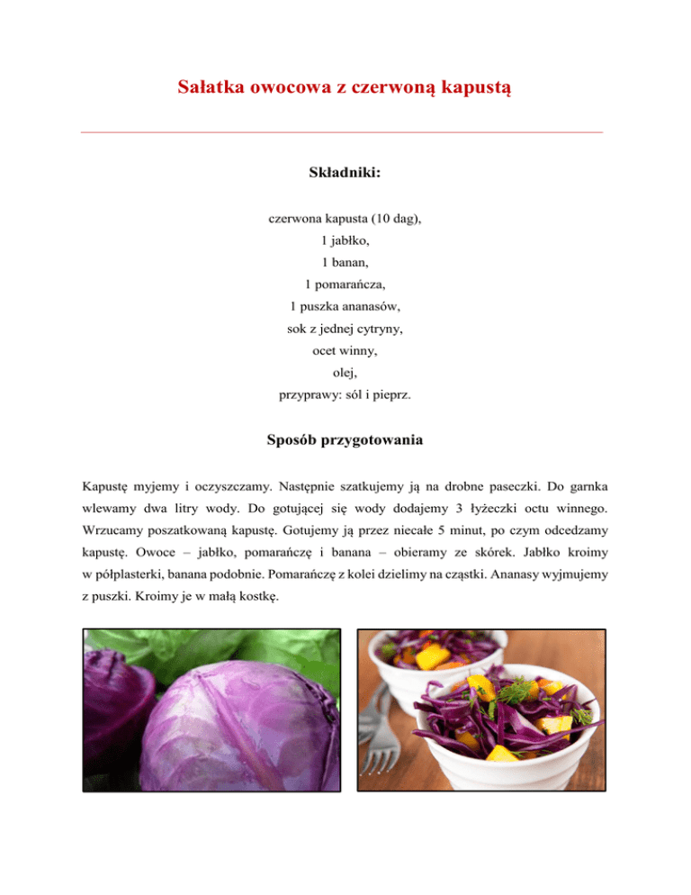 Sałatka owocowa z czerwoną kapustą Składniki: czerwona kapusta (10 dag), 1 jabłko, 1 banan, 1 pomarańcza, 1 puszka ananasów, sok z jednej cytryny, ocet winny, olej, przyprawy: sól i pieprz. Sposób przygotowania Kapustę myjemy i oczyszczamy. Następnie szatkujemy ją na drobne paseczki. Do garnka wlewamy dwa litry wody. Do gotującej się wody dodajemy 3 łyżeczki octu winnego. Wrzucamy poszatkowaną kapustę. Gotujemy ją przez niecałe 5 minut, po czym odcedzamy kapustę. Owoce – jabłko, pomarańczę i banana – obieramy ze skórek. Jabłko kroimy w półplasterki, banana podobnie. Pomarańczę z kolei dzielimy na cząstki. Ananasy wyjmujemy z puszki. Kroimy je w małą kostkę.