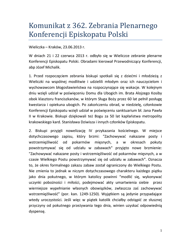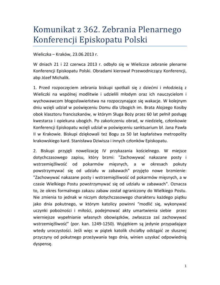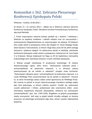 Komunikat z 362. Zebrania Plenarnego Konferencji Episkopatu Polski Wieliczka – Kraków, 23.06.2013 r. W dniach 21 i 22 czerwca 2013 r. odbyło się w Wieliczce zebranie plenarne Konferencji Episkopatu Polski. Obradami kierował Przewodniczący Konferencji, abp Józef Michalik. 1. Przed rozpoczęciem zebrania biskupi spotkali się z dziećmi i młodzieżą z Wieliczki na wspólnej modlitwie i udzielili młodym oraz ich nauczycielom i wychowawcom błogosławieństwa na rozpoczynające się wakacje. W kolejnym dniu wzięli udział w poświęceniu Domu dla Ubogich im. Brata Alojzego Kosiby obok klasztoru franciszkanów, w którym Sługa Boży przez 60 lat pełnił posługę kwestarza i opiekuna ubogich. Po zakończeniu obrad, w niedzielę, członkowie Konferencji Episkopatu wzięli udział w poświęceniu sanktuarium bł. Jana Pawła II w Krakowie. Biskupi dziękowali też Bogu za 50 lat kapłaństwa metropolity krakowskiego kard. Stanisława Dziwisza i innych członków Episkopatu. 2. Biskupi przyjęli nowelizację IV przykazania kościelnego. W miejsce dotychczasowego zapisu, który brzmi: "Zachowywać nakazane posty i wstrzemięźliwość od pokarmów mięsnych, a w okresach pokuty powstrzymywać się od udziału w zabawach" przyjęto nowe brzmienie: "Zachowywać nakazane posty i wstrzemięźliwość od pokarmów mięsnych, a w czasie Wielkiego Postu powstrzymywać się od udziału w zabawach". Oznacza to, że okres formalnego zakazu zabaw został ograniczony do Wielkiego Postu. Nie zmienia to jednak w niczym dotychczasowego charakteru każdego piątku jako dnia pokutnego, w którym katolicy powinni “modlić się, wykonywać uczynki pobożności i miłości, podejmować akty umartwienia siebie przez wierniejsze wypełnianie własnych obowiązków, zwłaszcza zaś zachowywać wstrzemięźliwość” (por. kan. 1249-1250). Wyjątkiem są jedynie przypadające wtedy uroczystości. Jeśli więc w piątek katolik chciałby odstąpić ze słusznej przyczyny od pokutnego przeżywania tego dnia, winien uzyskać odpowiednią dyspensę. 1 3. Konferencja Episkopatu Polski zatwierdziła tekst deklaracji, która będzie podpisana podczas spotkania abp. Józefa Michalika ze zwierzchnikiem Kościoła Bizantyjsko-Ukraińskiego, abp. Światosławem Szewczukiem, który przybywa pod koniec czerwca do Warszawy. Deklaracja odnosi się do zbrodni wołyńskiej, której 70. rocznicę będziemy wkrótce po tej wizycie przeżywać. Tekst deklaracji, przygotowany w dialogu obu stron, wyrasta z ducha Ewangelii, która wzywa do uznania prawdy i wyznania win, aby wejść na drogę pojednania. Zachęcamy wszystkich do modlitwy za ofiary rzezi wołyńskiej, zwłaszcza w dniu 11 lipca i w poprzedzającą niedzielę. 4. Podczas posiedzenia biskupi z uwagą przyjęli informacje dotyczące nauczania religii w szkole, zwłaszcza w sprawie umożliwienia młodym ludziom zdawania egzaminu z religii na maturze, jeśli wybraliby ten przedmiot jako dodatkowy. Wobec zdecydowanej odmowy ze strony Ministerstwa Edukacji Narodowej biskupi przypominają, że w efekcie prowadzonych od wielu lat rozmów zostały opracowane przez stronę kościelną jasno określone standardy egzaminacyjne dla tego przedmiotu. Przeprowadzono także specjalistyczny pilotaż, znowelizowano podstawę programową nauczania religii tak, aby jej język był przystosowany do języka podstawy programowej kształcenia ogólnego opracowanej przez MEN. Strona kościelna nie kryje zaskoczenia z powodu odmówienia młodym ludziom prawa do zdawania na maturze przedmiotu, którego uczą się wiele lat, otrzymują z niego ocenę na podstawie jawnych kryteriów wiedzy (a nie wiary – jak się to często błędnie sugeruje), ocena ta jest wliczana do średniej i widnieje na państwowym dokumencie, jakim jest świadectwo szkolne. Biskupi wyrażają nadzieję, że sprawa wyboru religii na maturze powróci do tematów zespołu wspólnego przedstawicieli strony kościelnej oraz Ministerstwa Edukacji Narodowej. 5. W związku z nasilającymi się próbami narzucania przez różne podmioty krajowe i zagraniczne demoralizujących treści i metod związanych z edukacją seksualną w przedszkolach i szkołach, biskupi wyrażają swój niepokój i zdecydowany sprzeciw. Zwracają sie z apelem do wszystkich wierzących rodziców o czujność w tym względzie. Należy dołożyć wszelkich starań, aby chronić polskie dzieci i młodzież przed demoralizacją. 2 6. Biskupi zajęli się także sprawami Ruchu Światło-Życie, będącego jednym z najważniejszych katolickich ruchów odnowy w Polsce. Wyrazili życzenie, aby Ruch pozostał jednością, zgodnie z wolą swojego założyciela. Domowy Kościół stanowi rodzinną gałąź tego Ruchu, zgodnie z zapisami zawartymi w „Statutach Stowarzyszenia Diakonia Ruchu Światło-Życie” zatwierdzonych przez biskupów polskich w roku 2000. Biskupi dziękują rodzicom, nauczycielom, katechetom i wychowawcom za całoroczny trud pracy edukacyjnej w szkole. Niech nadchodzące wakacje będą okresem wypoczynku oraz odkrywania Boga w pięknie stworzenia. Na ten czas biskupi błogosławią dzieciom i młodzieży, a zwłaszcza wszystkim udającym się na Światowe Dni Młodzieży w Rio de Janeiro. Podpisali: Pasterze Kościoła katolickiego w Polsce Wieliczka – Kraków, 23.06.2013 r. _________________________ Łomżyńska Kuria Diecezjalna ZARZĄDZENIE Komunikat z 362. Zebrania Plenarnego Konferencji Episkopatu Polski do odczytania podczas ogłoszeń parafialnych w najbliższą niedzielę po otrzymaniu. + Tadeusz Bronakowski Wikariusz Generalny Łomża, dnia 25 czerwca 2013 r. N. 1035/2013 3