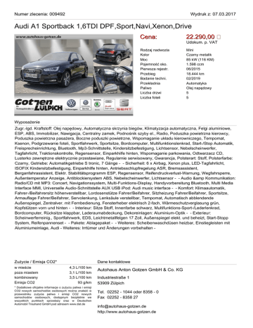 Numer zlecenia: 009492 Wydruk z: 07.03.2017 Audi A1 Sportback 1,6TDI DPF,Sport,Navi,Xenon,Drive Cena: 22.290,00 Rodzaj nadwozia Kolor Moc Pojemność sko. Pierwsza rejestr. Przebieg Badanie techni. Przekładnia Paliwo Liczba drzwi Liczba foteli Mini Czarny metalik 85 kW (116 KM) 1.598 ccm 06/2015 18.444 km 02/2019 Automatyka Olej napędowy 5 5 Udokum. p. VAT Wyposażenie Zugr.-lgd. Kraftstoff: Olej napędowy, Automatyczna skrzynia biegów, Klimatyzacja automatyczna, Felgi aluminiowe, ESP, ABS, Immobilizer, Nawigacja, Centralny zamek, Podnośnik szyby el., Radio, Poduszka powietrzna kierowcy, Poduszka powietrzna pasażera, Boczne poduszki powietrzne, Wspomaganie układu kierowniczego, Tempomat, Ksenon, Podgrzewanie foteli, Sportfahrwerk, Sportsitze, Bordcomputer, Multifunktionslenkrad, Start-/Stop Automatik, Freisprecheinrichtung, Bluetooth, Mp3-Schnittstelle, Kindersitzbefestigung, Lichtsensor, Nebelscheinwerfer, Tagfahrlicht, Traktionskontrolle, Regensensor, Einparkhilfe hinten, Wspomaganie parkowania, Odtwarzacz CD, Lusterko zewnętrzne elektrycznie przestawiane, Regularnie serwisowany, Gwarancja, Polsterart: Stoff, Polsterfarbe: Czarny, Getriebe: Automatikgetriebe S tronic, 7 Gänge - - Sicherheit: 6 x Airbag, Xenon plus, LED-Tagfahrlicht, ISOFIX Kindersitzbefestigung, Einparkhilfe hinten, Antriebsschlupfregelung ASR, Bremsassistent, Berganfahrassistent, Elektr. Stabilitätsprogramm ESP, Regensensor, Reifendruckverlust-Warnung, Wegfahrsperre, Außentemperatur Anzeige, Antiblockiersystem ABS, Nebelscheinwerfer, Lichtsensor - - Audio & Kommunikation: Radio/CD mit MP3: Concert, Navigationssystem, Multi-Funktions-Display, Handyvorbereitung Bluetooth, Multi Media Interface MMI, Universelle Audio-Schnittstelle AUX USB iPod: Audi music interface - - Komfort: Klimaautomatik, Fahrer-/Beifahrersitz höhenverstellbar, Lordosenstütze Fahrer/Beifahrer, Sitzheizung Fahrer/Beifahrer, Sportsitze, Armauflage Fahrer/Beifahrer, Servolenkung, Lenksäule verstellbar, Tempomat, Automatisch abblendende Außenspiegel, Zentralver. mit Fernbedienung, Fensterheber elektrisch 2-fach, Wärmeschutzverglasung grün, Kopfstützen vorn und hinten - - Interieur: Sitze Stoff, Innenfarbe schwarz, Multifunktions-Sport-/Lederlenkrad, Bordcomputer, Rücksitze klappbar, Laderaumabdeckung, Dekoreinlagen: Aluminium-Optik - - Exterieur: Scheinwerferreinig., Sportfahrwerk, EDS, Leichtmetallfelgen 17 Zoll, Außenspiegel elekt. und beheizt, Start-Stopp System, Reifenpannenset - - Pakete: Ablagepaket - - Weiteres: Scheibenwaschdüsen heizbar, Einstiegleisten mit Aluminiumeinlage, Audi - Weiteres: Irrtümer und Änderungen vorbehalten - Zużycie / Emisja CO2* w mieście poza miastem kombinowany Emisja CO2 Dane kontaktowe 4,3 L/100 km 3,1 L/100 km 3,5 L/100 km 93 g/km * Dodatkowe oficjalne informacje o zużyciu paliwa i emisji CO2 nowych samochodów osobowych można znaleźć w przewodniku zużycia paliwa i emisji CO2 nowych samochodów osobowych, dostępnym bezpłatnie we wszystkich punktach sprzedaży oraz w Deutschen Automobil Treuhand GmbH pod adresem www.dat.de Autohaus Anton Gotzen GmbH & Co. KG Industriestraße 1 53909 Zülpich Tel. 02252 - 1044 oder 8358 - 0 Fax 02252 - 8358 27 [email protected] http://www.autohaus-gotzen.de Numer zlecenia: 009492 Wydruk z: 07.03.2017 Audi A1 Sportback 1,6TDI DPF,Sport,Navi,Xenon,Drive Numer zlecenia: 009492 Wydruk z: 07.03.2017 Audi A1 Sportback 1,6TDI DPF,Sport,Navi,Xenon,Drive