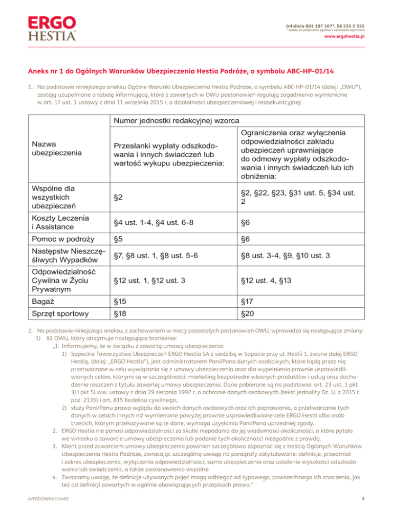 Infolinia 801 107 107*, 58 555 5 555 * opłata za połączenie zgodna z cennikiem operatora www.ergohestia.pl Aneks nr 1 do Ogólnych Warunków Ubezpieczenia Hestia Podróże, o symbolu ABC-HP-01/14 1. Na podstawie niniejszego aneksu Ogólne Warunki Ubezpieczenia Hestia Podróże, o symbolu ABC-HP-01/14 (dalej: „OWU”), zostają uzupełnione o tabelę informującą, które z zawartych w OWU postanowień regulują zagadnienia wymienione w art. 17 ust. 1 ustawy z dnia 11 września 2015 r. o działalności ubezpieczeniowej i reasekuracyjnej: Numer jednostki redakcyjnej wzorca Przesłanki wypłaty odszkodowania i innych świadczeń lub wartość wykupu ubezpieczenia: Ograniczenia oraz wyłączenia odpowiedzialności zakładu ubezpieczeń uprawniające do odmowy wypłaty odszkodowania i innych świadczeń lub ich obniżenia: Wspólne dla wszystkich ubezpieczeń §2 §2, §22, §23, §31 ust. 5, §34 ust. 2 Koszty Leczenia i Assistance §4 ust. 1-4, §4 ust. 6-8 §6 Pomoc w podroży §5 §6 Następstw Nieszczęśliwych Wypadków §7, §8 ust. 1, §8 ust. 5-6 §8 ust. 3-4, §9, §10 ust. 3 Odpowiedzialność Cywilna w Życiu Prywatnym §12 ust. 1, §12 ust. 3 §12 ust. 4, §13 Bagaż §15 §17 Sprzęt sportowy §18 §20 Nazwa ubezpieczenia 2. Na podstawie niniejszego aneksu, z zachowaniem w mocy pozostałych postanowień OWU, wprowadza się następujące zmiany: 1) §1 OWU, który otrzymuje następujące brzmienie: „1. Informujemy, że w związku z zawartą umową ubezpieczenia: 1) Sopockie Towarzystwo Ubezpieczeń ERGO Hestia SA z siedzibą w Sopocie przy ul. Hestii 1, zwane dalej ERGO Hestią, (dalej: „ERGO Hestia”), jest administratorem Pani/Pana danych osobowych, które będą przez nią przetwarzane w celu wywiązania się z umowy ubezpieczenia oraz dla wypełnienia prawnie usprawiedliwionych celów, którymi są w szczególności: marketing bezpośredni własnych produktów i usług oraz dochodzenie roszczeń z tytułu zawartej umowy ubezpieczenia. Dane pobierane są na podstawie: art. 23 ust. 1 pkt 3) i pkt 5) ww. ustawy z dnia 29 sierpnia 1997 r. o ochronie danych osobowych (tekst jednolity Dz. U. z 2015 r. poz. 2135) i art. 815 Kodeksu cywilnego, 2) służy Pani/Panu prawo wglądu do swoich danych osobowych oraz ich poprawiania, a przetwarzanie tych danych w celach innych niż wymienione powyżej prawnie usprawiedliwione cele ERGO Hestii albo osób trzecich, którym przekazywane są te dane, wymaga uzyskania Pani/Pana uprzedniej zgody. 2. ERGO Hestia nie ponosi odpowiedzialności za skutki niepodania do jej wiadomości okoliczności, o które pytała we wniosku o zawarcie umowy ubezpieczenia lub podanie tych okoliczności niezgodnie z prawdą. 3. Klient przed zawarciem umowy ubezpieczenia powinien szczegółowo zapoznać się z treścią Ogólnych Warunków Ubezpieczenia Hestia Podróże, zwracając szczególną uwagę na paragrafy zatytułowane: definicje, przedmiot i zakres ubezpieczenia, wyłączenia odpowiedzialności, suma ubezpieczenia oraz ustalenie wysokości odszkodowania lub świadczenia, a także postanowienia wspólne 4. Zwracamy uwagę, że definicje używanych pojęć mogą odbiegać od typowego, powszechnego ich znaczenia, jak też od definicji zawartych w ogólnie obowiązujących przepisach prawa.” A/PAT/OW043/1405 1 Infolinia 801 107 107*, 58 555 5 555 * opłata za połączenie zgodna z cennikiem operatora www.ergohestia.pl 2) §3 pkt 5 OWU, który otrzymuje następujące brzmienie: „Kraj zamieszkania – kraj, w którym Ubezpieczony: a) objęty jest ubezpieczeniem społecznym lub zdrowotnym (za wyjątkiem pobytu w celu kształcenia) i b) zamieszkuje nieprzerwanie (nie licząc wyjazdów trwających mniej niż 30 dni) przez co najmniej rok i w którym koncentruje się jego życie osobiste i zawodowe.” 3) §6 ust. 1 pkt b OWU, który otrzymuje następujące brzmienie: „w wyniku prowadzenia przez Ubezpieczonego pojazdu bez wymaganych, zgodnie z prawem państwa, na terytorium którego doszło do zdarzenia, uprawnień do jego prowadzenia, o ile miało to wpływ na powstanie szkody;” 4) §6 ust. 2 pkt d OWU, który otrzymuje następujące brzmienie: „jeżeli podróż miała na celu leczenie bądź jest kontynuacją leczenia rozpoczętego przed podróżą.” 5) §8 OWU uzupełnia się o ust. 8 w brzmieniu: „W razie doznania przez Ubezpieczonego kilku uszczerbków na zdrowiu ERGO Hestia wypłaca świadczenie za wszystkie uszczerbki objęte ochroną ubezpieczeniową maksymalnie do wysokości sumy ubezpieczenia.” 6) §11 ust. 1 pkt d OWU, który otrzymuje następujące brzmienie: „zwolnić lekarzy, publiczne i niepubliczne zakłady opieki zdrowotnej oraz Zakład Ubezpieczeń Społecznych, w zakresie niezbędnym do rozpatrzenia roszczenia, z obowiązku zachowania tajemnicy lekarskiej oraz wyrazić zgodę na udostępnienie ERGO Hestii dokumentacji z leczenia.” 7) §11 ust. 2 OWU, który otrzymuje następujące brzmienie: „Jeśli Ubezpieczony poniósł wydatki lub gdy uzyskał zgodę Centrum Alarmowego na zwrot poniesionych kosztów leczenia po powrocie z podróży, to zobowiązany jest do dostarczenia do ERGO Hestii dokumentów uzasadniających rozpatrzenie wniosku o zwrot poniesionych kosztów, w tym: a) orzeczenie lub diagnozy lekarskie i inne dokumenty stwierdzające przyczyny i zakres udzielonej pomocy medycznej; b) rachunki i dowody ich zapłaty; c) szczegółowy opis okoliczności zaistnienia wypadku. 8) §12 ust. 4 OWU, który otrzymuje następujące brzmienie: „ERGO Hestia pokrywa także, w granicach sumy gwarancyjnej, niezbędne koszty: 1) wynagrodzenia rzeczoznawcy, powołanego za pisemną zgodą ERGO Hestii, w celu ustalenia okoliczności wypadku, przyczyn lub rozmiaru szkody, maksymalnie do wysokości 20% sumy gwarancyjnej; 2) obrony sądowej, jeżeli przeciwko Ubezpieczonemu zostanie wszczęte postępowanie karne, o ile ERGO Hestia wyraziła pisemną zgodę na pokrycie tych kosztów, maksymalnie do wysokości 20% sumy gwarancyjnej; 3