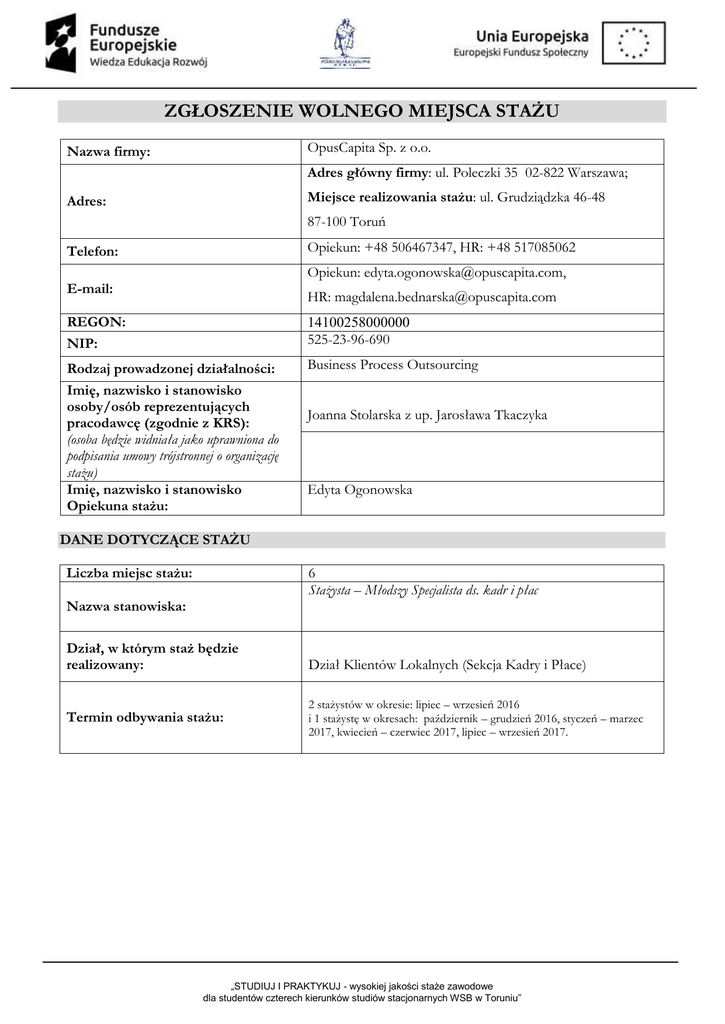 ZGŁOSZENIE WOLNEGO MIEJSCA STAŻU OpusCapita Sp. z o.o. Nazwa firmy: Adres główny firmy: ul. Poleczki 35 02-822 Warszawa; Miejsce realizowania stażu: ul. Grudziądzka 46-48 Adres: 87-100 Toruń Opiekun: +48 506467347, HR: +48 517085062 Telefon: Opiekun: [email protected], E-mail: HR: [email protected] REGON: NIP: 14100258000000 525-23-96-690 Rodzaj prowadzonej działalności: Imię, nazwisko i stanowisko osoby/osób reprezentujących pracodawcę (zgodnie z KRS): (osoba będzie widniała jako uprawniona do podpisania umowy trójstronnej o organizację stażu) Imię, nazwisko i stanowisko Opiekuna stażu: Business Process Outsourcing Joanna Stolarska z up. Jarosława Tkaczyka Edyta Ogonowska DANE DOTYCZĄCE STAŻU Liczba miejsc stażu: 6 Stażysta – Młodszy Specjalista ds. kadr i płac Nazwa stanowiska: Dział, w którym staż będzie realizowany: Termin odbywania stażu: Dział Klientów Lokalnych (Sekcja Kadry i Płace) 2 stażystów w okresie: lipiec – wrzesień 2016 i 1 stażystę w okresach: październik – grudzień 2016, styczeń – marzec 2017, kwiecień – czerwiec 2017, lipiec – wrzesień 2017. „STUDIUJ I PRAKTYKUJ - wysokiej jakości staże zawodowe dla studentów czterech kierunków studiów stacjonarnych WSB w Toruniu” Wymagane kwalifikacje: – student Zarządzania, Specjalność: Zarzadzanie Zasobami Ludzkimi - znajomość Word, Excel - mile widziane zainteresowanie tematyką kadrowo-płacową Oświadczam, że: - zakład nie jest w stanie upadłości, likwidacji; - organizacja stażu dla skierowanego studenta nie będzie przyczyną zwolnień pracowników zatrudnionych w przedsiębiorstwie. SZCZEGÓŁOWY PROGRAM STAŻU Zakres obowiązków Stażysty - zakładanie i prowadzenie akt osobowych, - wprowadzanie dokumentacji kadrowo-płacowej do systemów komputerowych (Enova, Symfonia, Płatnik), - przygotowywanie dokumentacji kadrowo-płacowej, - ewidencja nieobecności i rozliczanie czasu pracy, - wprowadzanie zwolnień lekarskich, - wprowadzanie zmiennych i potrąceń do listy płac, - przygotowywanie pasków z wynagrodzeniami, - przygotowywanie raportów kadrowo-płacowych, - archiwizacja dokumentów kadrowo-płacowych Wymiar godzinowy Liczba godzin dziennie: 8 Godziny pracy: od 8 do 16 Praca przy monitorze ekranowym co najmniej połowę dobowego wymiaru czasu pracy TAK Cele edukacyjne „STUDIUJ I PRAKTYKUJ - wysokiej jakości staże zawodowe dla studentów czterech kierunków studiów stacjonarnych WSB w Toruniu” X NIE □ W trakcie stażu stażysta będzie miał możliwość zastosowania wiedzy teoretycznej w praktyce. Stażysta zdobędzie doświadczenie z zakresu: obsługi programów kadrowo-płacowych (Enova, Symfonia, Płatnik), administrowania aktami osobowymi, przygotowywania dokumentacji kadrowo-płacowej, ewidencji i rozliczania czasu pracy, wprowadzania danych kadrowo-płacowych do listy płac oraz raportowania kadrowo-płacowego. Stażysta nabędzie umiejętność szukania odpowiedzi na problemy kadrowo-płacowe (dostęp do materiałów dydaktycznych, portali kadrowo-płacowych). Zapozna się również z zasadami świadczenia outsourcingu kadrowo-płacowego. „STUDIUJ I PRAKTYKUJ - wysokiej jakości staże zawodowe dla studentów czterech kierunków studiów stacjonarnych WSB w Toruniu”