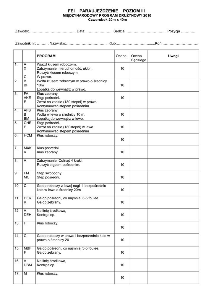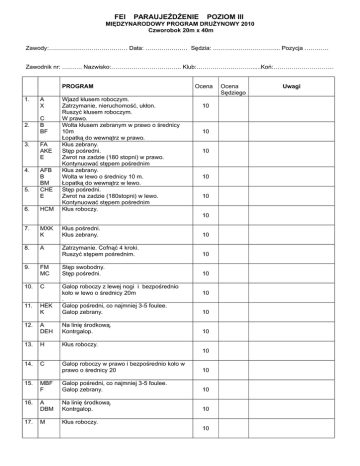 FEI PARAUJEŻDŻENIE POZIOM III MIĘDZYNARODOWY PROGRAM DRUŻYNOWY 2010 Czworobok 20m x 40m Zawody:………………………………… Data: ………………… Sędzia: ……….…………………... Pozycja ………… Zawodnik nr: ………. Nazwisko:…………………………….. Klub:………………………......Koń:………………………… PROGRAM 1. 2. 3. 4. 5. 6. A X C B BF FA AKE E AFB B BM CHE E HCM Wjazd kłusem roboczym. Zatrzymanie, nieruchomość, ukłon. Ruszyć kłusem roboczym. W prawo. Wolta kłusem zebranym w prawo o średnicy 10m Łopatką do wewnątrz w prawo. Kłus zebrany. Stęp pośredni. Zwrot na zadzie (180 stopni) w prawo. Kontynuować stępem pośrednim Kłus zebrany. Wolta w lewo o średnicy 10 m. Łopatką do wewnątrz w lewo. Stęp pośredni. Zwrot na zadzie (180stopni) w lewo. Kontynuować stępem pośrednim Kłus roboczy. Ocena 10 10 10 10 10 10 7. 8. 9. 10. 11. 12. 13. MXK K Kłus pośredni. Kłus zebrany. 10 A Zatrzymanie. Cofnąć 4 kroki. Ruszyć stępem pośrednim. 10 FM MC Stęp swobodny. Stęp pośredni. 10 C HEK K Galop roboczy z lewej nogi i bezpośrednio koło w lewo o średnicy 20m . Galop pośredni, co najmniej 3-5 foulee. Galop zebrany. A DEH Na linię środkową. Kontrgalop. H Kłus roboczy. 10 10 10 10 14. 15. 16. 17. C Galop roboczy w prawo i bezpośrednio koło w prawo o średnicy 20 10 MBF F Galop pośredni, co najmniej 3-5 foulee. Galop zebrany. 10 A DBM Na linię środkową. Kontrgalop. 10 M Kłus roboczy. 10 Ocena Sędziego Uwagi Poziom III Międzynarodowy Program Drużynowy Zawodnik nr: ………. Nazwisko:…………………………….. Klub:………………………......Koń:………………………… Program 18. HXF ocena ocena sędziego uwagi Kłus pośredni 10 19. 20 A X Na linię środkową. Stęp pośredni. G Zatrzymanie, nieruchomość, ukłon. 10 10 Razem 200 OCENY OGÓLNE 1. Chody (swoboda, regularność) Uwagi ogólne: 10 2. 3. 4. Aktywność (dążność do ruchu naprzód, elastyczność kroków, rozluźnienie grzbietu, zaangażowanie zadu) 10x2 Posłuszeństwo ( uwaga i zaufanie, harmonia, lekkość i łatwość wykonania, przyjęcie kiełzna, lekkość przodu) 10x2 Wyczucie jeździeckie, umiejętności jeźdźca, poprawność wykonania. 10x2 Punkty do odjęcia Pomyłki: pierwsza = 2 punkty druga = 4 punkty trzecia = eliminacja Podpis sędziego: RAZEM 270 Wynik końcowy %: