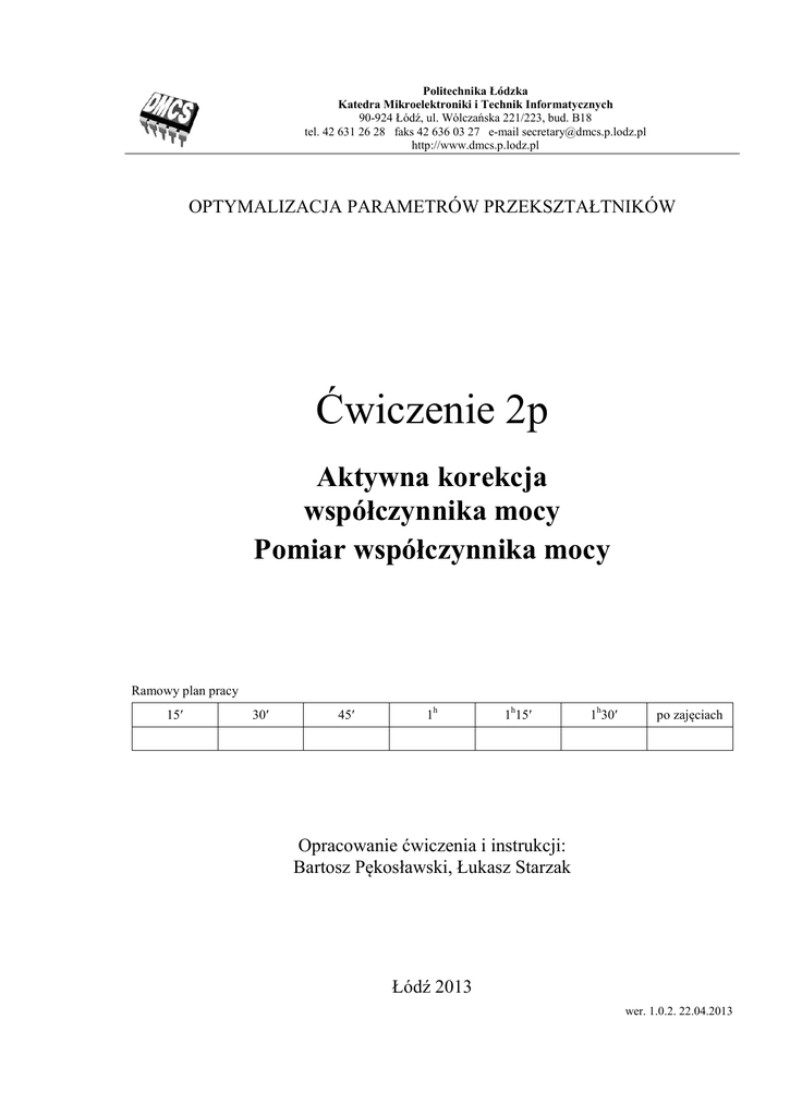 Politechnika Łódzka Katedra Mikroelektroniki i Technik Informatycznych 90-924 Łódź, ul. Wólczańska 221/223, bud. B18 tel. 42 631 26 28 faks 42 636 03 27 e-mail [email protected] http://www.dmcs.p.lodz.pl OPTYMALIZACJA PARAMETRÓW PRZEKSZTAŁTNIKÓW Ćwiczenie 2p Aktywna korekcja współczynnika mocy Pomiar współczynnika mocy Ramowy plan pracy 15′ 30′ 45′ 1h 1h15′ 1h30′ po zajęciach Opracowanie ćwiczenia i instrukcji: Bartosz Pękosławski, Łukasz Starzak Łódź 2013 wer. 1.0.2. 22.04.2013 Spis treści B Wprowadzenie do ćwiczenia..............................................................................................................5 1. Cel i przebieg ćwiczenia....................................................................................................................5 2. Podstawy teoretyczne ........................................................................................................................7 2.1. Wprowadzenie .........................................................................................................................7 C Doświadczenie.....................................................................................................................................8 3. Pomiary..............................................................................................................................................8 3.1. Układ pomiarowy ....................................................................................................................8 3.2. Wykonanie pomiarów............................................................................................................10 D Wyniki ...............................................................................................................................................11 4. Opracowanie i analiza wyników......................................................................................................11 E Informacje.........................................................................................................................................13 5. Literatura .........................................................................................................................................13 © 201 Katedra Mikroelektroniki i Technik Informatycznych Politechniki Łódzkiej B Wprowadzenie do ćwiczenia 1. Cel i przebieg ćwiczenia Celem ćwiczenia jest poznanie zasady działania układu do aktywnej korekcji współczynnika mocy oraz sposobu pomiaru współczynnika mocy. Pomiary prowadzone są przy różnych wartościach mocy wyjściowej i napięcia wejściowego. Ponadto w ćwiczeniu poruszone jest zagadnienie pomiaru współczynnika zniekształceń harmonicznych. © 201 Katedra Mikroelektroniki i Technik Informatycznych Politechniki Łódzkiej 2. Podstawy teoretyczne 2.1. Wprowadzenie Wadą układów biernej korekcji współczynnika mocy jest duży rozmiar i waga dławika, niedoskonała korekcja PF oraz zmniejszenie napięcia wyjściowego. Aktywna korekcja współczynnika mocy pozwala osiągnąć wartości tego parametru bliższe jedności. Jednocześnie napięcie wyjściowe jest regulowane i tym samym możliwy jest szeroki zakres zmian napięcia wejściowego. Układ PFC pełni wówczas rolę wstępnego regulatora napięcia. Najpopularniejszą topologią układu PFC jest przetwornica podwyższająca napięcie, możliwe jednak są także inne topologie : obniżająca napięcie, SEPIC, flyback. Istnieje kilka technik (trybów) PFC: o o o Constant on-time borderline mode (BCM), inaczej zwany Critical Conduction Mode (CRM, CrCM, DCMB) lub Transition Mode (TM) – stosowany przy mocach do około 300W. Fixed- frequency continuous mode (CCM) z kontrolą średniego prądu lub szczytowego prądu, stosowane przy mocach powyżej 1000W. Przeplatany (interleaved) BCM/CCM - stosowany przy mocach między 300 i 1000 W. © 201 Katedra Mikroelektroniki i Technik Informatycznych Politechniki Łódzkiej C Doświadczenie 3. Pomiary 3.1. Układ pomiarowy Układ pomiarowy, którego schemat jest pokazany poniżej, składa się z programowalnego źródła AC Chroma 6408, oscyloskopu TPS2041B o izolowanych kanałach z podłączoną sondą napięciową 100:1 i sondą prądową, układu PFC, cyfrowego miernika mocy Chroma 66202 oraz programowalnego obciążenia DC Chroma 6314A. Źródło AC Miernik mocy PFC Obciążenie DC Sonda prądowa Oscyloskop Rys. 1. Schemat układu pomiarowego Obwód PFC oparty jest na układzie L6561 firmy ST Microelectronics. Schemat układu aktywnej korekcji współczynnika mocy jest pokazany poniżej. Jest to układ mostka prostowniczego i przetwornicy podwyższającej napięcie pracującej w trybie TM. Napięcie wyjściowe wynosi 400V. Napięcie wejściowe może zmieniać się w zakresie 175 do 265 VAC. Układ został zaprojektowany dla obciążenia nominalnego 120W. © Katedra Mikroelektroniki i Technik Informatycznych Politechniki Łódzkiej Rys. 2. Schemat układu aktywnej korekcji współczynnika mocy © Katedra Mikroelektroniki i Technik Informatycznych Politechniki Łódzkiej 3.2. Wykonanie pomiarów 1. Połączyć układ pomiarowy. Nie włączać zasilania. Poprosić prowadzącego o sprawdzenie połączeń. 2. Przełączyć przełącznik suwakowy w pozycję, w której doprowadzone do niego przewody są zwarte (układ PFC nieaktywny). 3. W programowalnym obciążeniu ustawić kanał 3 (przycisk CHAN), tryb CCH (przycisk MODE), prąd CCH1 równy 0,15A, prąd CCH2 równy 0,3A. Pozostałych parametrów nie modyfikować. Przyciskiem MEAS wybrać wyświetlanie napięcia (zapalona zielona kontrolka) i mocy (zgaszona kontrolka). Upewnić się, że kontrolka powyżej przycisku „A”/B jest zapalona. Wcisnąć przycisk LOAD (powinna zapalić się kontrolka czerwona powyżej tego przycisku). 4. Ustawić napięcie źródła AC równe 230V (wpisać wartość i potwierdzić ENTER), częstotliwość 50Hz (wcisnąć V/F, wpisać wartość i potw