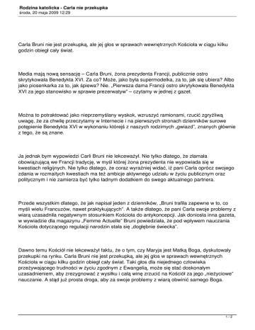 Rodzina katolicka - Carla nie przekupka środa, 20 maja 2009 12:29 Carla Bruni nie jest przekupką, ale jej głos w sprawach wewnętrznych Kościoła w ciągu kilku godzin obiegł cały świat. Media mają nową sensację – Carla Bruni, żona prezydenta Francji, publicznie ostro skrytykowała Benedykta XVI. Za co? Może, jako była supermodelka, za to, jak się ubiera? Albo jako piosenkarka za to, jak śpiewa? Nie. „Pierwsza dama Francji ostro skrytykowała Benedykta XVI za jego stanowisko w sprawie prezerwatyw” – czytamy w jednej z gazet. Można to potraktować jako nieprzemyślany wyskok, wzruszyć ramionami, rzucić zgryźliwą uwagę, że za chwilę przeczytamy w Internecie i na pierwszych stronach dzienników surowe potępienie Benedykta XVI w wykonaniu którejś z naszych rodzimych „gwiazd”, znanych głównie z tego, że są znane. Ja jednak bym wypowiedzi Carli Bruni nie lekceważył. Nie tylko dlatego, że złamała obowiązującą we Francji tradycję, w myśl której żona prezydenta nie wypowiada się w kwestiach religijnych. Nie tylko dlatego, że coraz wyraźniej widać, iż pani Carla oprócz swojego zdania w rozmaitych kwestiach ma też ambicje aktywnego udziału w życiu publicznym oraz politycznym i nie zamierza być tylko ładnym dodatkiem do swego aktualnego partnera. Przede wszystkim dlatego, że jak napisał jeden z dzienników, „Bruni trafiła zapewne w to, co myśli wielu Francuzów, nawet praktykujących”. A także dlatego, że pani Carla swoje problemy z wiarą uzasadniła negatywnym stosunkiem Kościoła do antykoncepcji. Jak doniosła inna gazeta, w wywiadzie dla magazynu „Femme Actuelle” Bruni powiedziała, że pod wpływem nauczania Kościoła dotyczącego regulacji narodzin stała się „dogłębnie świecka”. Dawno temu Kościół nie lekceważył faktu, że o tym, czy Maryja jest Matką Boga, dyskutowały przekupki na rynku. Carla Bruni nie jest przekupką, ale jej głos w sprawach wewnętrznych Kościoła w ciągu kilku godzin obiegł cały świat. Taki głos dla niejednego człowieka przeżywającego trudności w życiu zgodnym z Ewangelią, może się stać doskonałym uzasadnieniem, aby zrezygnować z wysiłku i całą winę zrzucić na Kościół za jego „nieżyciowe” nauczanie. A stąd już prosta droga, aby za swoje problemy z wiarą obwinić samego Boga. 1/2 Rodzina katolicka - Carla nie przekupka środa, 20 maja 2009 12:29 Równocześnie z informacją o krytycznej wypowiedzi Carli Bruni pojawiła się wiadomość, że emerytowany kardynał Carlo Maria Martini wskazał na potrzebę większego otwarcia Kościoła na rozwiedzionych, którzy zawarli ponowne związki. „Dzisiaj jest niemało zakazów i norm, które nie zawsze są rozumiane przez zwykłego wiernego - powiedział kardynał Martini, znany z przedstawiania kontrowersyjnych i śmiałych poglądów. - Z tego powodu Kościół wydaje się trochę oddalony od rzeczywistości” – czytamy w jednym z portali. News zatytułowany jest „Zapowiedź przełomu w Kościele katolickim?”. Kard. Martini nie powiedział niczego sprzecznego z nauczaniem Kościoła. Ale ilu internautów czytając tę wiadomość tak właśnie pomyśli? Ilu dojdzie do wniosku, że między Carlą Bruni a kard. Martinim nie ma żadnej różnicy, więc nie trzeba się tym, co Kościół głosi, przejmować i można uważać się za dobrego katolika żyjąc całkowicie po swojemu? Ks. Artur Stopka Źródło: Wiara.pl 2/2