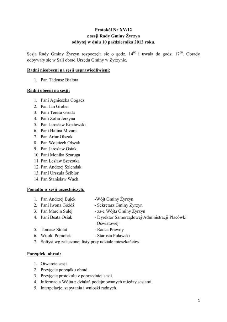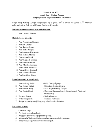 Protokół Nr XV/12 z sesji Rady Gminy Żyrzyn odbytej w dniu 10 października 2012 roku. Sesja Rady Gminy Żyrzyn rozpoczęła się o godz. 1400 i trwała do godz. 1700. Obrady odbywały się w Sali obrad Urzędu Gminy w Żyrzynie. Radni nieobecni na sesji usprawiedliwieni: 1. Pan Tadeusz Białota Radni obecni na sesji: 1. Pani Agnieszka Gogacz 2. Pan Jan Grobel 3. Pani Teresa Gruda 4. Pani Zofia Jerzyna 5. Pan Jarosław Kozłowski 6. Pani Halina Mizura 7. Pan Artur Olszak 8. Pan Wojciech Olszak 9. Pan Jarosław Osiak 10. Pani Monika Szaruga 11. Pan Lesław Szczotka 12. Pan Andrzej Szlendak 13. Pani Urszula Ścibior 14. Pan Stanisław Wach Ponadto w sesji uczestniczyli: 1. 2. 3. 4. Pan Andrzej Bujek Pani Iwona Góźdź Pan Marcin Sulej Pani Beata Osiak -Wójt Gminy Żyrzyn - Sekretarz Gminy Żyrzyn - za-c Wójta Gminy Żyrzyn - Dyrektor Samorządowej Administracji Placówki Oświatowej 5. Tomasz Stolat - Radca Prawny 6. Witold Popiołek - Starosta Puławski 7. Sołtysi wg załączonej listy przy udziale mieszkańców. Porządek obrad: 1. 2. 3. 4. 5. Otwarcie sesji. Przyjęcie porządku obrad. Przyjęcie protokołu z poprzedniej sesji. Informacja Wójta z działań podejmowanych między sesjami. Interpelacje, zapytania i wnioski radnych. 1 6. Podjęcie uchwały w sprawie zatwierdzenia do realizacji projektu „Edukacja Malucha” współfinansowanego z Europejskiego Funduszu Społecznego. - wprowadzenie do tematu Wójta Gminy Żyrzyn -opinia Komisji Budżetowej, Działalności Gospodarczej i Mienia Komunalnego. - dyskusja i podjęcie uchwały. 7. Podjęcie uchwały w sprawie zmian w uchwale budżetowej Gminy Żyrzyn na 2012 rok. - wprowadzenie do tematu Wójta Gminy Żyrzyn, - opinia Komisji Budżetowej, Działalności Gospodarczej i Mienia Komunalnego. - dyskusja i podjęcie uchwały. 8. Podjęcie uchwały w sprawie zmiany wieloletniej prognozy finansowej. - wprowadzenie do tematu Wójta Gminy Żyrzyn, - dyskusja i podjęcie uchwały. 9. Odpowiedzi na interpelacje, wnioski i zapytania radnych. 10. Sprawy różne i zakończenie sesji. Ad.1 Przewodniczący Pan Wojciech Olszak otworzył XV sesję Rady Gminy Żyrzyn. Na podstawie listy obecności stwierdził, że obecnych jest 14 radnych, w związku z czym rada jest władna do podejmowania prawomocnych uchwał. Na sesji nieobecny jest radny Pan Tadeusz Białota. Ad.2 Przewodniczący Wojciech Olszak- przypomniał, że porządek obrad został zawarty w zaproszeniach na sesję i zapytał o uwagi do tak zaproponowanego porządku obrad. Uwag do zaproponowanego porządku obrad nie było. Porządek obrad został przyjęty w głosowaniu jawnym jednomyślnie w obecności 14 radnych. Ad. 3 Przewodniczący Pan Wojciech Olszak przekazał, że protokół z poprzedniej sesji został sporządzony, zapoznał się z nim, podpisał nie wnosząc uwag, wnioskował o przyjęcie protokołu bez odczytywania. Innych wniosków nie było. Protokół bez odczytywania został przyjęty w głosowaniu jawnym, jednomyślnie , tj. „za”14, „przeciw”- 0, „wstrzymał się”- 0 Ad. 4 Pan Wójt Andrzej Bujek przedłożył informację z działań Wójta podejmowanych między sesjami od 29 sierpnia do 10 października 2012 roku. 2 Treść informacji stanowi załącznik do protokołu. Radny Pan Artur Olszak- zapytał, czy wiadomo jakie ma zamierzenia nabywca działki w Osinach. Pan Wójt Andrzej Bujek- poinformował, że do przetargu przystąpiło dwóch nabywców. Drugim nabywcą była firma, która zamierzała przenieść swoją siedzibę tłocznię gazu z Wronowa. W drodze licytacji firma ta przegrała. Wójt poinformował, że firma z Wronowa czyni starania o wykupienie części działki od Pana Krawczyka z przeznaczeniem na wybudowanie nowej siedziby. Co do zamierzeń Pana Krawczyka do tej działki są nieznane. Więcej pytań nie było. Ad. 5 Przewodniczący Rady Pan Wojciech Olszak- złożył wniosek o dokonanie pobrania próbek z dwóch nowych wykonywanych dróg, tj. z ulicy Ogrodowej i z ulicy Plebańskiej. Radny uważa, że wykonywana podbudowa tych dróg w dużej mierze odbiega od podstawowych norm. Przewodniczący Rady zwrócił uwagę, że na skrzyżowaniu dróg ul. Ogrodowej z ul. Tysiąclecia w Żyrzynie jest duże zaniżenie drogi. Radny powiedział, że w okresie zimowym, na tym skrzyżowaniu będzie gromadziła się woda i zamarzała, co może doprowadzić do poważnego wypadku. Rady Pan Wojciech Olszak ponadto zgłosił wniosek o wykonanie otworu odwadniającego przy kolektorze na ul. Tysiąclecia w Żyrzynie, ze względu na zalewanie prywatnych posesji mieszkańców przez wody opadowe. Radny Pan Stanisław Wach- zaproponował aby pobranie próbek rozszerzyć o ul. Polną w Żyrzynie. Radna Pani Teresa Gruda- powieliła wniosek skierowany do Pana Starosty Powiatu Puławskiego o wykonanie nowej nawierzchni asfaltowej na drodze powiatowej w Kotlinach. Radna Pani Monika Szaruga- przypomniała, że na poprzedniej sesji zgłaszała problem bezdomnych psów. Poinformowała, że do zakładu zgłaszała zabranie psa, który stwarza zagrożenie dla mieszkańców wsi Borysów. Dodała, że do tej pory nikt nie zabrał tego psa. Pani Monika Szaruga podziękowała Panu Staroście za wykonanie I etapu remontu drogi w Borysowie i poprosiła o wykonanie II etapu w przyszłym roku. Radny Pan Jarosław Osiak- podziękował, za położenie nawierzchni asfaltowej na łączniku Bałtów- Borysów. Radny Pan Jarosław Kozłowski- zapytał, kto ma nadzór nad chodnikiem w Żyrzynie, który położony jest przy ul. Powstania Styczniowego w stronę miejscowości Baranów. Radny zaznaczył, że chodnik jest w złym stanie technicznym, zasypany piachem i bardzo zarośnięty. 3 Ad. 6 Wprowadzenia do punktu 6 porządku obrad w sprawie zatwierdzenia do realizacji projektu „Edukacja malucha” współfinansowanego z Europejskiego Funduszu Społecznego dokonała Dyrektor SAPO Pani Beata Osiak. Poinformowała, że w sierpniu bieżącego roku został złożony projekt w imieniu Gm