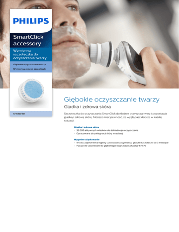 SmartClick accessory Wymienna szczoteczka do oczyszczania twarzy Głębokie oczyszczanie twarzy Wymienna główka szczoteczki Głębokie oczyszczanie twarzy Gładka i zdrowa skóra SH560/50 Szczoteczka do oczyszczania SmartClick dokładnie oczyszcza twarz i pozostawia gładką i zdrową skórę. Możesz mieć pewność, że wyglądasz dobrze w każdej sytuacji. Gładka i zdrowa skóra 32 000 aktywnych włosków do dokładnego oczyszczania Opracowana do pielęgnacji skóry wrażliwej Wygodne użytkowanie W celu zapewnienia higieny użytkowania wymieniaj główkę szczoteczki co 3 miesiące Pasuje do szczoteczki do głębokiego oczyszczania twarzy SH575 Wymienna szczoteczka do oczyszczania twarzy SH560/50 Zalety Dane techniczne 32 000 aktywnych włosków Wymieniaj główkę co 3 miesiące. Nasadka SmartClick W celu utrzymania higieny szczoteczki oczyszczającej wymieniaj główkę co 3 miesiące, nakładając nową wymienną główkę (SH560) na szczoteczkę do oczyszczania Do modelu: Shaver Series 9000 (S9xxx), Shaver Series 7000 (S7xxx), Shaver Series 5000 (S5xxx), AquaTouch (S5xxx), Szczoteczka do oczyszczania twarzy SH575 SmartClick. Pasuje do SH575 Łatwa obsługa Czyszczenie: Oczyść wodą i delikatnym 32 000 aktywnych włosków o średnicy 50 µm dociera nawet do najtrudniej dostępnych miejsc na twarzy, dokładnie je oczyszczając. Usuwają one zanieczyszczenia i martwe komórki skóry, co pobudza mikrocyrkulację, pozostawiając gładką w dotyku i zdrowo wyglądającą skórę. mydłem, Wysusz szczoteczkę ręcznikiem Konserwacja Wymień główkę szczoteczki: Co 3 miesiące na SH560 Pasuje do szczoteczki SmartClick z serii Shaver 7000 oraz szczoteczki do głębokiego Stworzona dla skóry wrażliwej Włosie o długości 14 mm ma wysoką elastyczność, dzięki czemu zapewnia mniejsze tarcie. Urządzenie jest odpowiednie do codziennego użytku. oczyszczania SH575. © 2016 Koninklijke Philips N.V. Wszelkie prawa zastrzeżone. Data wydania 2016‑07‑11 Wersja: 3.1.1 Dane techniczne mogą ulec zmianie bez powiadomienia. Znaki towarowe są własnością Koninklijke Philips N.V. lub własnością odpowiednich firm. EAN: 08 71010 37497 45 www.philips.com Akcesoria Konserwacja: Nasadka zabezpieczająca