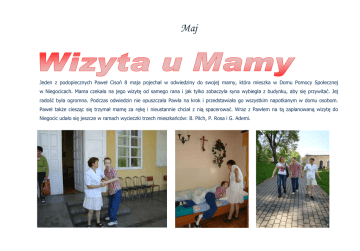 Maj Jeden z podopiecznych Paweł Cisoń 8 maja pojechał w odwiedziny do swojej mamy, która mieszka w Domu Pomocy Społecznej w Niegocicach. Mama czekała na jego wizytę od samego rana i jak tylko zobaczyła syna wybiegła z budynku, aby się przywitać. Jej radość była ogromna. Podczas odwiedzin nie opuszczała Pawła na krok i przedstawiała go wszystkim napotkanym w domu osobom. Paweł także ciesząc się trzymał mamę za rękę i nieustannie chciał z nią spacerować. Wraz z Pawłem na tą zaplanowaną wizytę do Niegocic udało się jeszcze w ramach wycieczki trzech mieszkańców: B. Pilch, P. Rosa i G. Ademi. 15 maja, korzystając z pięknej majowej pogody mieszkanki III Działu Opiekuńczo – Terapeutycznego „imprezowały” na świeżym powietrzu. W ogródku czas upływał na wspólnym grillowaniu, bujaniu na huśtawce, spacerach. Świętowały też 46 urodzin Kasi Jackowskiej. Po odśpiewaniu „Sto lat ”oraz zdmuchnięciu świeczek z urodzinowego tortu nastąpiła jego degustacja. Majówka zakończyła się obiadem w plenerze, który w takim otoczeniu smakował wyjątkowo. Wyjazd do Gospodarstwa Agroturystycznego „Ściborówka” 16.05.2013 Dzień od samego rana zapowiadał się bardzo dobrze, w powietrzu czuć było wiosnę w całej pełni. Wszyscy uczestnicy byli zachwyceni: pięknem, spokojem, swobodą. Gospodyni tradycyjnie obdarowała przybyszów: ciepłem, dobrem i pysznym jedzeniem. Gospodarstwo Agroturystyczne „Ściborówka” to azyl, miejsce wymarzone, specjalnie wybrane dla osób z bardzo dużym deficytem fizycznym. Uczestnicy i personel: J. Łyko – B. Furtak, W. Siudek – M. Pyzik K. Łyko – S. Urych, G. Szczepara – M. Sobańska M. Warzecha – A. Matoga, Sz. Maślanka – I. Gierak W dniu 22 maja 2013 roku z rąk biskupa Damiana Muskusa nasi mieszkańcy przyjęli sakrament Bierzmowania w kościele oo. Dominikanów w Krakowie. Przez cały rok grupę naszych mieszkańców przygotowywali wolontariusze i ojciec Tomasz w ramach katechez prowadzonych przez DA Beczka . Serdeczne podziękowania dla wszystkich, którzy przyczynili się do przygotowania tego pięknego dnia. Sakrament Bierzmowania przyjęli: 1. ADEMI GRZEGORZ – ŚWIADEK: RENATA WERZACHA 2. BUCZEK BARTŁOMIEJ – ŚWIADEK: SEBASTIAN BUCZEK 3. MACHAŁ MONIKA – ŚWIADEK: KORZEB MARIA 4. PILCH MARCIN – ŚWIADEK: NATALIA PILCH 5. KOWALSKA PATRYCJA- ŚWIADEK: WCISŁO BARBARA 6. PIENIĄŻEK ZOFIA – ŚWIADEK: KIRYLUK BEATA 7. ROSA PIOTR – ŚWIADEK: BOGDAN ROSA 8. JAKUBOWSKI MARCIN – ŚWIADEK: WÓJTOWICZ AGATA 9. GĄSIENICA – KOTELNICKA MARTYNA – ŚWIADEK: MAJEWSKA MAGDALENA W auli bł. Jakuba 22.05.2013 odbył się koncert kwartetu smyczkowego. Capella Cracoviensis przedstawiła utwory Luigi Bocchieriniego. To włoski kompozytor i wiolonczelista epoki klasycyzmu i rokoko. Na początku przedstawiono życiorys artysty wraz z anegdotą: „ Pan Bóg, żeby się z nami porozumieć zrobiłby to za pomocą muzyki Haydna, ale gdyby sam chciał posłuchać muzyki słuchałby Bocchieriniego”. Joanna Kryus, Renata Szymczyk wraz z opieką: S. Urych i M. Płonką z przyjemnością wysłuchały tego koncertu. Pozytywnych wrażeń nie zmył nawet letni deszcz, który podał po koncercie. Czerwiec W tym roku I Dział OT przygotowywał przedstawienie dla mieszkańców i personelu naszego Domu ora zaproszonych gości, z okazji Dnia Dziecka. W przygotowania zaangażowali się wszyscy pracownicy. Terapeutki przygotowały muzykę i dekorację, wybrały scenariusz z wielu innych zabawnych parodii bajek. Nasz scenariusz zmieniał się i dojrzewał, a ostateczna wersja znacznie różniła się od oryginału, bo każdy aktor miał pomysł na swoją rolę. Próby były tylko trzy, ale ekipa biorąca w nich udział była tak zdyscyplinowana, że nie potrzebowaliśmy więcej. Stroje wyszperaliśmy z naszych szaf a część pożyczyliśmy od znajomych i z wypożyczalni Teatru Ludowego. Przedstawienie pt. „Królewicz z ziarnkiem grochu” zakończyliśmy tańcem grupowym do piosenki zespołu Weekend, zaaranżowanym przez naszą zdolną koleżankę Angelę Matogę. Nad całością przedstawienia czuwała nasza kierownik, która wspierała nas i pomagała dopiąć wszystko na ostatni guzik. Zarówno na próbach, jak i na przedstawieniu bawiliśmy się świetnie i mamy nadzieję, że widzowie też mieli niezłą zabawę. Na pikniku wystąpił także chór uczniów ze szkoły specjalnej przy ulicy Zamoyskiego. Zaproszeni animatorzy zrobili pokaz baniek mydlanych oraz malowanie twarzy. Konkurs na najlepsze przebranie wśród mieszkańców i personelu dostarczył wielu emocji. Cały piknik uświetnił pokaz mody przygotowany przez mieszkańców V i VI OT. W dniach 4-6 czerwca grupa naszych mieszkańców z IV i VI działu opiekuńczo – terapeutycznego była na wycieczce w Koszęcinie. Inicjatorem i kierownikiem całej wyprawy był Sławomir Langer który pochodzi z tej miejscowości. Dział VI reprezentowali Andrzej Augustynek, Daniel Dec, Michał Król, Mariusz Pluciński, Piotr Popielak i Kamil Ziętara. Z działu VI w wycieczce uczestniczyli Krzysztof i Tomasz Dudek, Miłosz Jania, Krystian Korona, Robert Maniak Marek Migdziński, Marcin Pietras, Paweł Piper, Piotr Sobolewski. Towarzyszyli im Mariusz Baliński, Agnieszka Bucka, Iwona Czech, Marek Flak, Gabrysia Jagieła, Paweł Pałosz, Szczepan Ślęczka, Agata Wróbel i Sławomir Tanger (który był kierownikiem, opiekunem i kierowcą w 1 osobie). Opiekę medyczną sprawowała pielęgniarka Maria Wrzesień. Koszęcin to nieduże miasteczko na ziemi śląskiej. Zakwaterowani Sportowo byliśmy w Gminnym Rekreacyjnym na peryferiach Mieszkaliśmy w domkach Ośrodku miasta. kempingowych nad jeziorem, w sosnowym lesie. Wyjątkowo bogaty mieliśmy dzień drugi. Rano zwiedzaliśmy siedzibę zespołu pieśni i tańca „Śląsk”. Obejrzeliśmy, krótki film z koncertu Jubileuszowego, a pani przewodniczka opowiadała nam o tańcach ludowych. Później udaliś