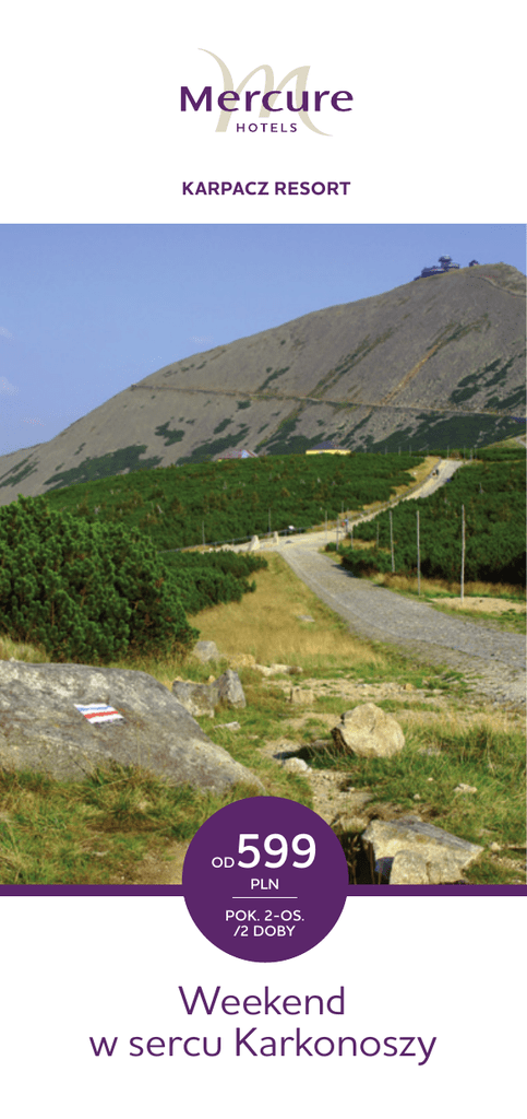 KARPACZ RESORT OD 599 PLN POK. 2-OS. /2 DOBY Weekend w sercu Karkonoszy Weekend w sercu Karkonoszy Szukasz pomysłu na weekend za miastem? Komfortowe warunki, serdeczna atmosfera i atrakcje dla całej rodziny, a wszystko to w przepięknej górskiej scenerii w Hotelu Mercure Karpacz Resort. NA DOBRY POCZĄTEK ›› Zakwaterowanie na 2 noce w przytulnym i komfortowym pokoju ›› Powitalna kolacja w dniu przyjazdu ›› Obfite śniadanie każdego poranka ›› Opłata za parking wliczona w cenę pobytu DLA CENIĄCYCH AKTYWNY WYPOCZYNEK W SOBOTĘ ›› O poranku - rozbudzający Aqua Aerobic ›› W południe - poprawiający kondycję Nordic Walking ›› Wodne animacje dla dzieci w Centrum Wellness & Fitness Oferta obowiązuje w terminie od 02.01.2014 do 21.12.2014 r. Pobyt dzieci do lat 14-stu w pokoju z rodzicami wliczony w cenę. Dopłata do wyżywienia: dzieci do lat 4 – wyżywienie wliczone w cenę, dzieci w wieku 4-14 lat – 69,00 PLN/dziecko/pobyt z 2 noclegami. Cena pokoju jednoosobowego – 458,80 PLN. Cena pokoju dla 3 osób powyżej 14 roku życia – 841,20 PLN. HOTEL MERCURE KARPACZ RESORT UL. OBROŃCÓW POKOJU 5, 58-540 KARPACZ TEL.: +48 75 752 70 37 | +48 75 752 70 38 E-mail: [email protected] mercure.com | Ponad 700 hoteli w 50 krajach infolinia 801 606 606