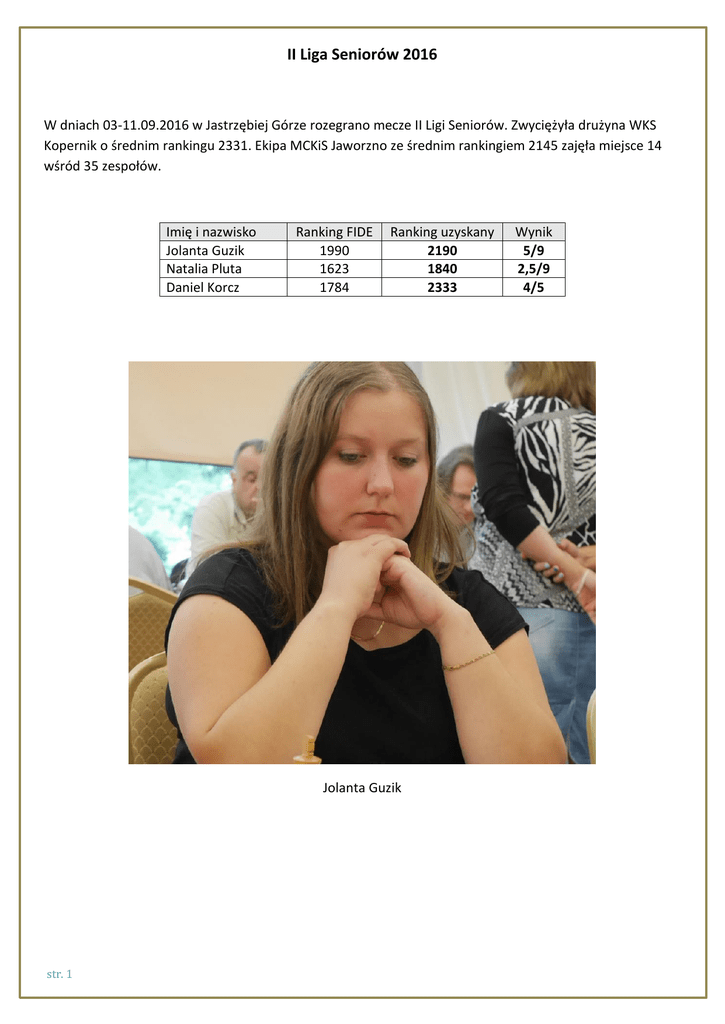 II Liga Seniorów 2016 W dniach 03-11.09.2016 w Jastrzębiej Górze rozegrano mecze II Ligi Seniorów. Zwyciężyła drużyna WKS Kopernik o średnim rankingu 2331. Ekipa MCKiS Jaworzno ze średnim rankingiem 2145 zajęła miejsce 14 wśród 35 zespołów. Imię i nazwisko Jolanta Guzik Natalia Pluta Daniel Korcz Ranking FIDE 1990 1623 1784 Ranking uzyskany 2190 1840 2333 Jolanta Guzik str. 1 Wynik 5/9 2,5/9 4/5 Natalia Pluta Daniel Korcz str. 2