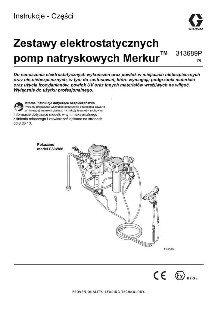 Instrukcje - Części Zestawy elektrostatycznych pomp natryskowych Merkur™ 313689P PL Do nanoszenia elektrostatycznych wykończeń oraz powłok w miejscach niebezpiecznych oraz nie-niebezpiecznych, w tym do zastosowań, które wymagają podgrzania materiału oraz użycia izocyjanianów, powłok UV oraz innych materiałów wrażliwych na wilgoć. Wyłącznie do użytku profesjonalnego. . Istotne instrukcje dotyczące bezpieczeństwa Prosimy przeczytać wszystkie ostrzeżenia i zalecenia zawarte w niniejszej instrukcji obsługi. Instrukcję tę należy zachować. Informacje dotyczące modeli, w tym maksymalnego ciśnienia roboczego i zatwierdzeń opisano na stronach od 8 do 13. Pokazano model G30W86 ti13209c II 2 G c Spis treści Powiązane instrukcje obsługi . . . . . . . . . . . . . . . . 3 Ostrzeżenia . . . . . . . . . . . . . . . . . . . . . . . . . . . . . . . 4 Ważne informacje o materiałach dwus kładnikowych . . . . . . . . . . . . . . . . . . . . . . . . . . 7 Informacje o stosowaniu izocyjanianu . . . . . . . . 7 Samozapłon materiałów . . . . . . . . . . . . . . . . . . . 7 Składniki A i B należy przechowywać oddzielnie 7 Wrażliwość izocyjanianów na wilgoć . . . . . . . . . . 7 Wymiana materiałów . . . . . . . . . . . . . . . . . . . . . . 7 Modele . . . . . . . . . . . . . . . . . . . . . . . . . . . . . . . . . . . 8 Zatwierdzenia agencyjne . . . . . . . . . . . . . . . . . . 9 Zestawy Merkur 15:1, temperatura otoczenia (G15Wxx i G15Cxx) . . . . . . . . . . . . . . . . . . . 9 Zestawy pomp miechowych Merkur 15:1, temperatura otoczenia (G15Bxx) . . . . . . . . 10 Zestawy Merkur 18:1, temperatura otoczenia (G18Wxx i G18Cxx) . . . . . . . . . . . . . . . . . . 10 Zestawy Merkur 18:1, podgrzewane (G18Wxx) . . . . . . . . . . . . . . . . . . . . . . . . . . 10 Zestawy Merkur 23:1, temperatura otoczenia (G23Wxx i G23Cxx) . . . . . . . . . . . . . . . . . . 11 Zestawy pomp miechowych Merkur 23:1, temperatura otoczenia (G23Bxx) . . . . . . . . 11 Zestawy Merkur 24:1, temperatura otoczenia (G24Wxx i G24Cxx) . . . . . . . . . . . . . . . . . . 11 Zestawy pomp miechowych Merkur 24:1, temperatura otoczenia (G24Bxx) . . . . . . . . 12 Zestawy Merkur 28:1, temperatura otoczenia (G28Wxx i G28Cxx) . . . . . . . . . . . . . . . . . . 12 Zestawy Merkur 28:1, podgrzewane (G28Wxx i G28Cxx) . . . . . . . . . . . . . . . . . . 12 Zestawy Merkur 30:1, temperatura powietrza (G30Wxx i G30Cxx) . . . . . . . . . . . . . . . . . . 13 Zestawy Merkur 30:1, podgrzewane (G30Wxx i G30Cxx) . . . . . . . . . . . . . . . . . . 13 Zestawy pomp miechowych Merkur 35:1, temperatura otoczenia (G35Bxx) . . . . . . . . 13 Montaż . . . . . . . . . . . . . . . . . . . . . . . . . . . . . . . . . . 14 Informacje ogólne . . . . . . . . . . . . . . . . . . . . . . . 16 Przeszkolenie operatora . . . . . . . . . . . . . . . . . . 16 Przygotowanie miejsca . . . . . . . . . . . . . . . . . . . 16 Montaż pompy . . . . . . . . . . . . . . . . . . . . . . . . . 16 Wentylowanie komory natryskowej . . . . . . . . . . 17 Części . . . . . . . . . . . . . . . . . . . . . . . . . . . . . . . . 17 Uziemienie . . . . . . . . . . . . . . . . . . . . . . . . . . . . 18 Konfiguracja . . . . . . . . . . . . . . . . . . . . . . . . . . . 19 Eksploatacja . . . . . . . . . . . . . . . . . . . . . . . . . . . . . . 21 Procedura usuwania nadmiaru ciśnienia . . . . . 21 Przepłukanie przed pierwszym użyciem . . . . . . 21 Blokada spustu . . . . . . . . . . . . . . . . . . . . . . . . . 21 Naczynie Wet Cup . . . . . . . . . . . . . . . . . . . . . . 22 Zalewanie pompy . . . . . . . . . . . . . . . . . . . . . . . 22 2 Instalacja dyszy natryskowej . . . . . . . . . . . . . . . 23 Regulacja rozpylania . . . . . . . . . . . . . . . . . . . . . 23 Regulacja wzoru rozpylania . . . . . . . . . . . . . . . . 24 Wyłączenie . . . . . . . . . . . . . . . . . . . . . . . . . . . . 24 Konserwacja . . . . . . . . . . . . . . . . . . . . . . . . . . . . . . 25 Harmonogram przeglądów okresowych . . . . . . 25 Dokręcanie połączeń gwintowanych . . . . . . . . . 25 Przepłukiwanie pompy . . . . . . . . . . . . . . . . . . . . 25 Naczynie Wet Cup . . . . . . . . . . . . . . . . . . . . . . . 25 Rozwiązywanie problemów . . . . . . . . . . . . . . . . . . 26 Elementy sterowania i wskaźniki DataTrak . . . . . 27 Obsługa DataTrak . . . . . . . . . . . . . . . . . . . . . . . . . 28 Tryb konfiguracji . . . . . . . . . . . . . . . . . . . . . . . . 28 Tryb pracy . . . . . . . . . . . . . . . . . . . . . . . . . . . . . 28 Wymiana baterii lub bezpiecznika DataTrak . . . 31 Części . . . . . . . . . . . . . . . . . . . . . . . . . . . . . . . . . . . 33 Modele w temperaturze otoczenia, do montażu na wózku lub ściennego . . . . . . . . . . . . . . . 33 Pompy miechowe, montaż na wózku . . . . . . . . 34 Modele podgrzewane, do montażu na wózku lub ściennego . . . . . . . . . . . . . . . . . . . . . . . 36 Modele podgrzewane (kontynuacja) . . . . . . . . . 38 Zestawy . . . . . . . . . . . . . . . . . . . . . . . . . . . . . . . . . . 39 Zestaw do montażu ściennego 24A578 (nie do pomp miechowych) . . . . . . . . . . . . . 39 Zestaw do montażu na wózku 256427 (nie pomp miechowych) . . . . . . . . . . . . . . . 39 Zestaw do montażu na wózku pomp miechowych 24E879 . . . . . . . . . . . . . . . . . . 40 Zestaw montażowy regulatora powietrza pomp miechowych . . . . . . . . . . . . . . . . . . . 40 Zestawy panelu sterowania pompy i pistoletu . . 41 Zestaw do montażu regulatora powietrza (nie do pomp miechowych) . . . . . . . . . . . . . 42 Zestawy węża ssącego 19-litrowego (5-galonowego) . . . . . . . . . . . . . . . . . . . . . . 42 Zestawy węża ssącego 208,2-litrowego (55-galonowego) . . . . . . . . . . . . . . . . . . . . . 42 Zestawy węża ssącego PTFE . . . . . . . . . . . . . . 42 DataTrak . . . . . . . . . . . . . . . . . . . . . . . . . . . . . . 42 Zestaw zaworu spustowego 256425 . . . . . . . . . 42 Zestaw komory pr