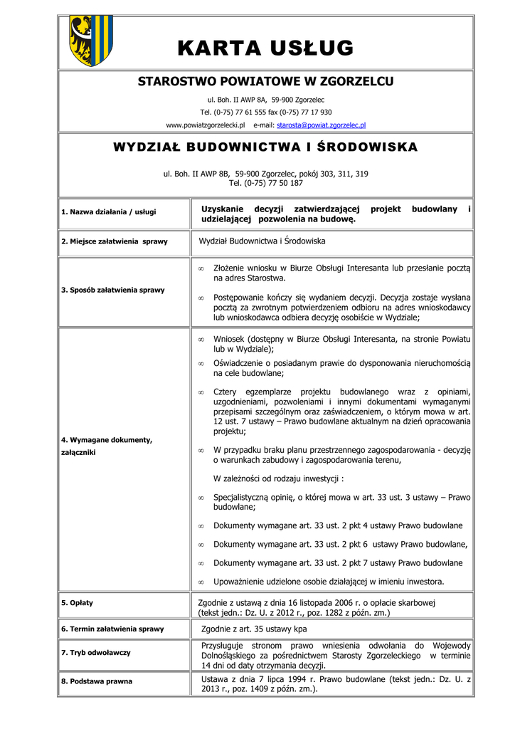 KARTA USŁUG STAROSTWO POWIATOWE W ZGORZELCU ul. Boh. II AWP 8A, 59-900 Zgorzelec Tel. (0-75) 77 61 555 fax (0-75) 77 17 930 www.powiatzgorzelecki.pl e-mail: [email protected] WYDZIAŁ BUDOWNICTWA I ŚRODOWISKA ul. Boh. II AWP 8B, 59-900 Zgorzelec, pokój 303, 311, 319 Tel. (0-75) 77 50 187 1. Nazwa działania / usługi 2. Miejsce załatwienia sprawy 3. Sposób załatwienia sprawy Uzyskanie decyzji zatwierdzającej udzielającej pozwolenia na budowę. projekt budowlany i Wydział Budownictwa i Środowiska • Złożenie wniosku w Biurze Obsługi Interesanta lub przesłanie pocztą na adres Starostwa. • Postępowanie kończy się wydaniem decyzji. Decyzja zostaje wysłana pocztą za zwrotnym potwierdzeniem odbioru na adres wnioskodawcy lub wnioskodawca odbiera decyzję osobiście w Wydziale; • Wniosek (dostępny w Biurze Obsługi Interesanta, na stronie Powiatu lub w Wydziale); • Oświadczenie o posiadanym prawie do dysponowania nieruchomością na cele budowlane; • Cztery egzemplarze projektu budowlanego wraz z opiniami, uzgodnieniami, pozwoleniami i innymi dokumentami wymaganymi przepisami szczególnym oraz zaświadczeniem, o którym mowa w art. 12 ust. 7 ustawy – Prawo budowlane aktualnym na dzień opracowania projektu; • W przypadku braku planu przestrzennego zagospodarowania - decyzję o warunkach zabudowy i zagospodarowania terenu, 4. Wymagane dokumenty, załączniki W zależności od rodzaju inwestycji : 5. Opłaty • Specjalistyczną opinię, o której mowa w art. 33 ust. 3 ustawy – Prawo budowlane; • Dokumenty wymagane art. 33 ust. 2 pkt 4 ustawy Prawo budowlane • Dokumenty wymagane art. 33 ust. 2 pkt 6 ustawy Prawo budowlane, • Dokumenty wymagane art. 33 ust. 2 pkt 7 ustawy Prawo budowlane • Upoważnienie udzielone osobie działającej w imieniu inwestora. Zgodnie z ustawą z dnia 16 listopada 2006 r. o opłacie skarbowej (tekst jedn.: Dz. U. z 2012 r., poz. 1282 z późn. zm.) 6. Termin załatwienia sprawy Zgodnie z art. 35 ustawy kpa 7. Tryb odwoławczy Przysługuje stronom prawo wniesienia odwołania do Wojewody Dolnośląskiego za pośrednictwem Starosty Zgorzeleckiego w terminie 14 dni od daty otrzymania decyzji. 8. Podstawa prawna Ustawa z dnia 7 lipca 1994 r. Prawo budowlane (tekst jedn.: Dz. U. z 2013 r., poz. 1409 z późn. zm.).
